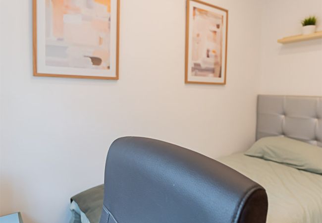 Habitación 4–La Paz: Habitación con vistas, dentro de la vivienda Hogar de Belén, alquiler Temporal Situada en la primera planta, cuenta con todas las comodidades que todo estudiante puede demandar. Desde la cama con un colchón premium, canapé con gran almacenaje, escritorio + silla, hasta smart TV, climatización, caja fuerte, plancha+tabla, cargador inalámbrico, cerradura inteligente, 2 juegos de toallas y sábanas.