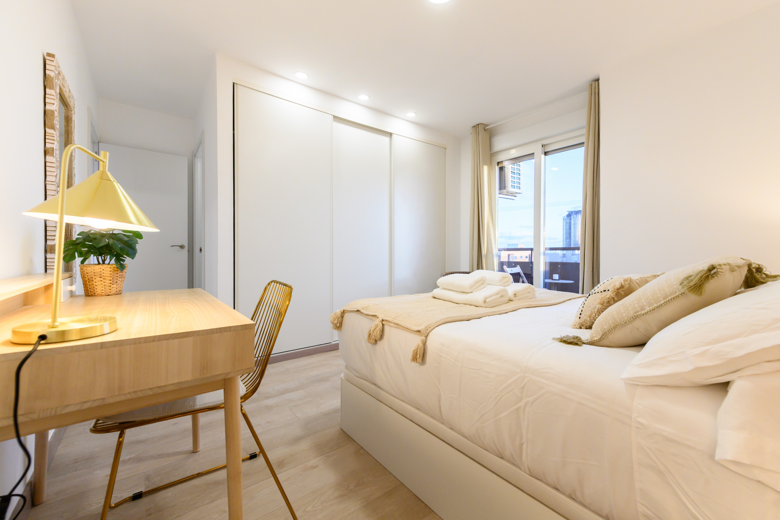 • Segundo dormitorio con cama de matrimonio, escritorio, mesitas de noche, amplio armario empotrado, espejo, aire acondicionado, terraza privada con mesa, sillas y hermosas vistas a la ciudad. Y dentro baño propio completo, con WC, ducha, espejo y espacio de almacenamiento.