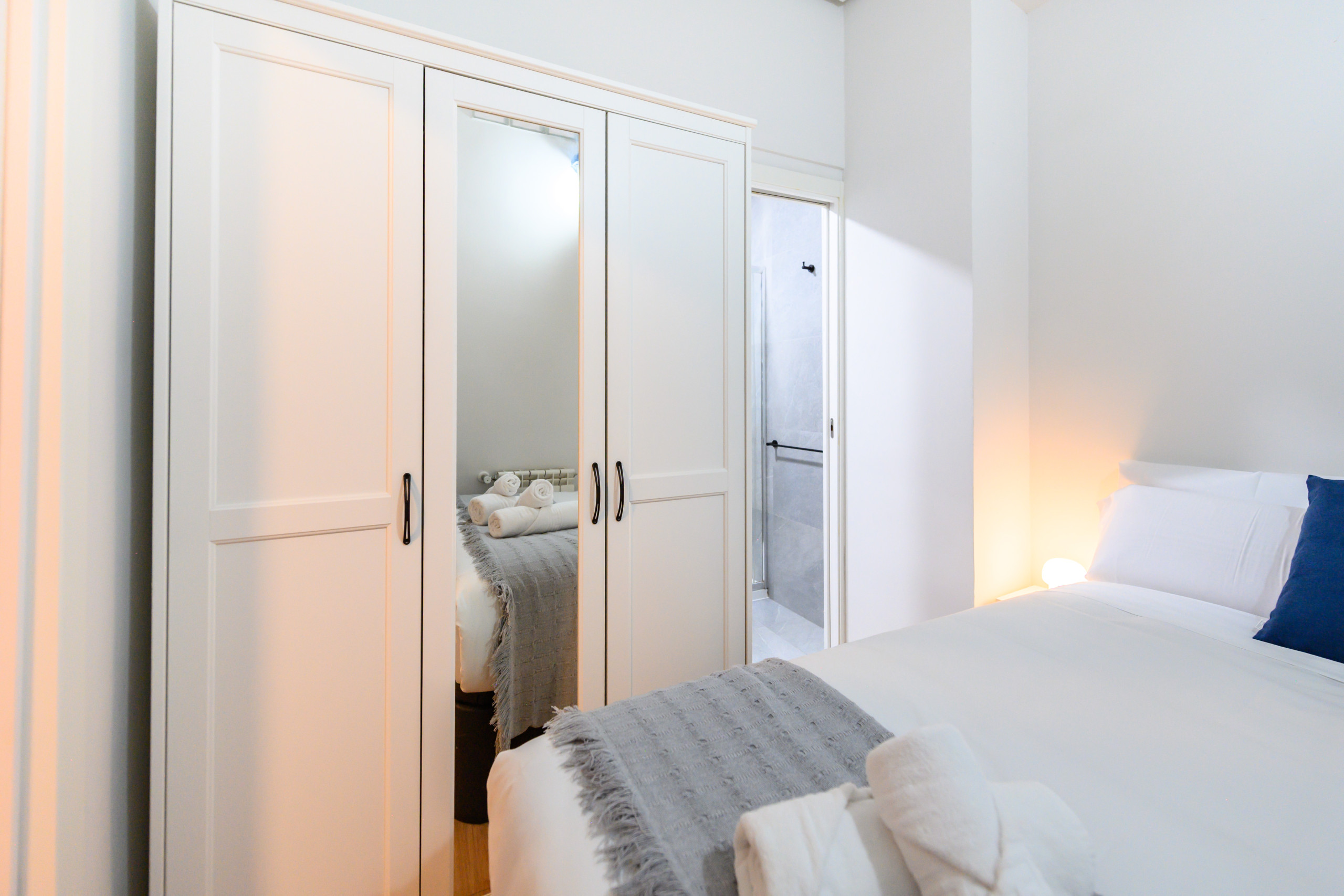 La vivienda cuenta con dos dormitorios, diseñada para ofrecer el máximo confort. El dormitorio principal está equipado con una cómoda cama matrimonial, mientras que el segundo dormitorio dispone de una cama individual, perfecta para una persona o incluso como espacio de trabajo adicional. Ambos dormitorios están decorados con un estilo contemporáneo, con armarios que garantizan un ambiente ordenado y práctico.