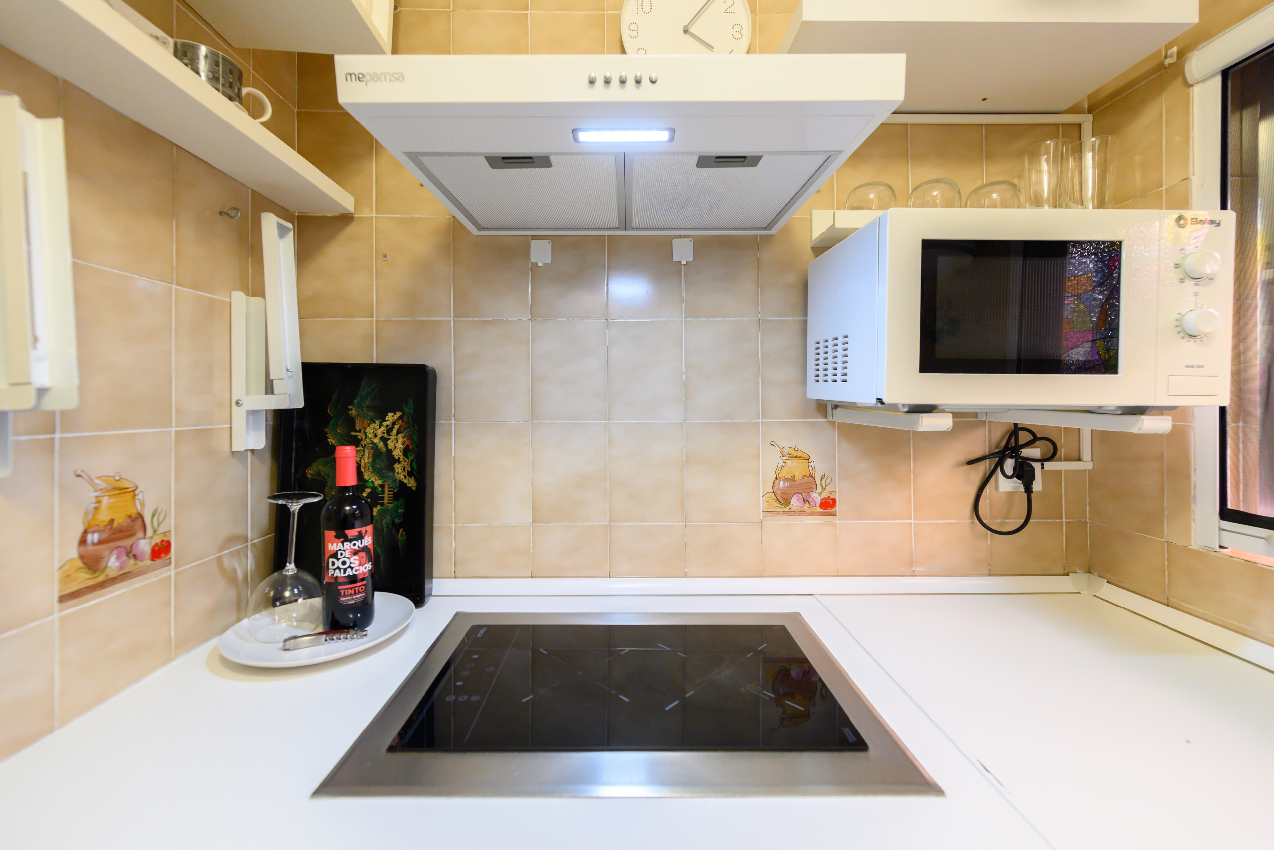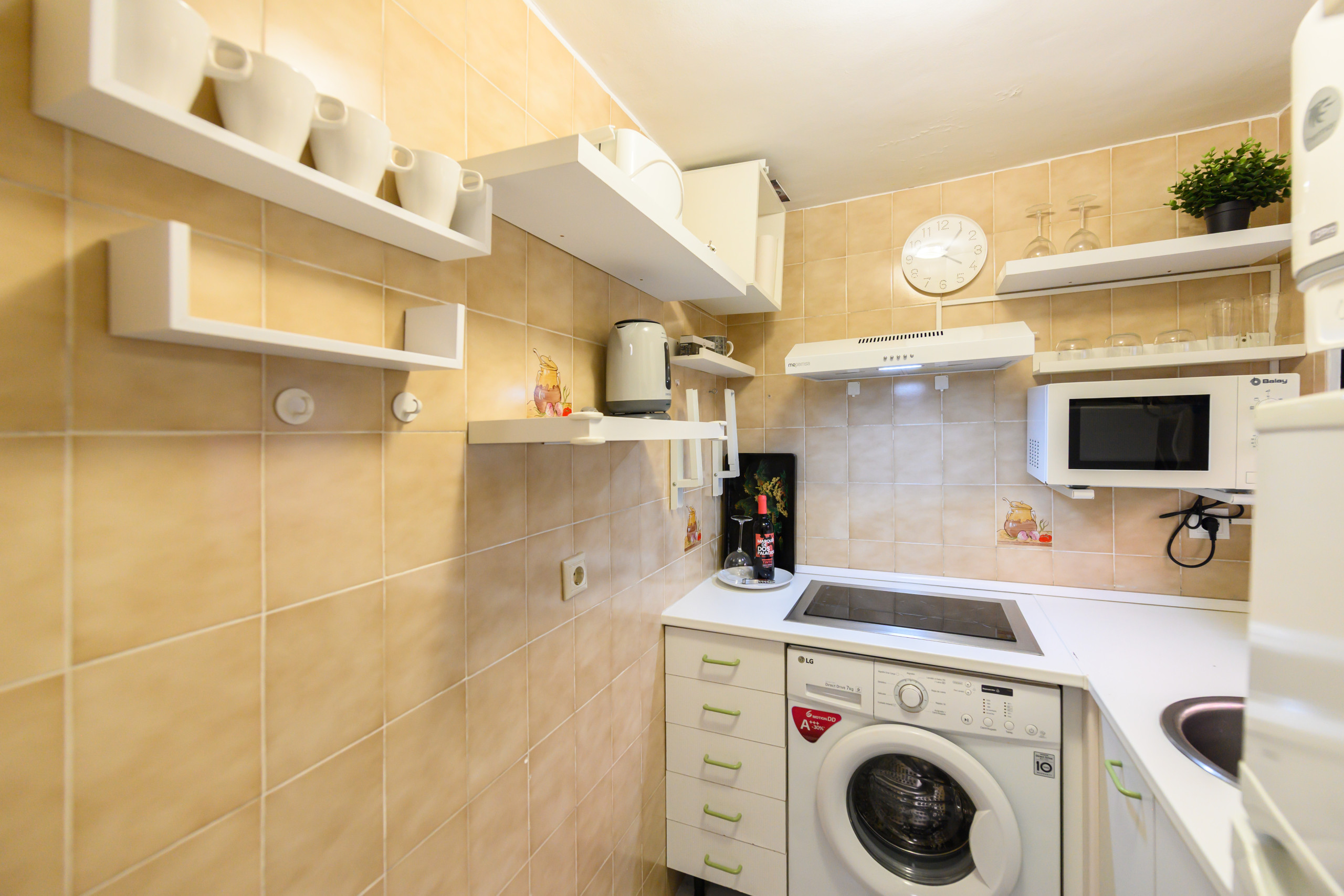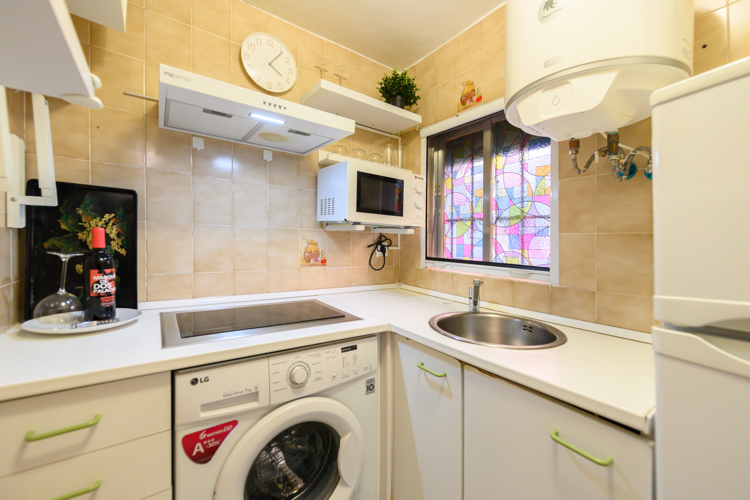 La cocina es independiente y está totalmente equipada con nevera, microondas, lavadora y utensilios de cocina, pensada para cubrir todas las necesidades del día a día durante la estancia.