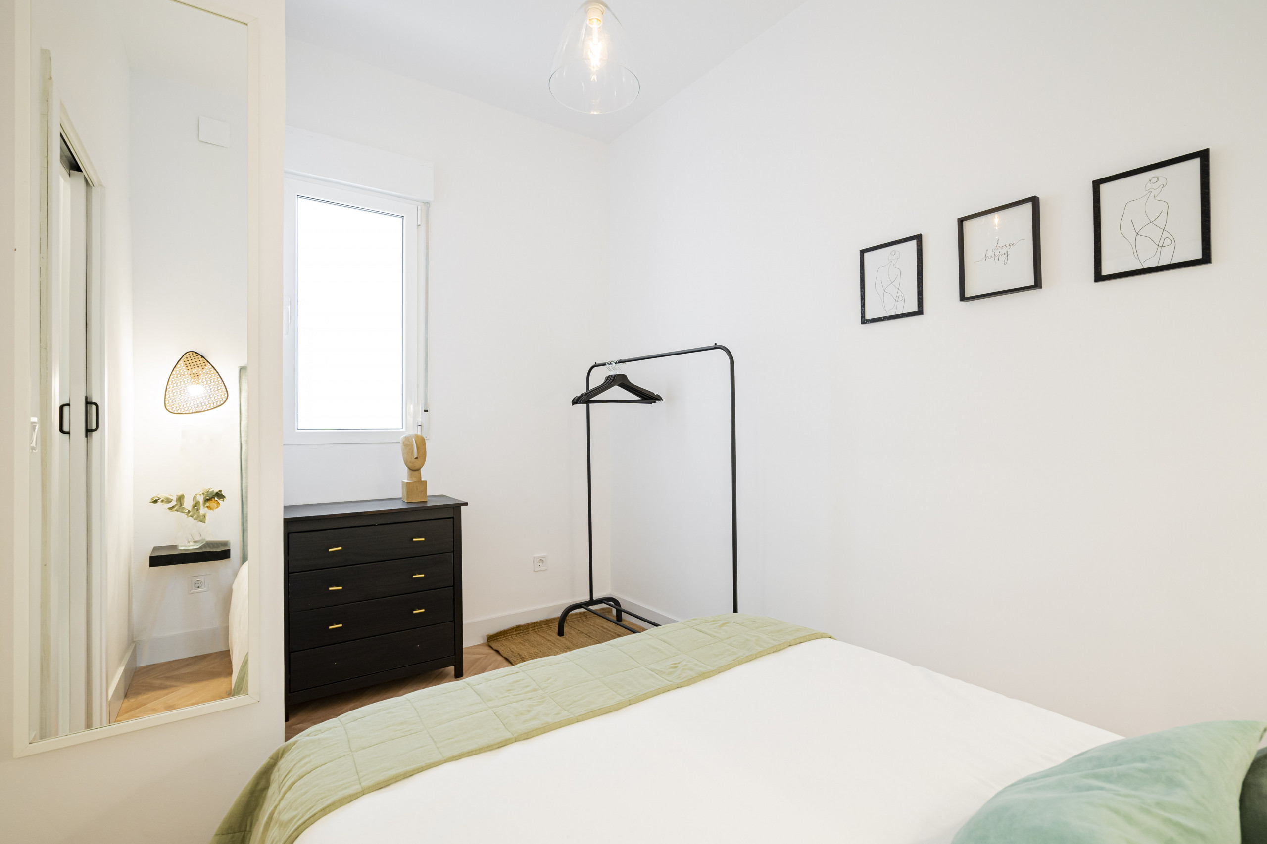 El dormitorio dispone de una cama de matrimonio, y suficiente espacio para guardar equipaje. Tanto la habitación como el salón cuentan con luz natura, pero a la vez hacen que el descanso no sea interrumpido por el ruido de las calles transitadas de Madrid.