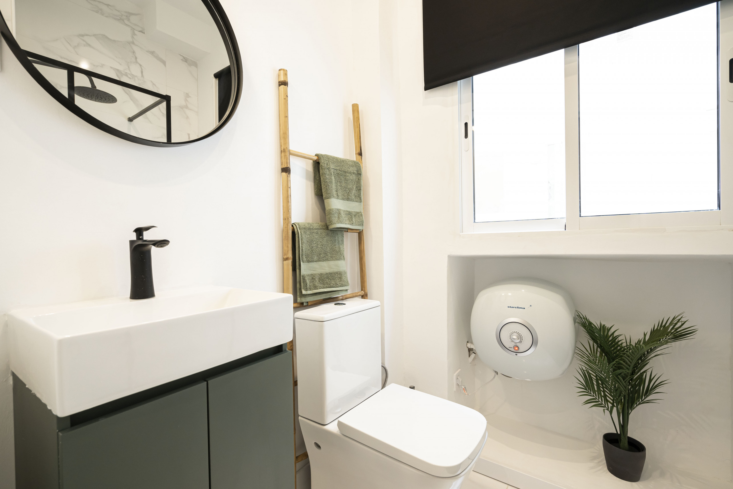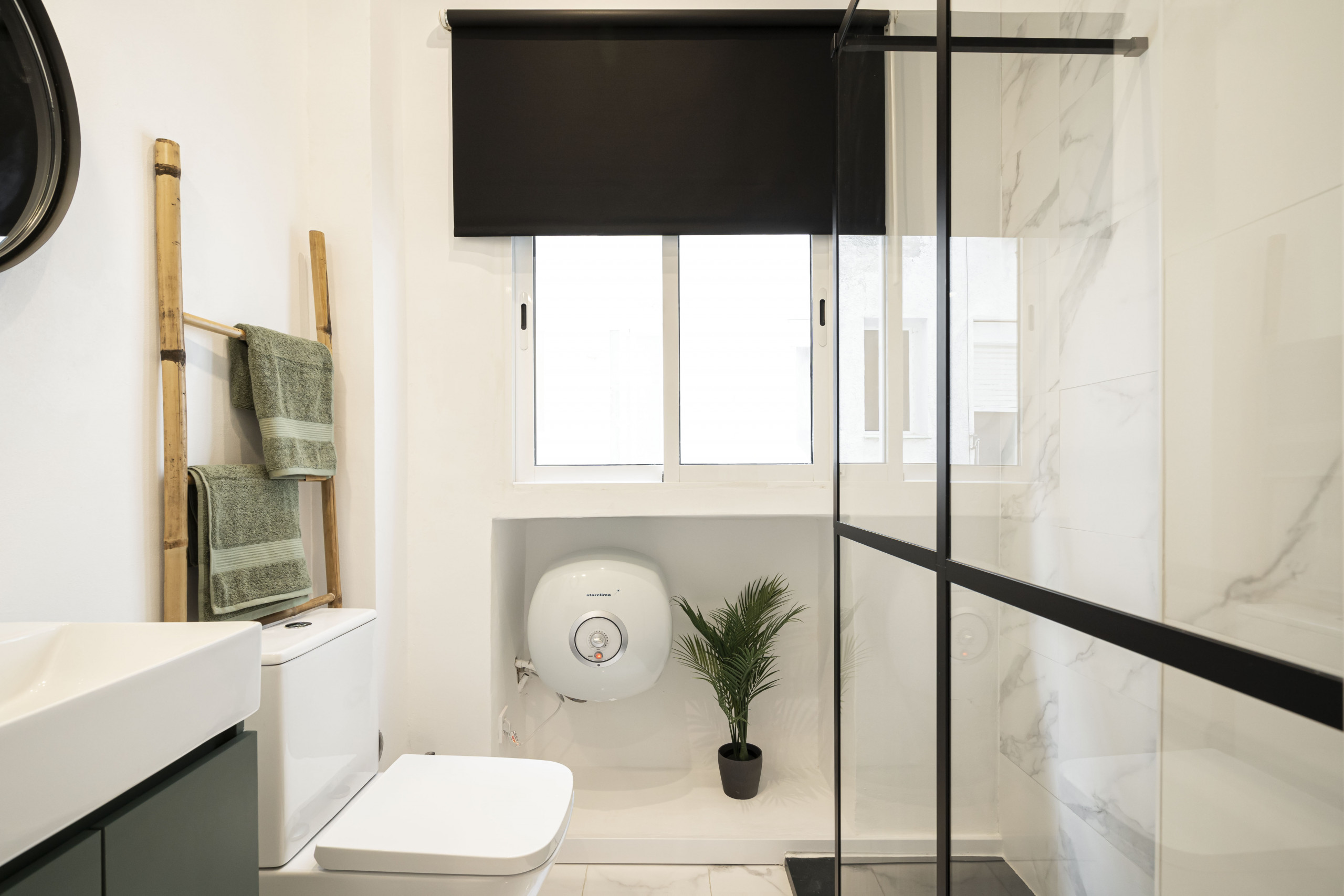 - El baño es luminoso y moderno, equipado con un plato de ducha que ofrece una experiencia refrescante. Sus acabados de alta calidad y su diseño eficiente garantizan que tengas todo lo que necesitas en un entorno elegante y funcional.
