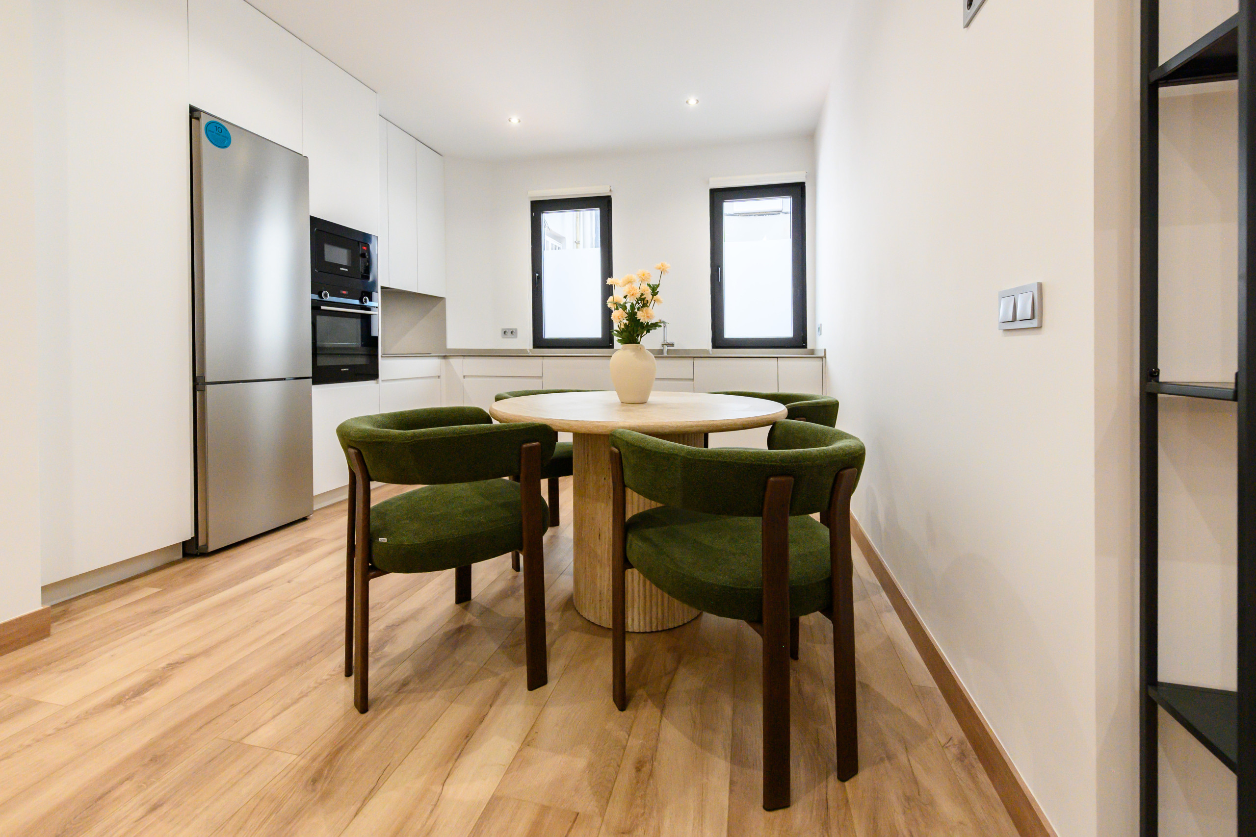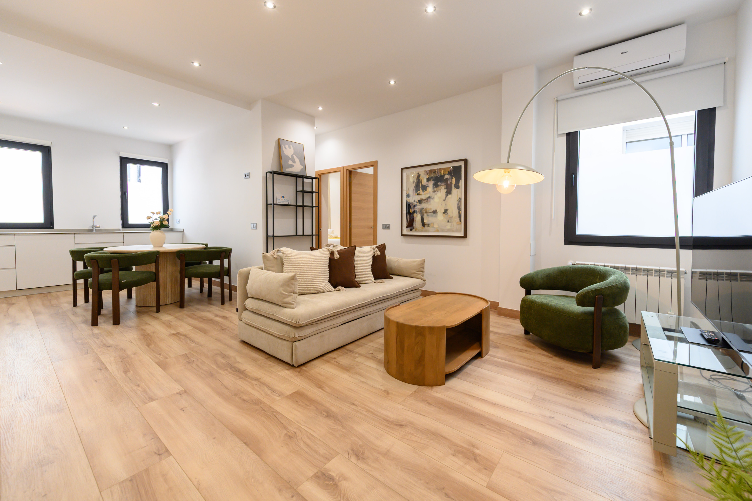 El corazón de este piso es su salón-comedor, con una sofá cama doble para invitados y una mesa en para desayunar o trabajar, la cocina abierta, creando un ambiente acogedor. Este espacio ha sido diseñado para ofrecer un área perfecta tanto para el descanso como para compartir momentos con familiares y amigos. La cocina está completamente equipada con electrodomésticos y los utensilios esenciales, brindando todo lo necesario para preparar desde una cena sencilla hasta un menú más elaborado.