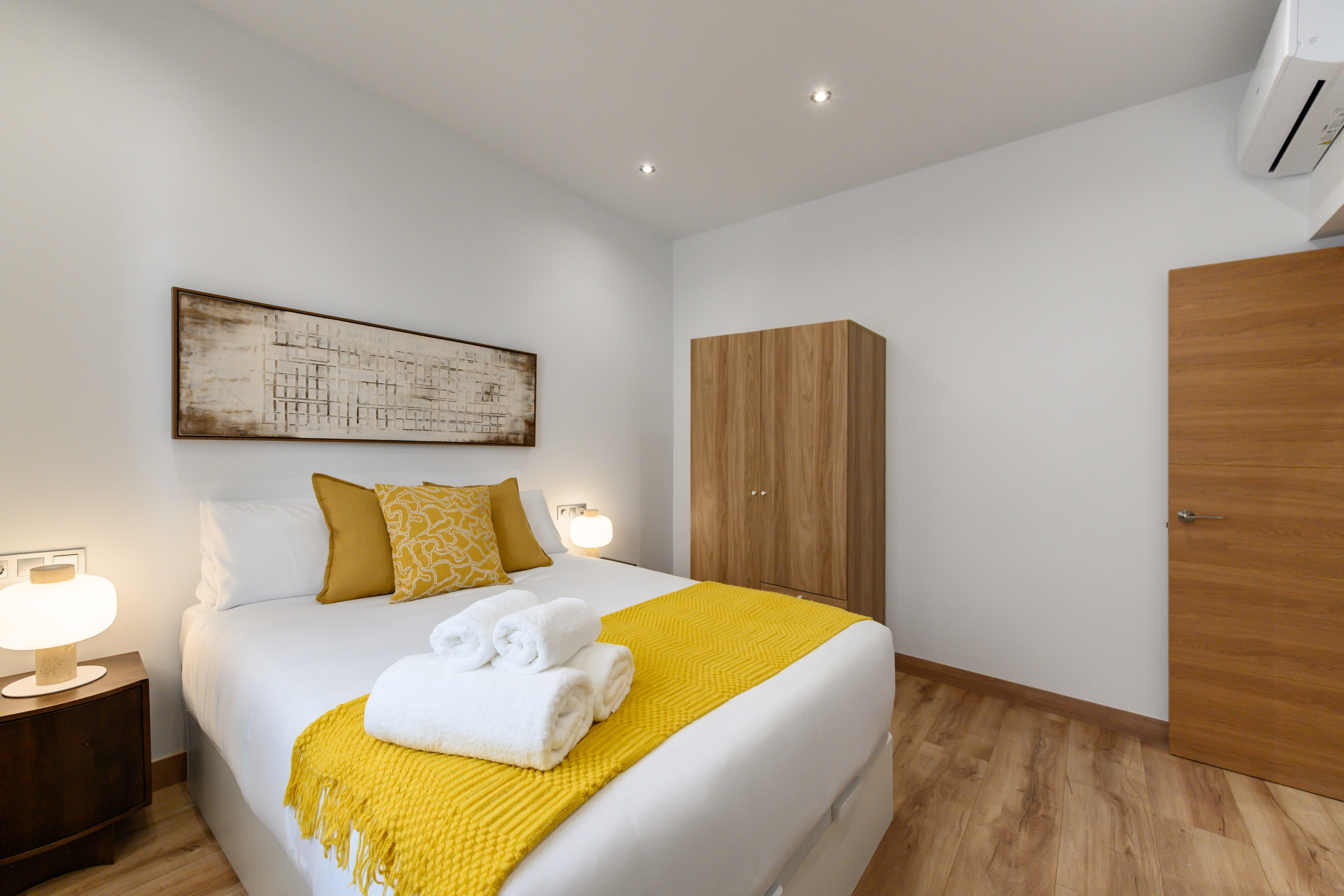 • Primer dormitorio, con cama doble con canapé, mesitas de noche, armario, aire acondicionado y calefacción.
