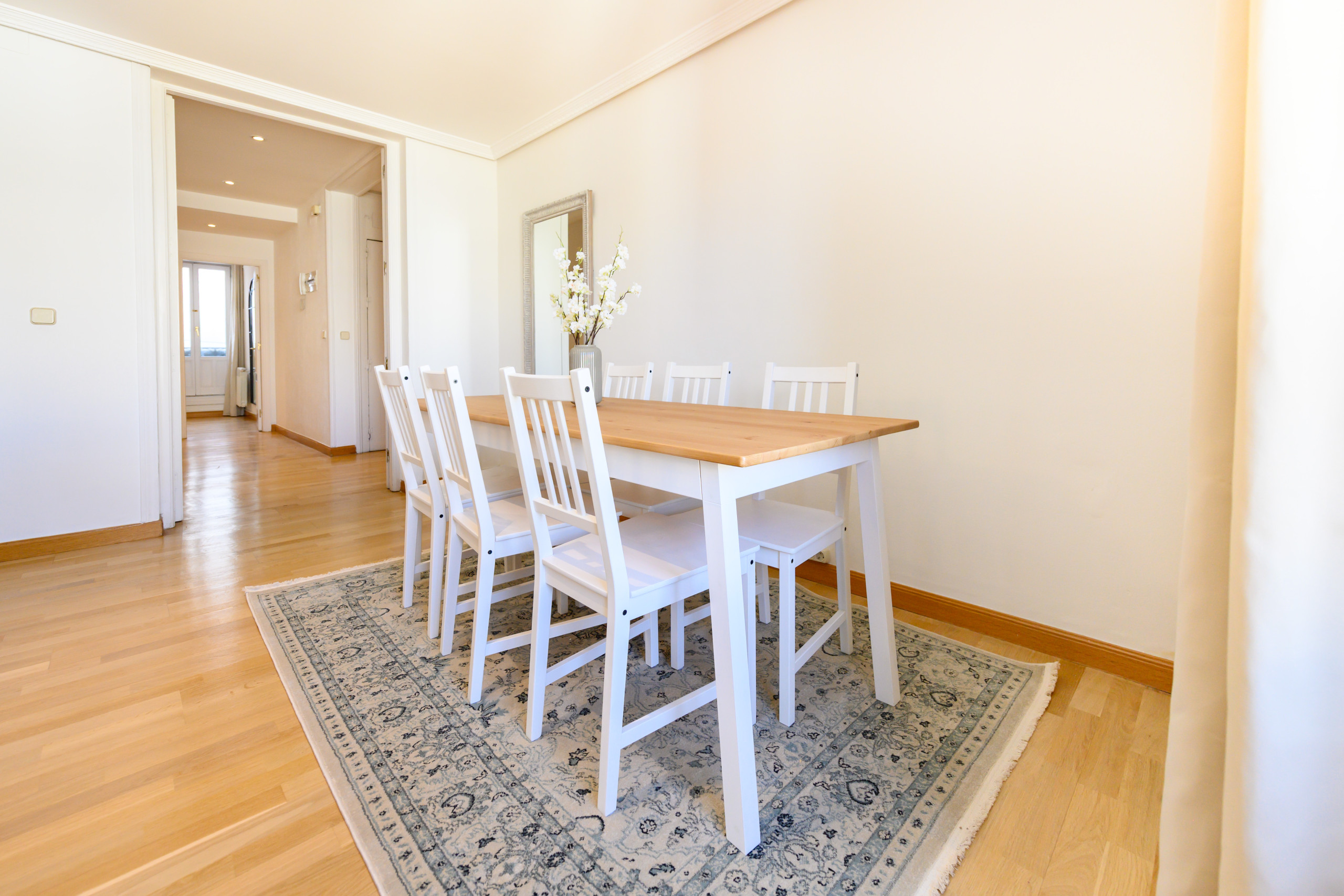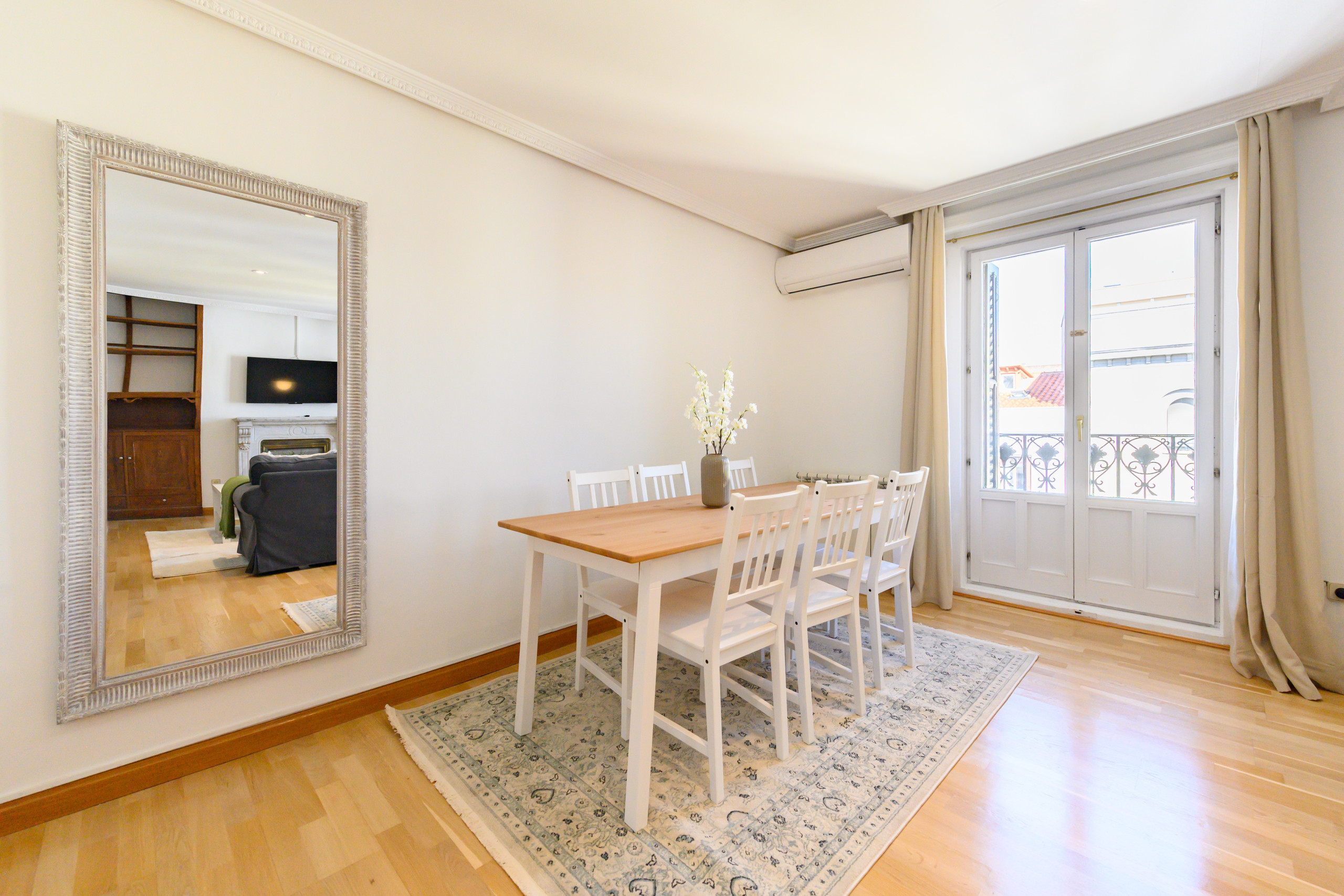 - Amplio salón principal con sofá, TV, sillón, cómodas, mesa de comedor grande, espejo y balcones exteriores con hermosas vistas que aportan abundante luz natural. Además, dispone de aire acondicionado y calefacción.