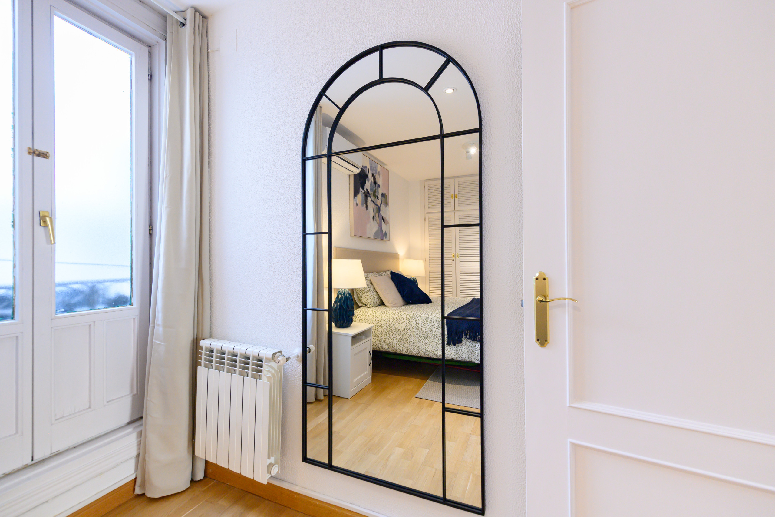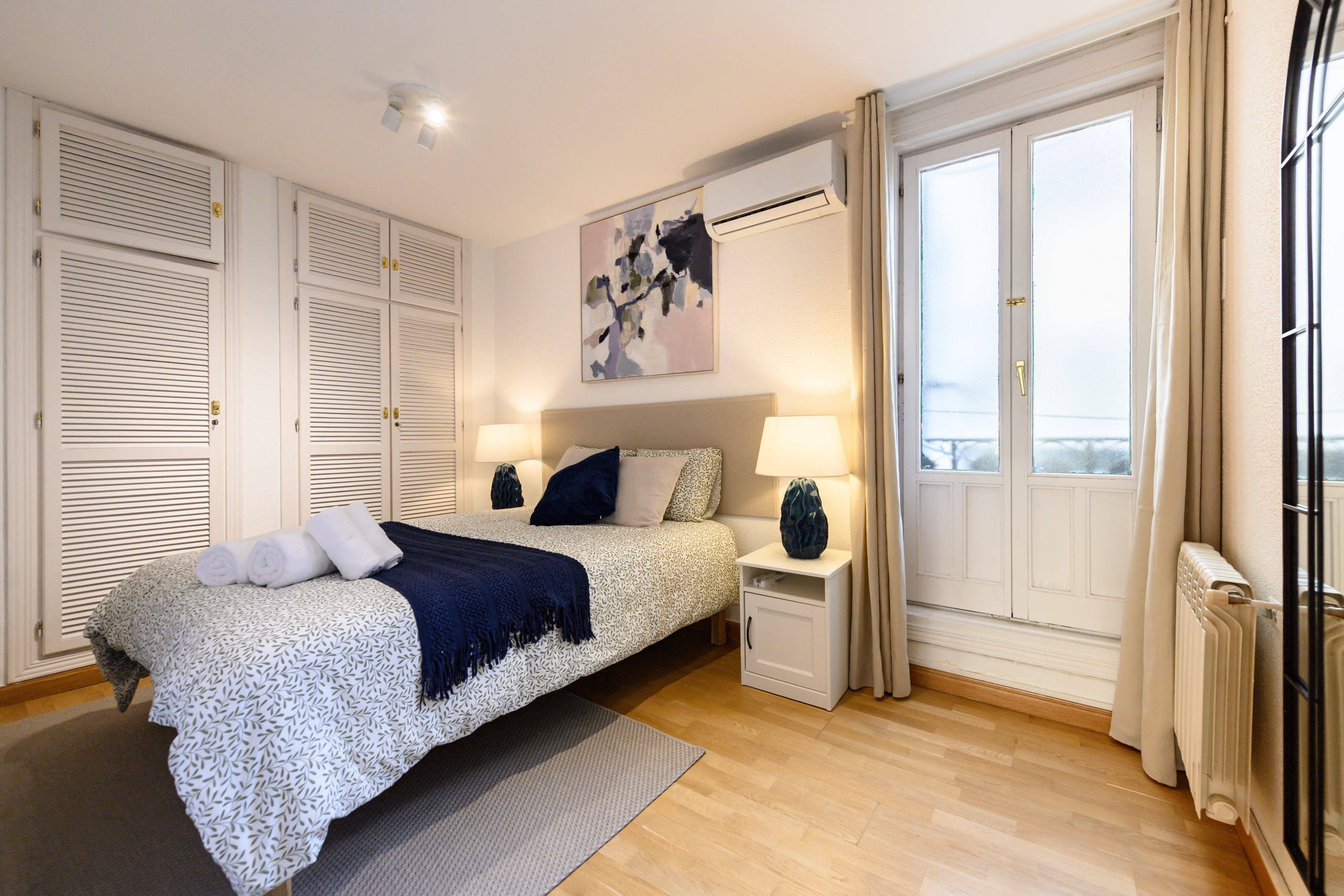 - Dormitorio con cama doble, armario empotrado, mesitas de noche, espejo, balcón, aire acondicionado y calefacción.