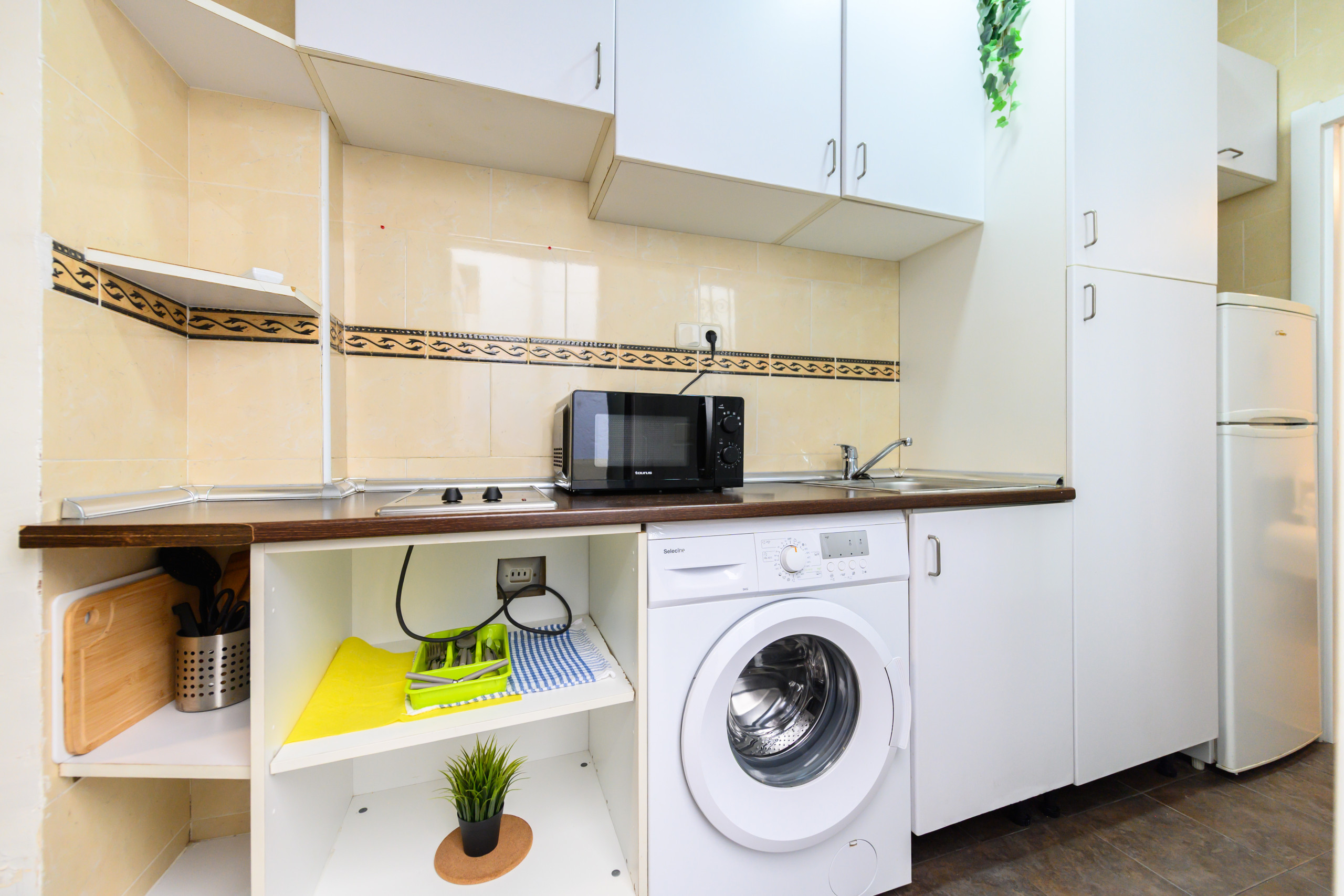 • Cocina totalmente equipada, con nevera, microondas, lavadora y utensilios necesarios para el día a día.