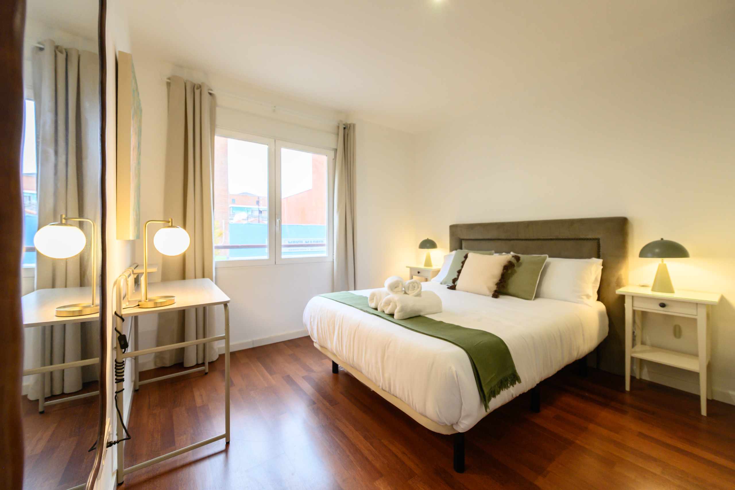 Un dormitorio con una cama de matrimonio y un escritorio, perfecto para aquellos que necesitan trabajar durante su estancia. El salón cuenta con un cómodo sofá cama doble y es muy luminoso.