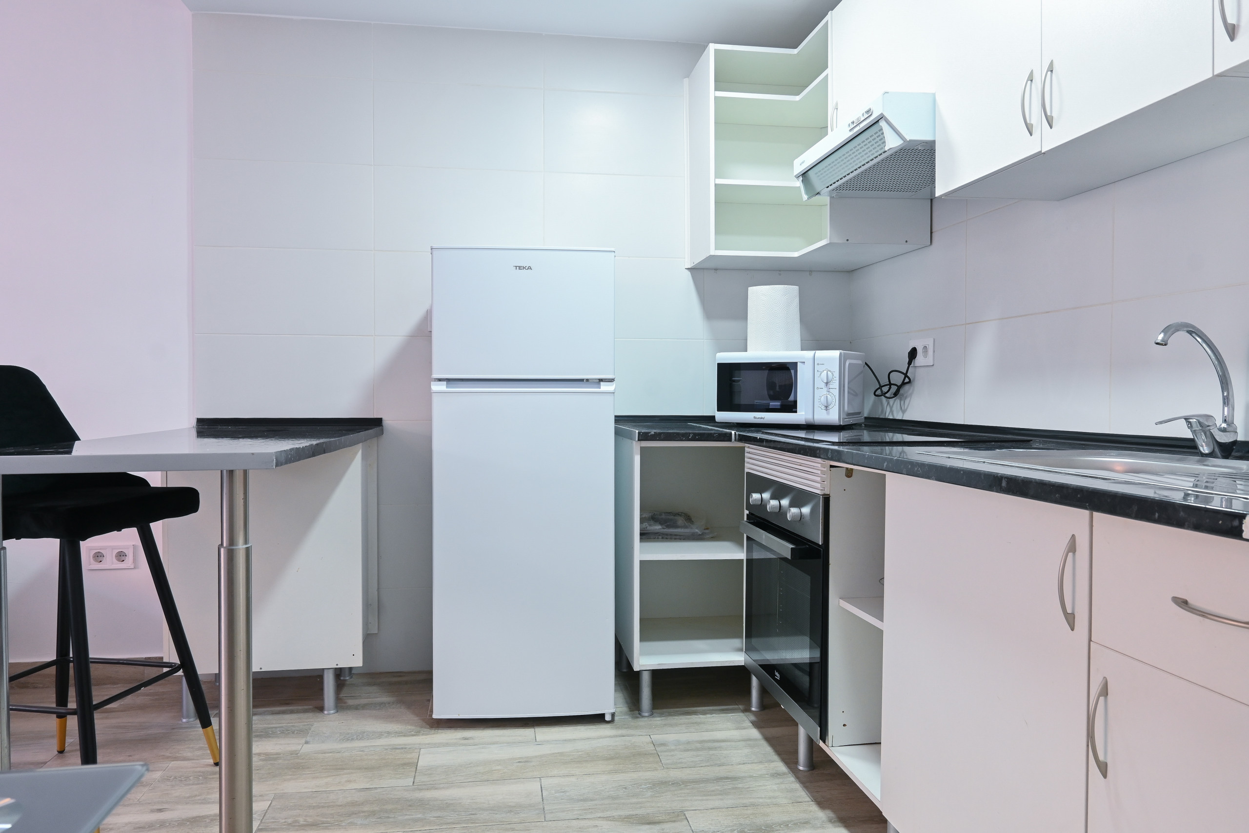 - La cocina, completamente integrada en el salón, está equipada con todo lo necesario para preparar tus comidas diarias. Incluye una vitrocerámica, microondas, fregadero y suficiente espacio de almacenamiento. Su diseño abierto permite interactuar con el resto del espacio mientras cocinas, manteniendo una sensación de amplitud y conectividad.