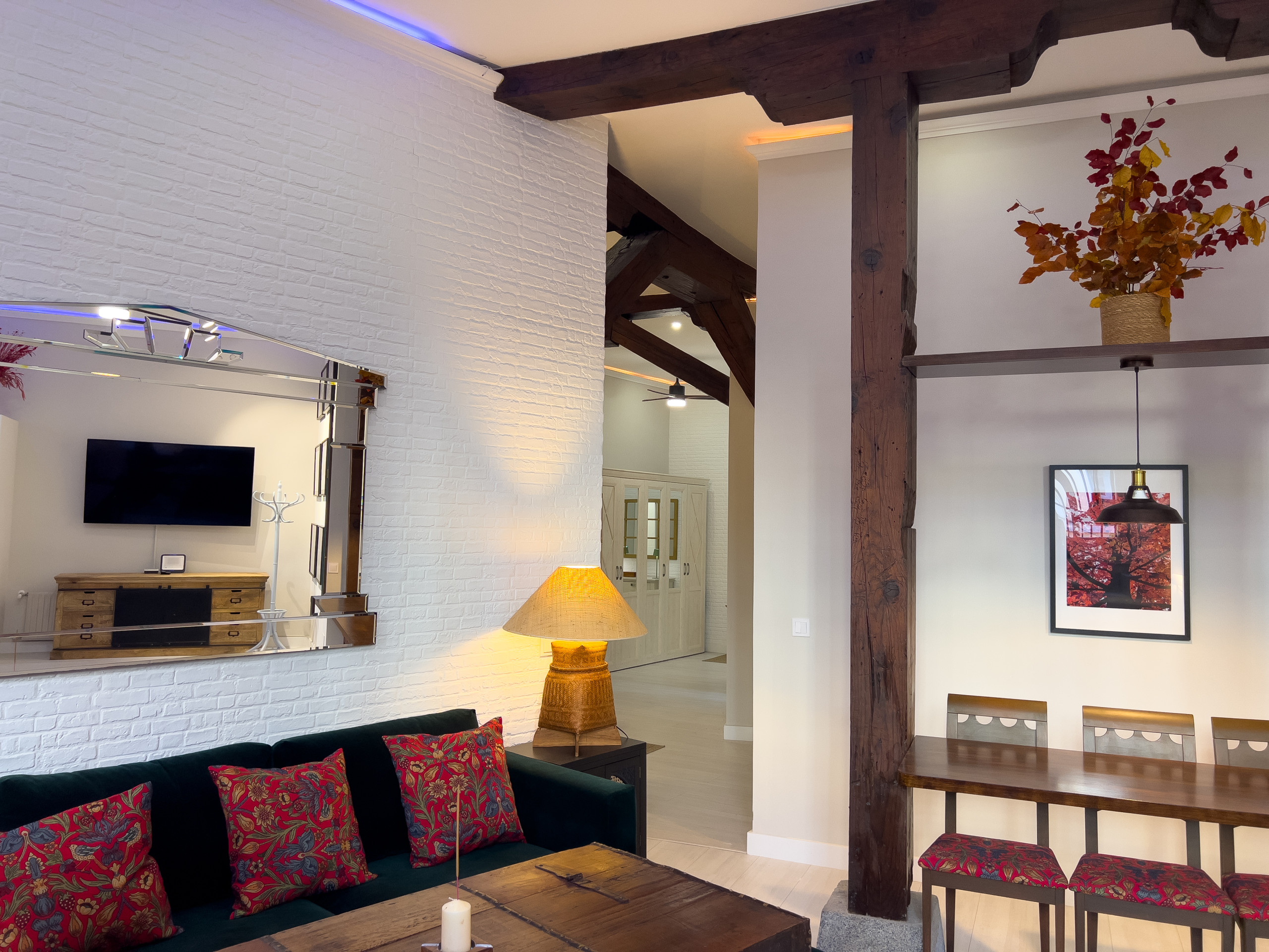 Al ingresar al departamento, serás recibido por un salón comedor, donde la atención al detalle y el diseño refinado se hacen evidentes en cada rincón. El mobiliario cuidadosamente seleccionado y los toques de decoración moderna crean un ambiente acogedor y sofisticado. Además, el salón cuenta con un cómodo sofá cama que se transforma fácilmente en una cama adicional para alojar a huéspedes adicionales.
