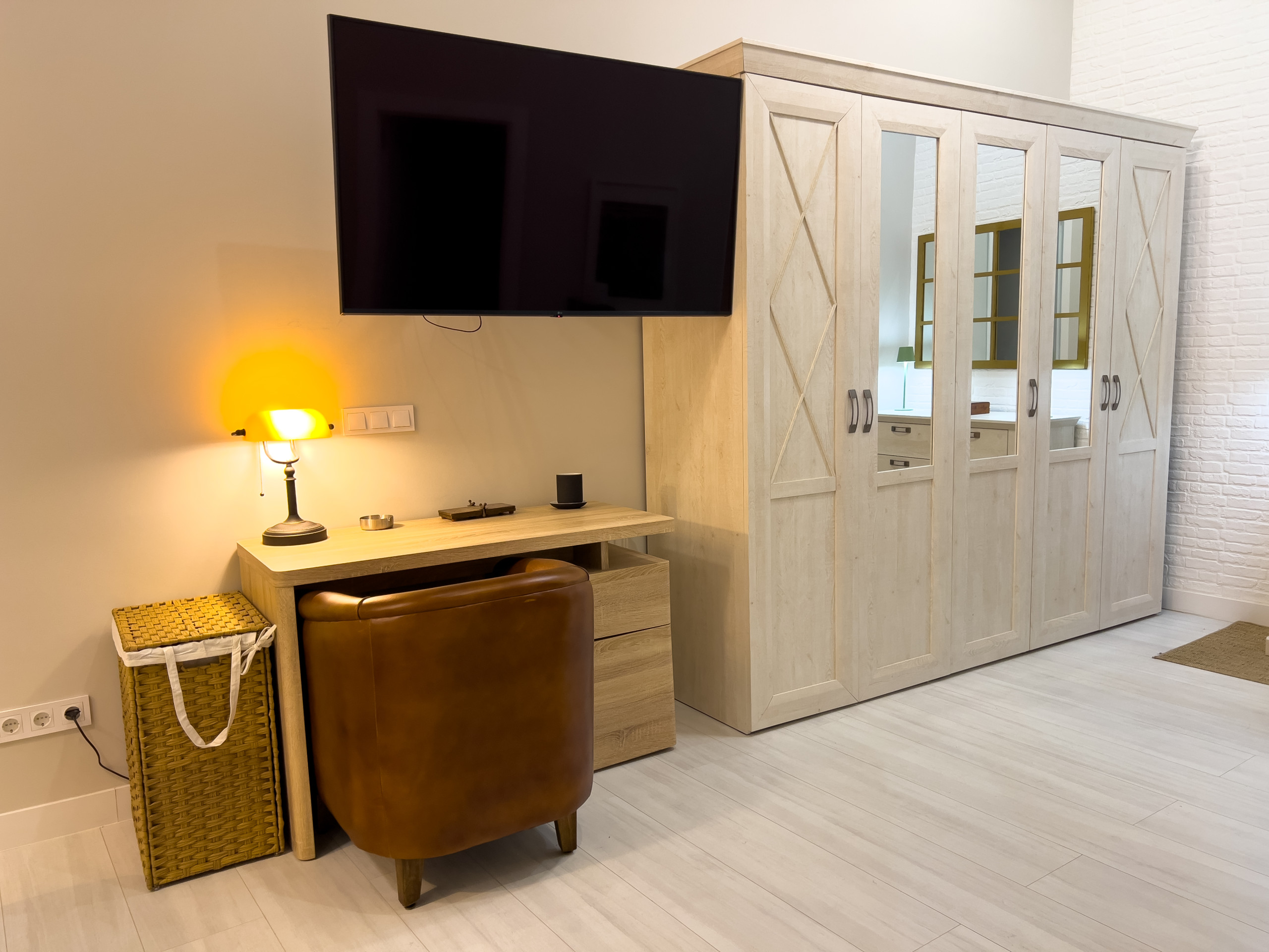 Un dormitorio con una cama de matrimonio y un escritorio, perfecto para aquellos que necesitan trabajar durante su estancia. El salón cuenta con un cómodo sofá cama doble y es muy luminoso.