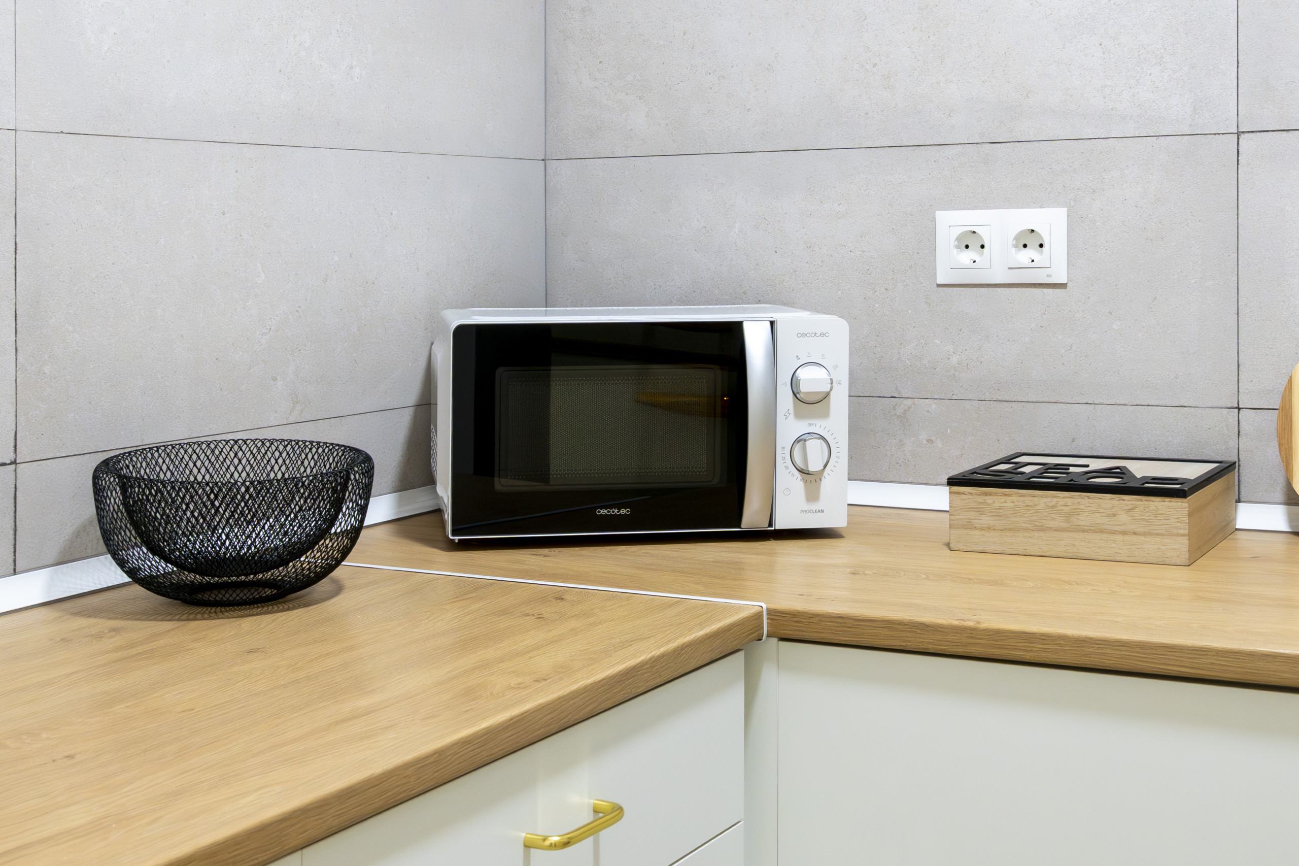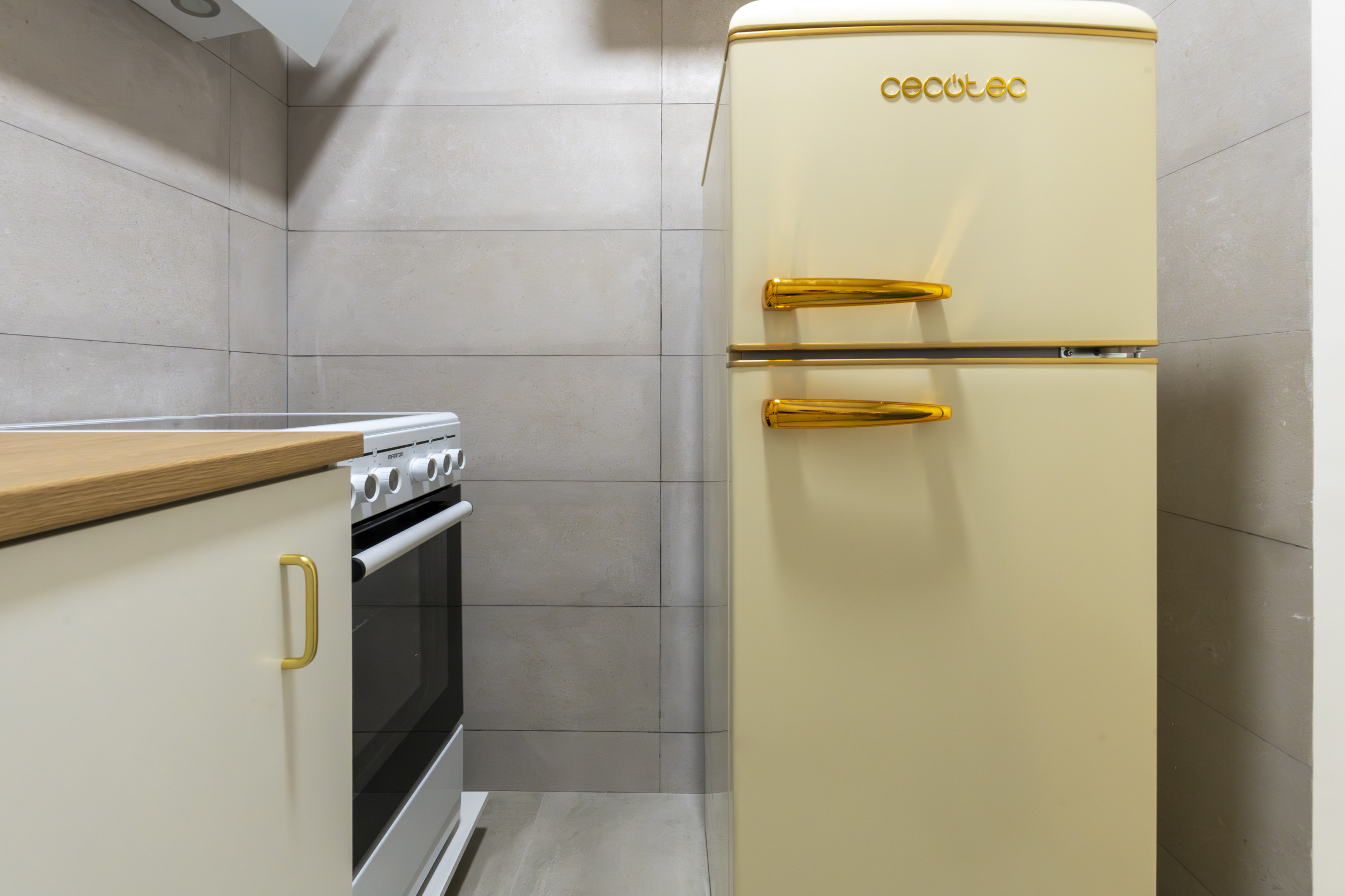 Cocina completa y perfectamente equipada con horno, fogones, microondas, y una encantadora nevera estilo vintage. Todo lo necesario para cocinar como en casa.
