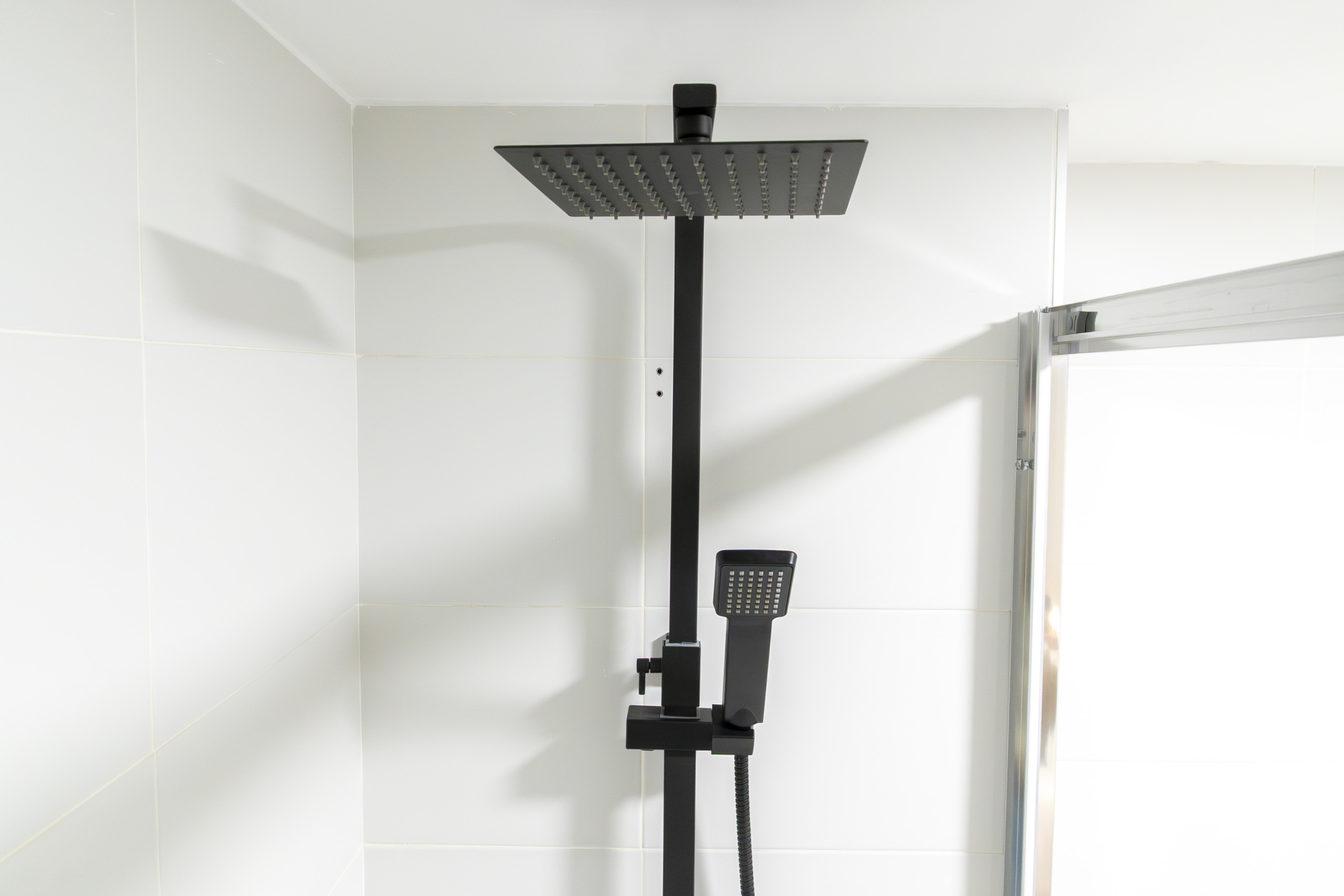 Baño completo con plato de ducha moderno, funcional y con buen almacenamiento.