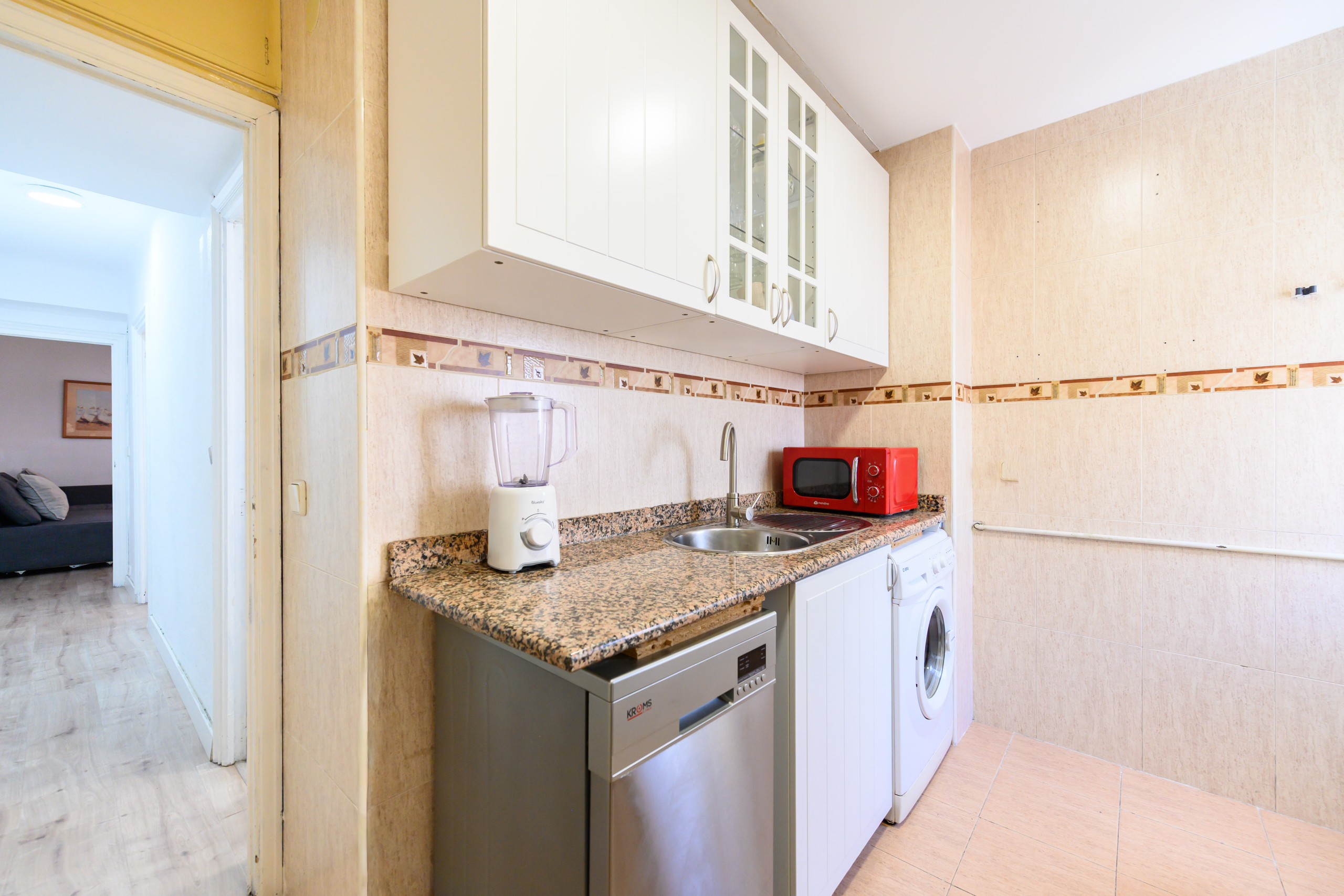 - Cocina está totalmente equipada, con nevera, horno, microondas, cafetera, licuadora, lavavajillas, mesa de comedor y todos los utensilios necesarios para el día a día.