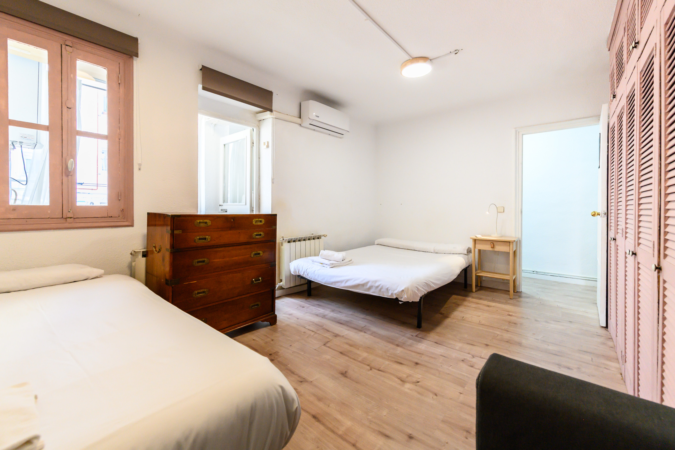 - Habitación 2: equipada con una cama doble y una cama individual, sofá, cómoda, mesita de noche, aire acondicionado dentro de la habitación, amplio armario empotrado y un anexo adicional para almacenaje.
