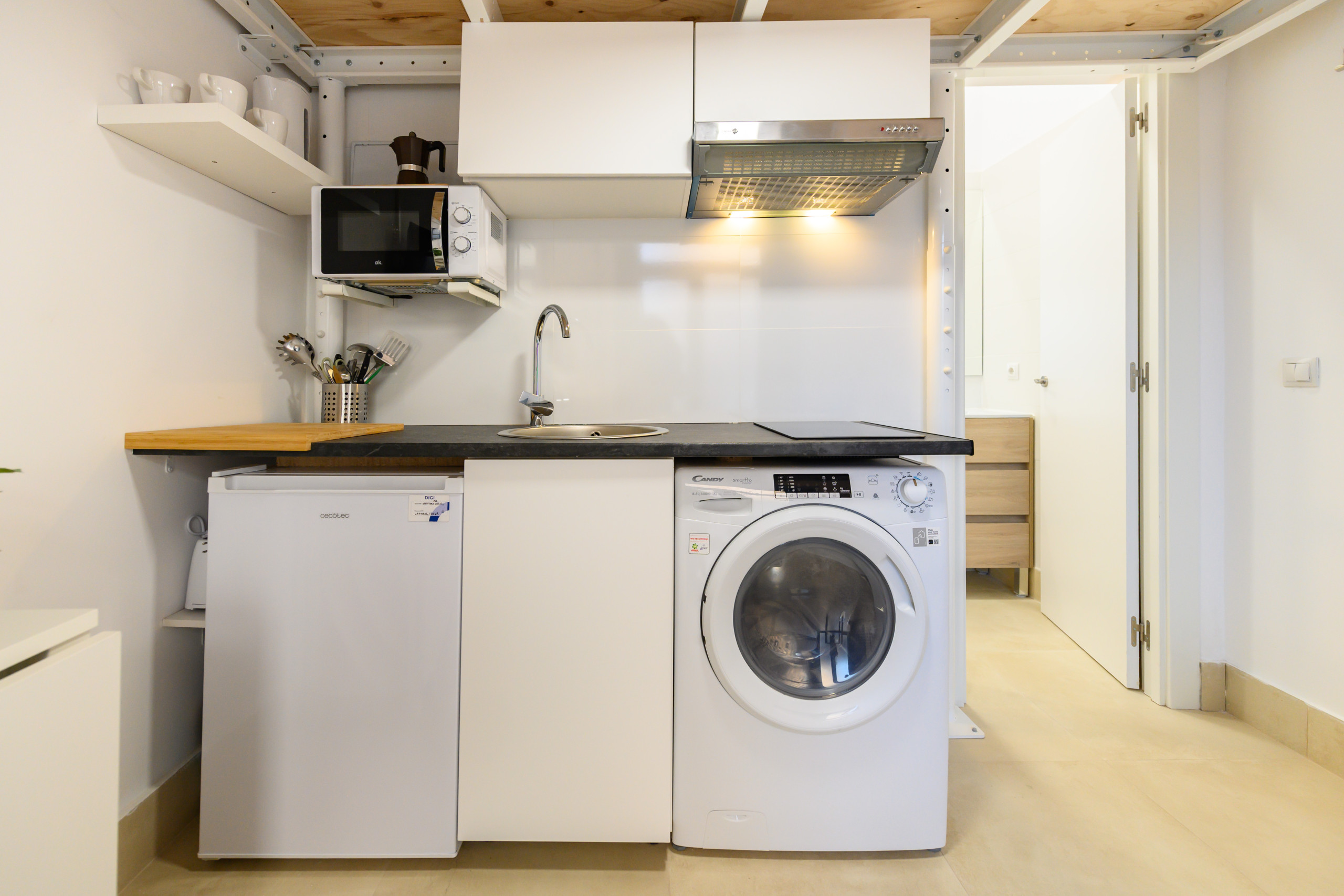 Los electrodomésticos son de última generación y están perfectamente integrados en el diseño. Tiene horno-microondas, lo que aprovecha muy bien el espacio.