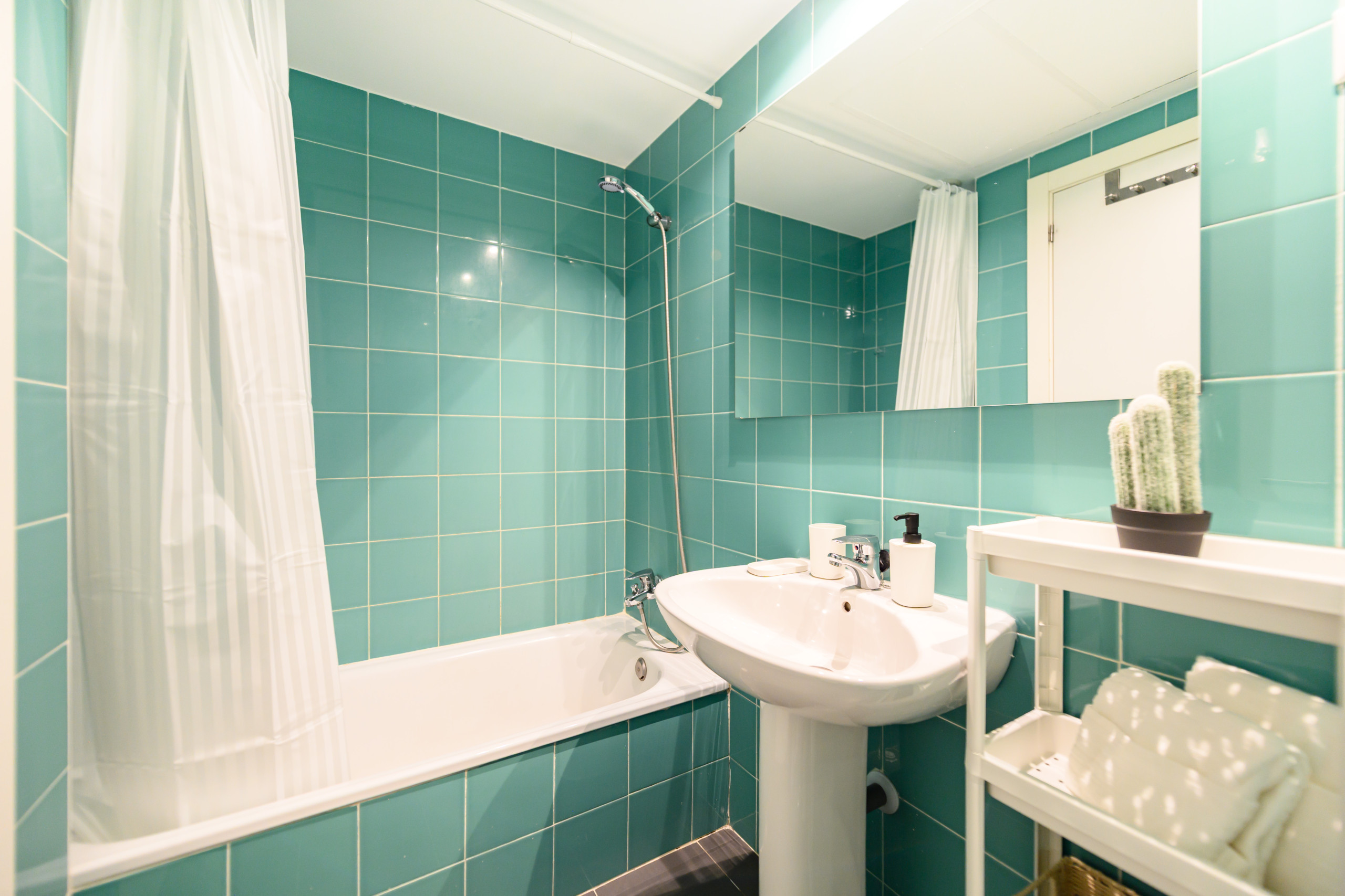 El baño es completo, equipado con bañera, mueble de lavabo con almacenaje y espejo, ofreciendo un espacio cómodo y bien distribuido.