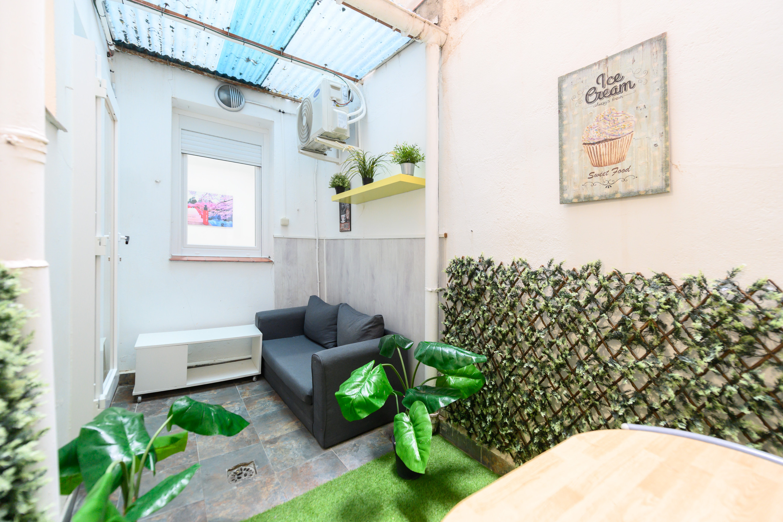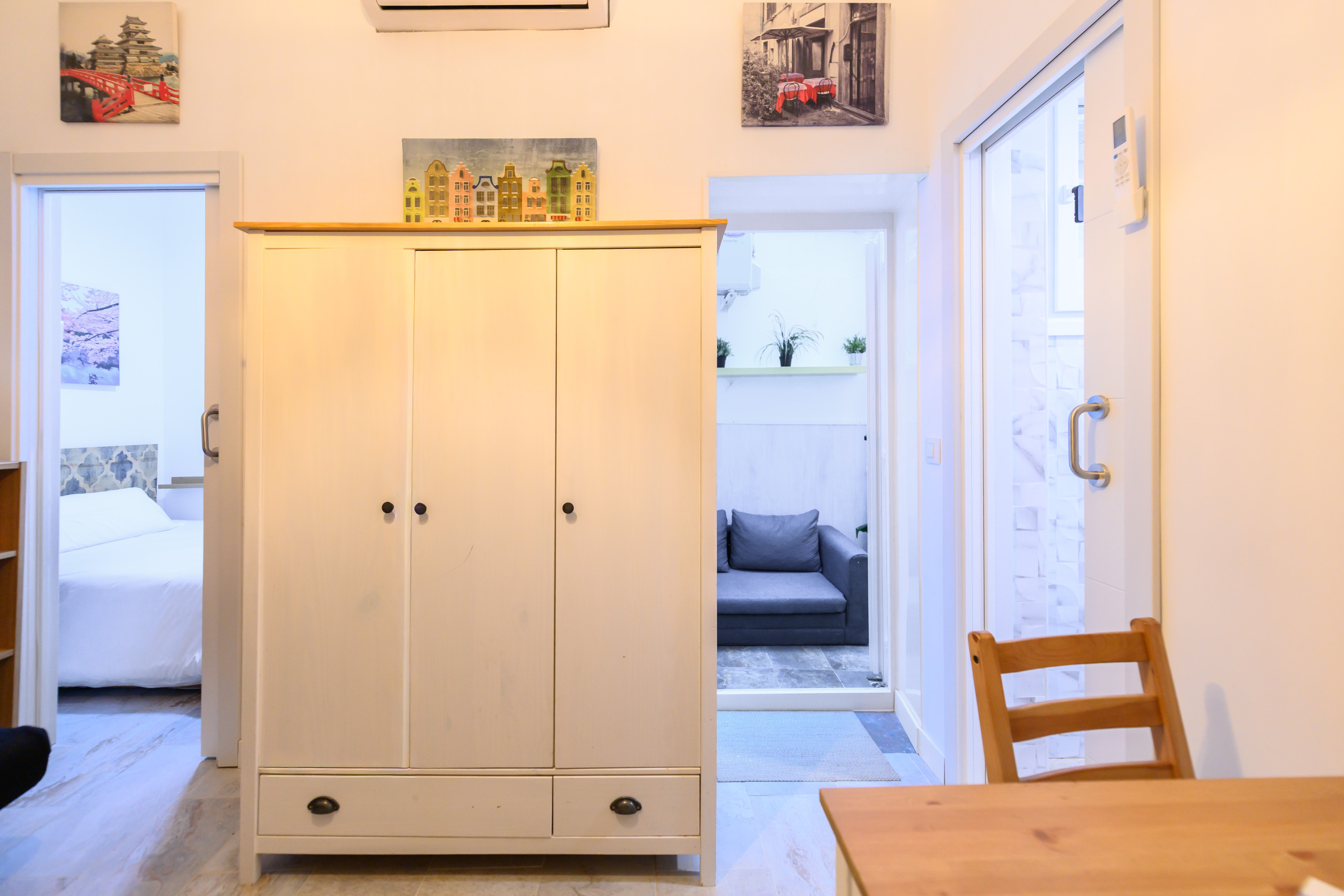 • Zona común: sofá, TV, aire acondicionado, espejo, mesa de comedor, armario y cómoda.