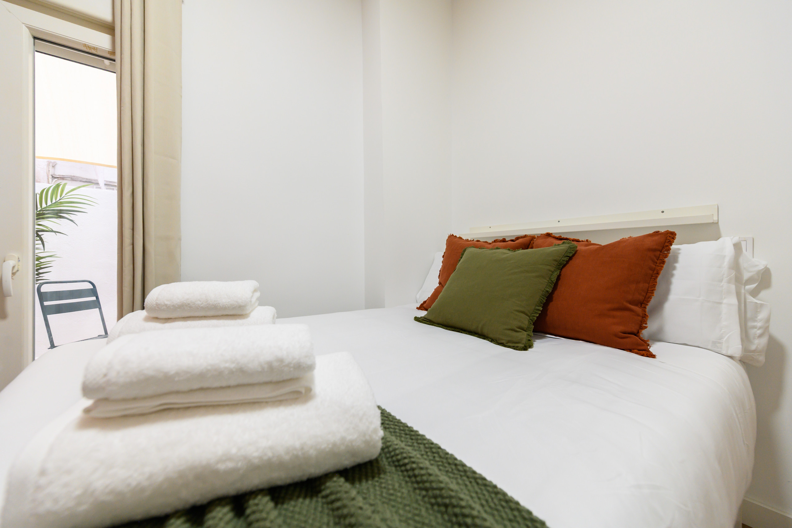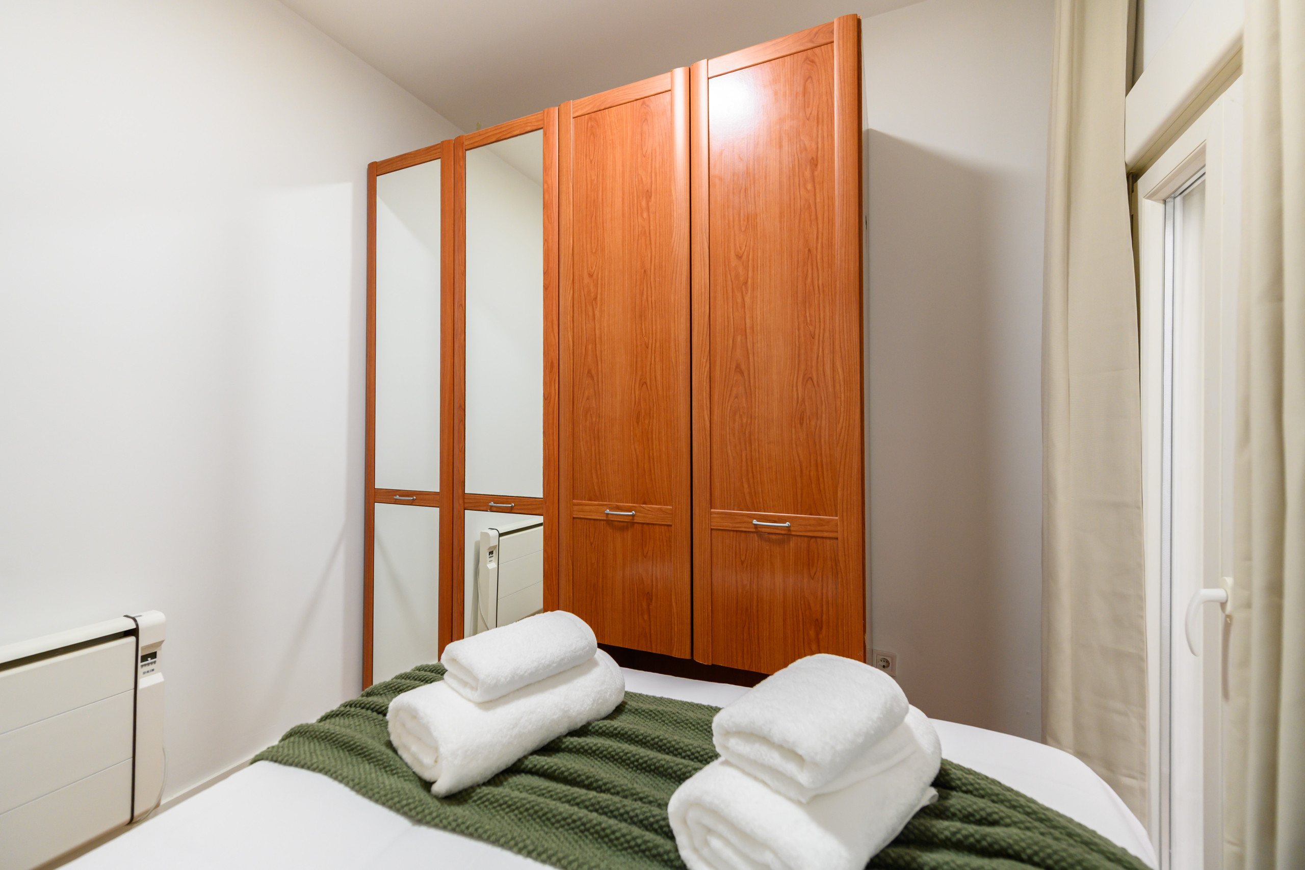 • Dormitorio con cama doble y canapé, amplio armario con espejo y acceso directo a la terraza.