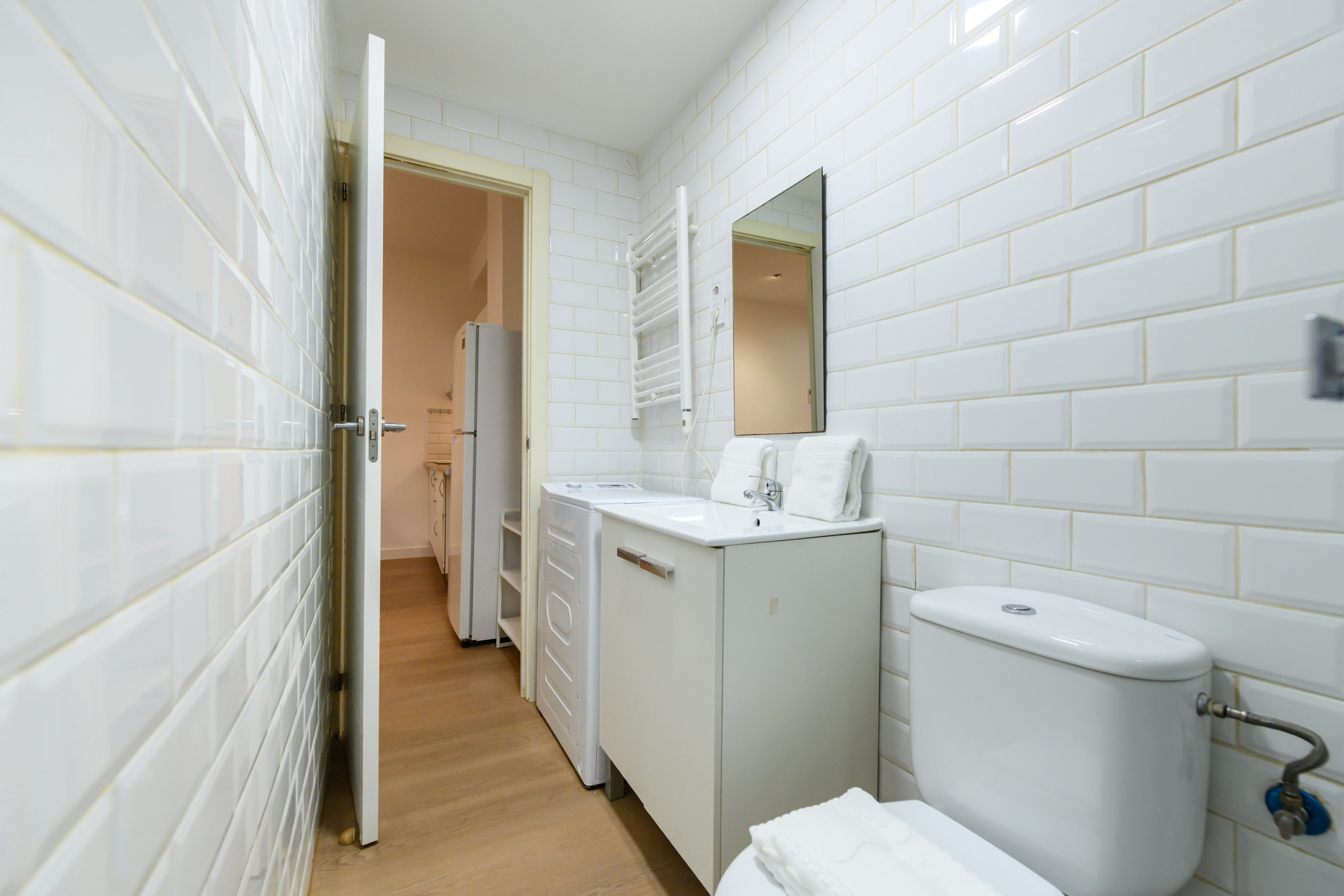 • Baño completo con ducha, WC, espejo, lavadora y espacio de almacenamiento.