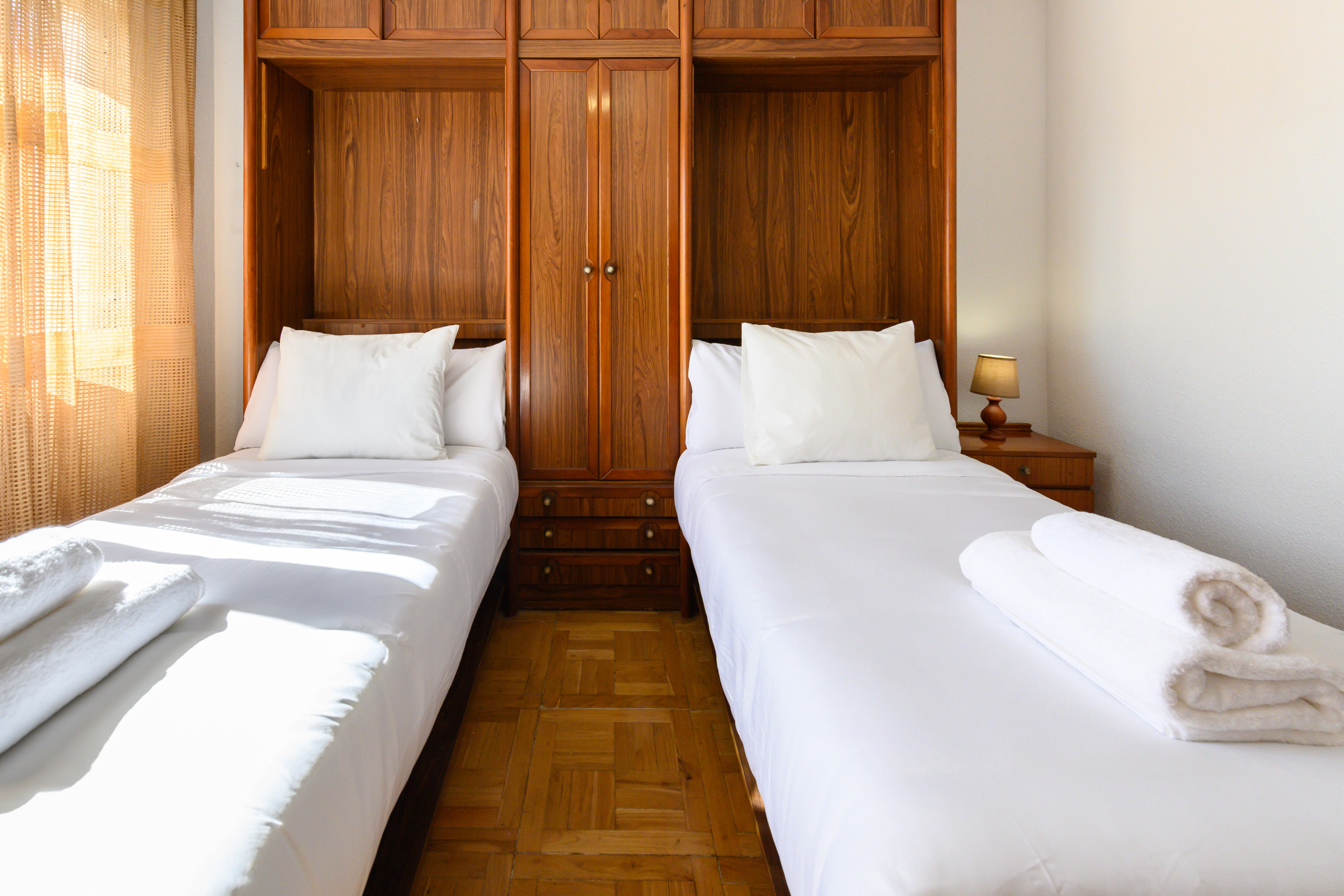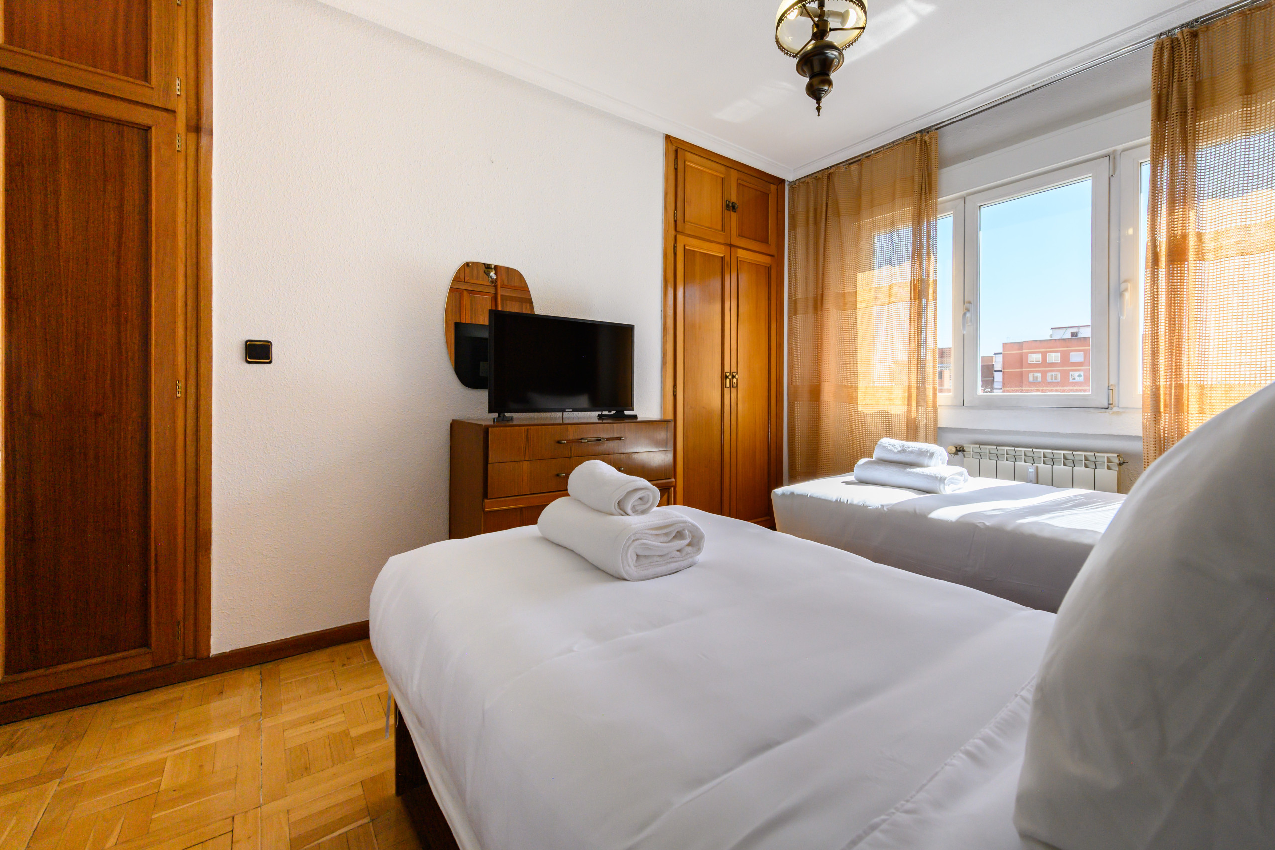 • Dormitorio con dos camas individuales, armarios empotrados, cómoda, TV y amplia ventana con vistas al exterior.
