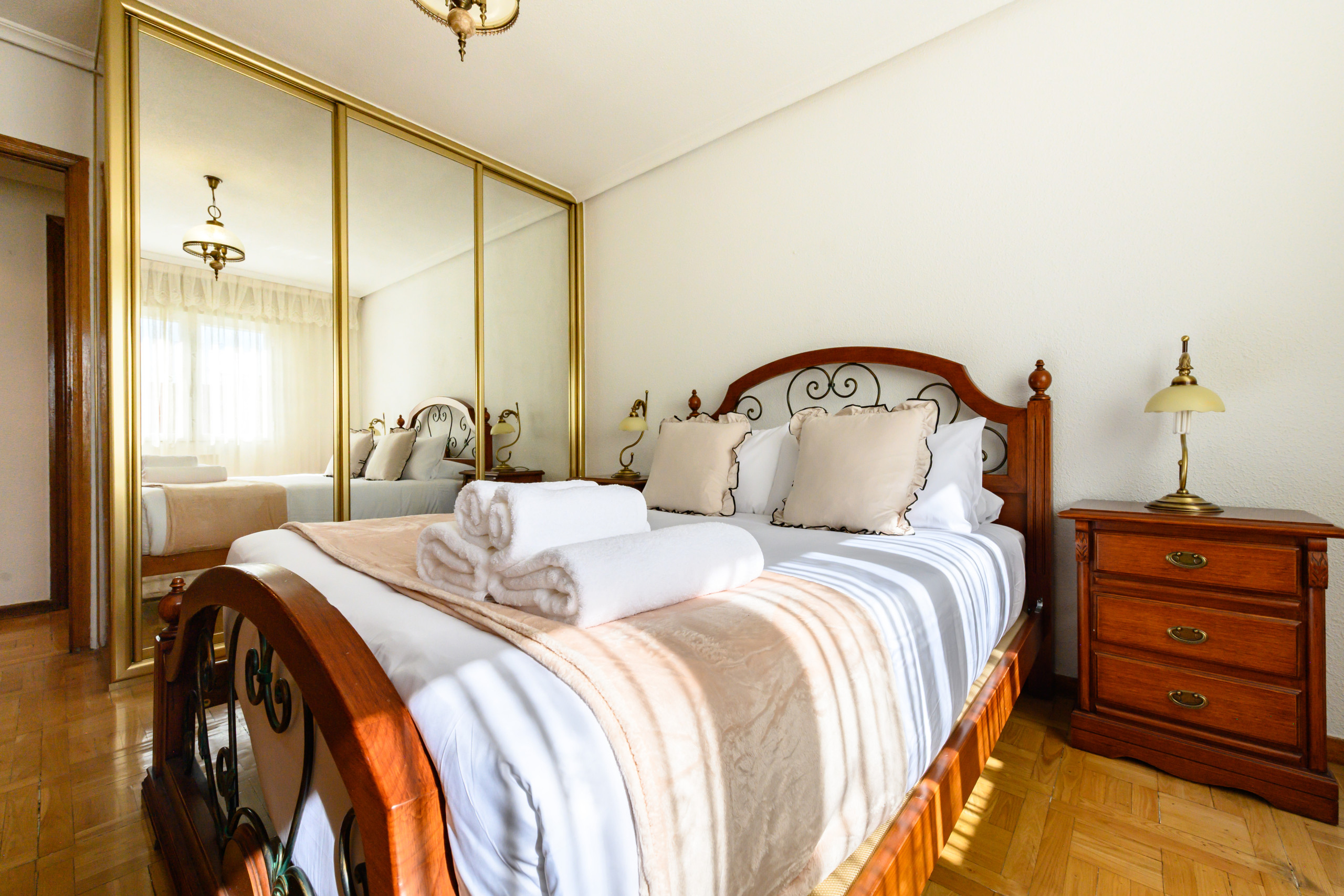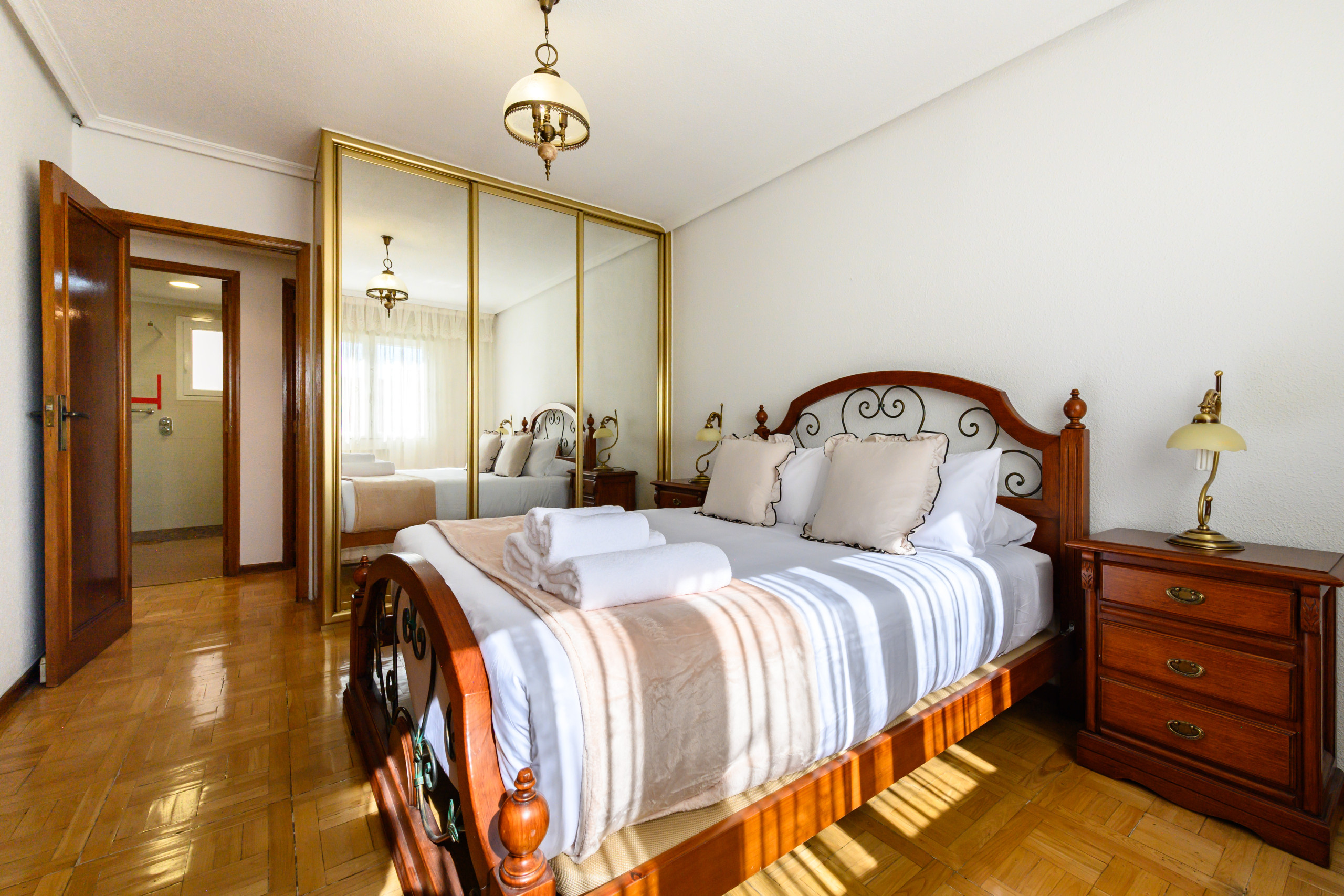 • Dormitorio amplio con cama doble, armarios empotrados, cómoda, espejos y gran ventana con abundante luz natural.