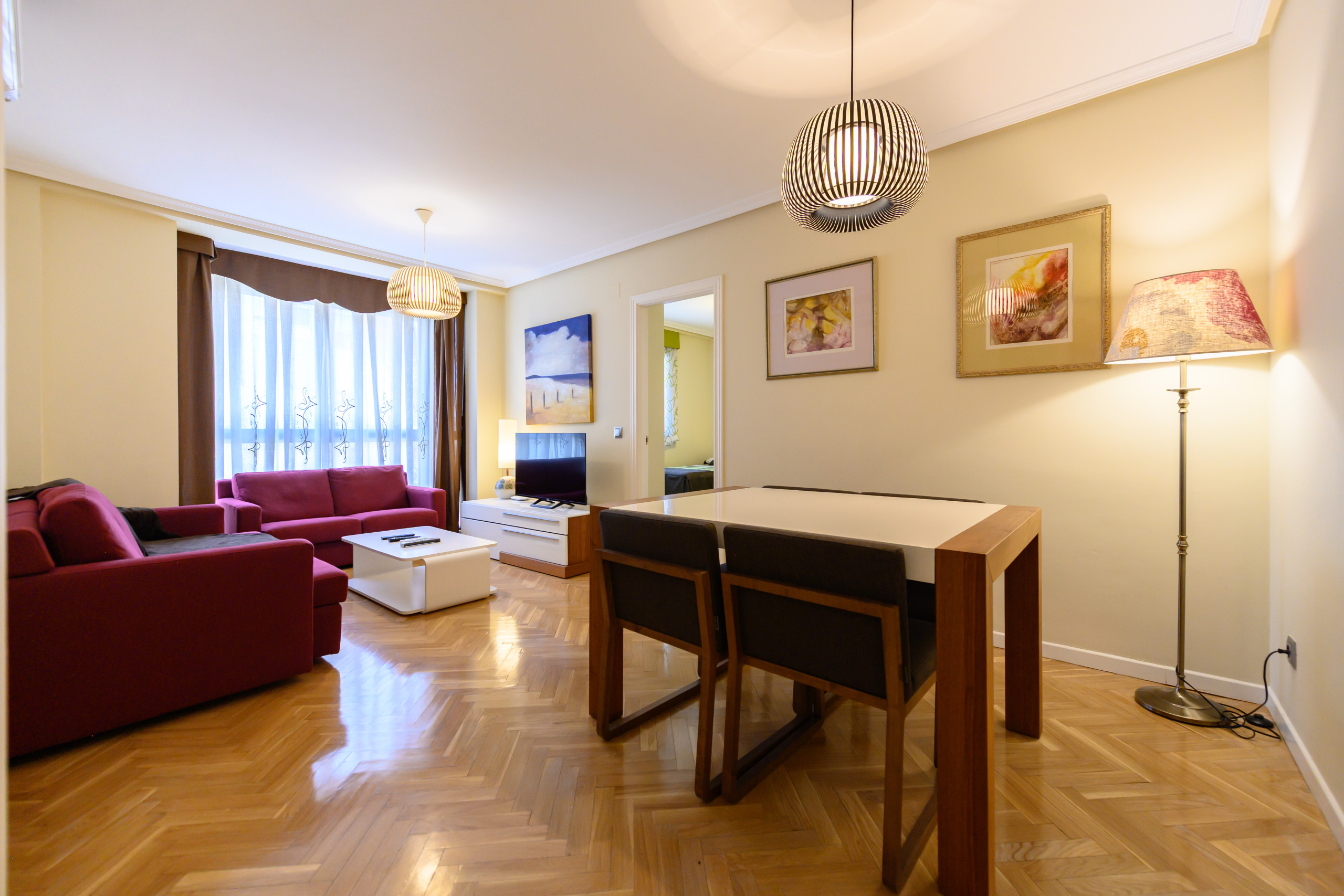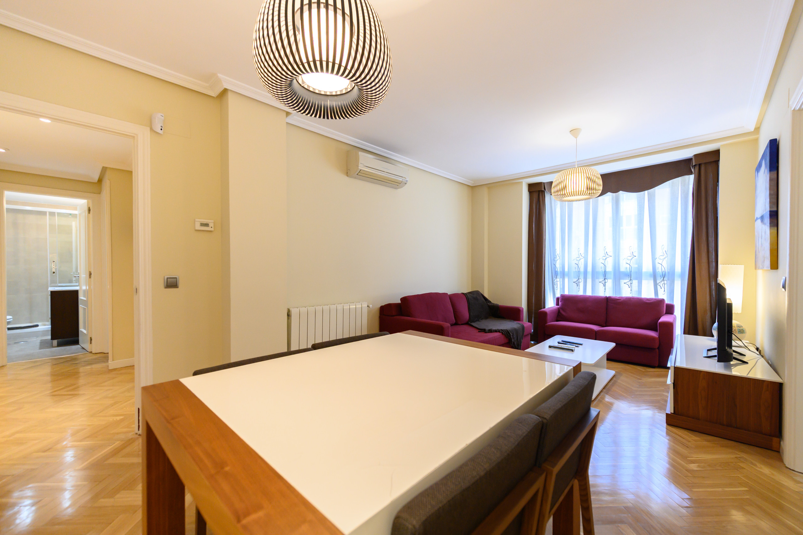 • Amplio salón con dos sofás, TV, mesa de comedor y grandes ventanas que aportan abundante luz natural. Dispone de aire acondicionado y calefacción.