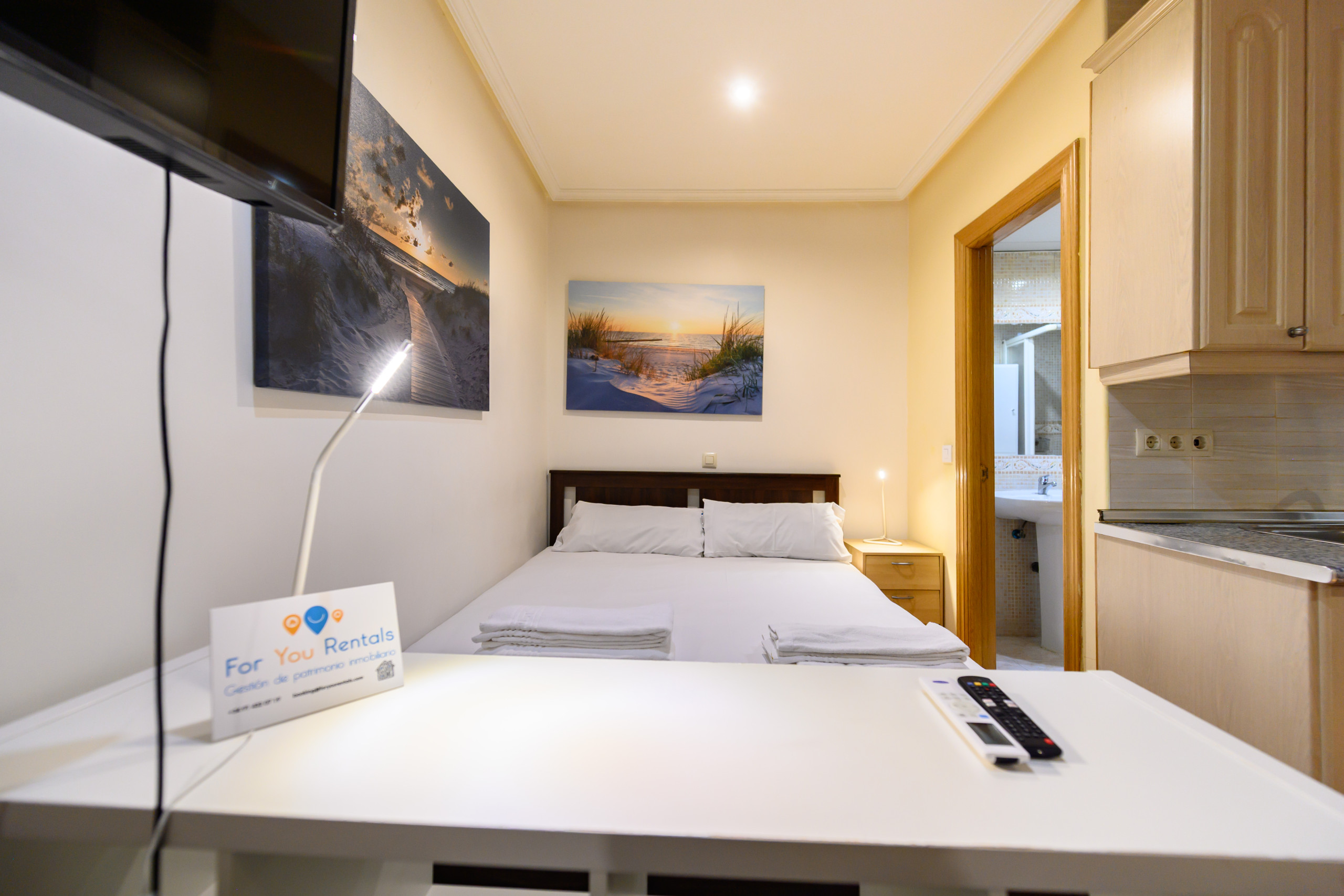 Un dormitorio con una cama de matrimonio y un escritorio, perfecto para aquellos que necesitan trabajar durante su estancia. El salón cuenta con un cómodo sofá cama doble y es muy luminoso.