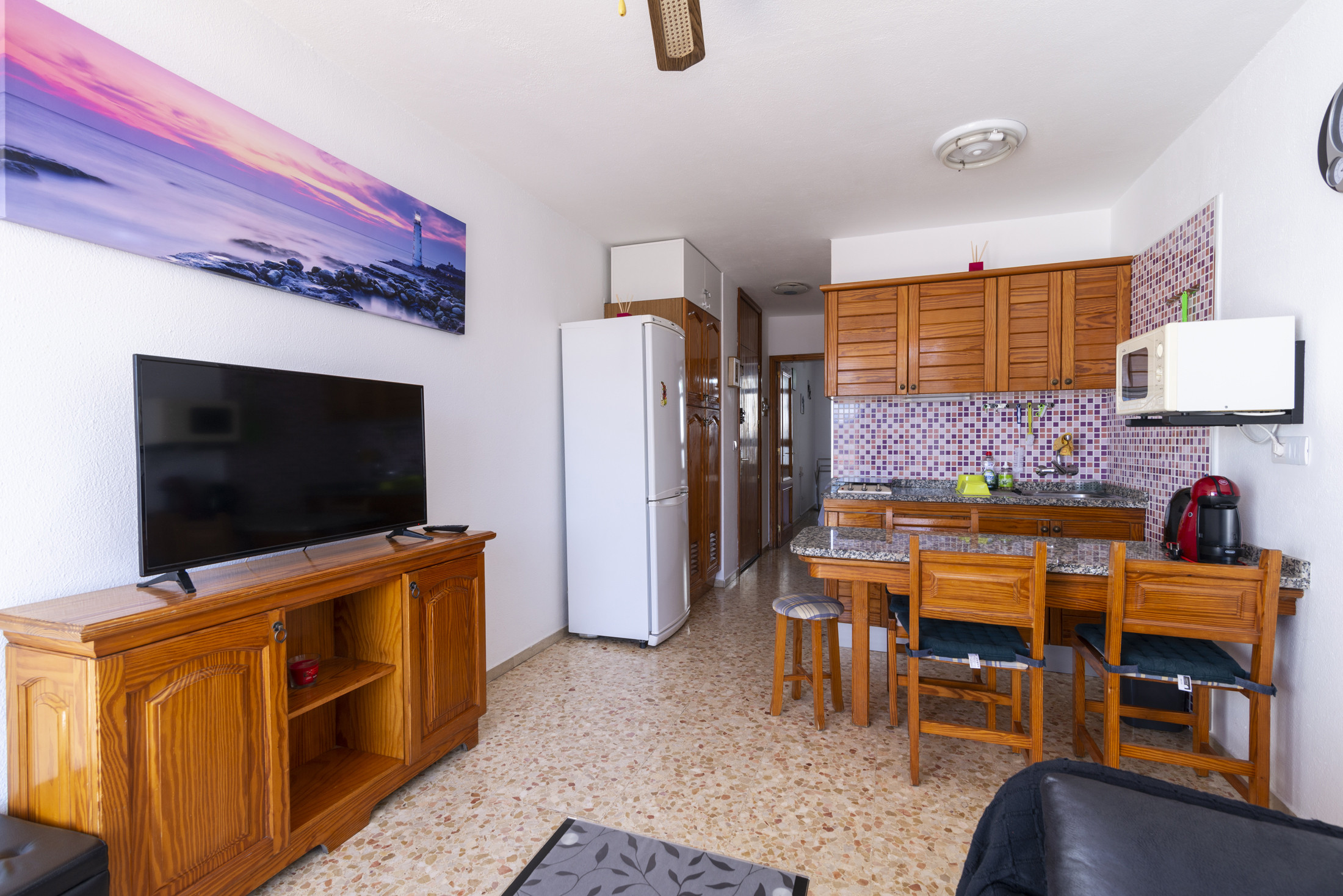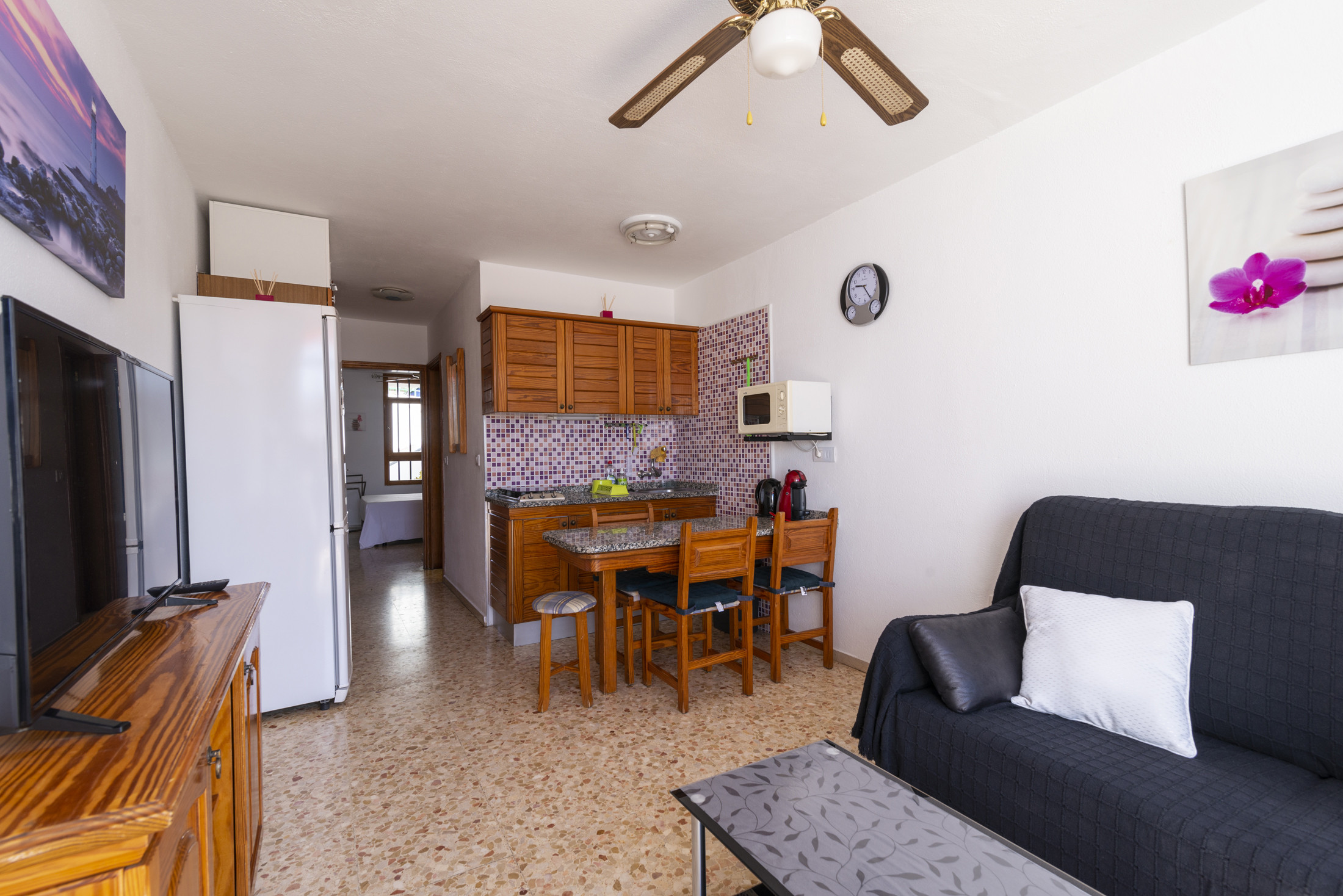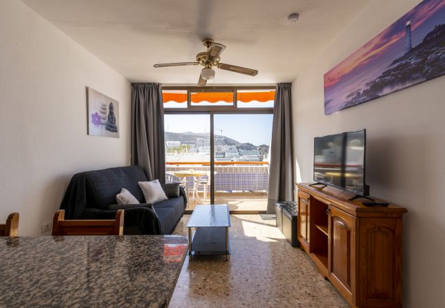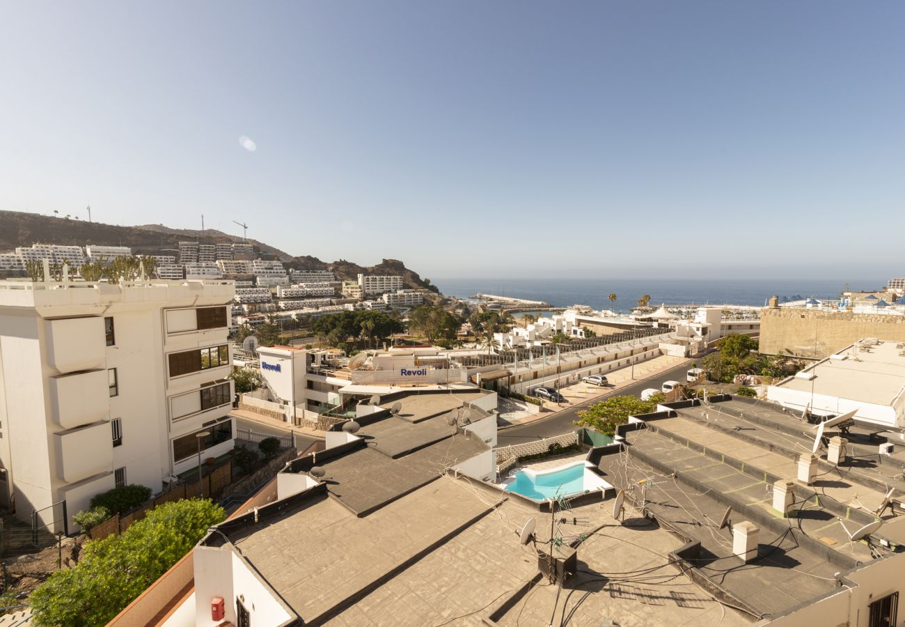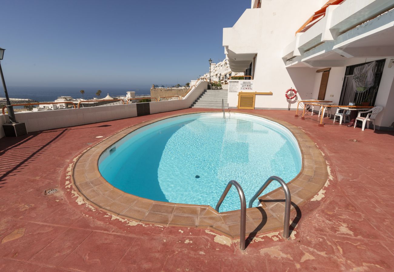 Apartamento en Puerto Rico con una estupenda terraza desde donde se puede disfrutar de las vistas al mar. Situado en un complejo de apartamentos muy tranquilo en la zona alta de la urbanización. La localización permite llegar a la playa en 5 minutos a pie y también disfrutar del ocio y restauración que ofrece el conocido Centro Comercial de Puerto Rico. El apartamento cuenta con un dormitorio principal con cama de matrimonio y armario empotrado. Un salón cocina totalmente equipado con un cómodo sofá cama. Dispone a su vez de conexión a internet wifi de pago y tv.