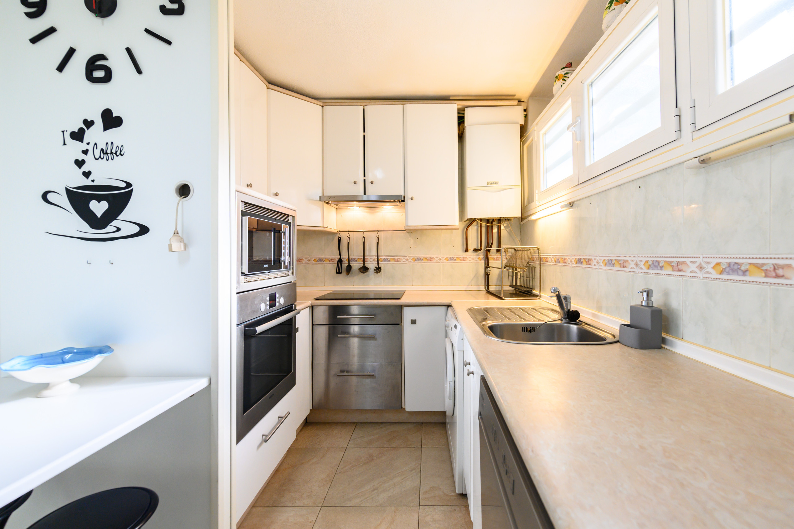 • Cocina totalmente equipada con frigorífico, microondas, horno, lavadora, lavavajillas, utensilios y espacio de almacenaje, además de zona de comedor.
