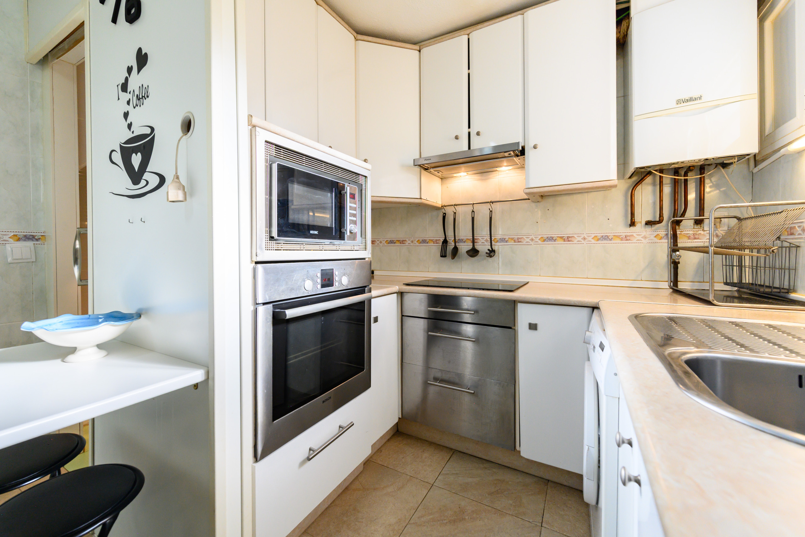 En la zona de comedor con acceso directo a la cocina. Cocina equipada con todos los electrodomésticos: nevera con congelador, vitro, horno, microondas, hervidor y tostadora y menaje de cocina.