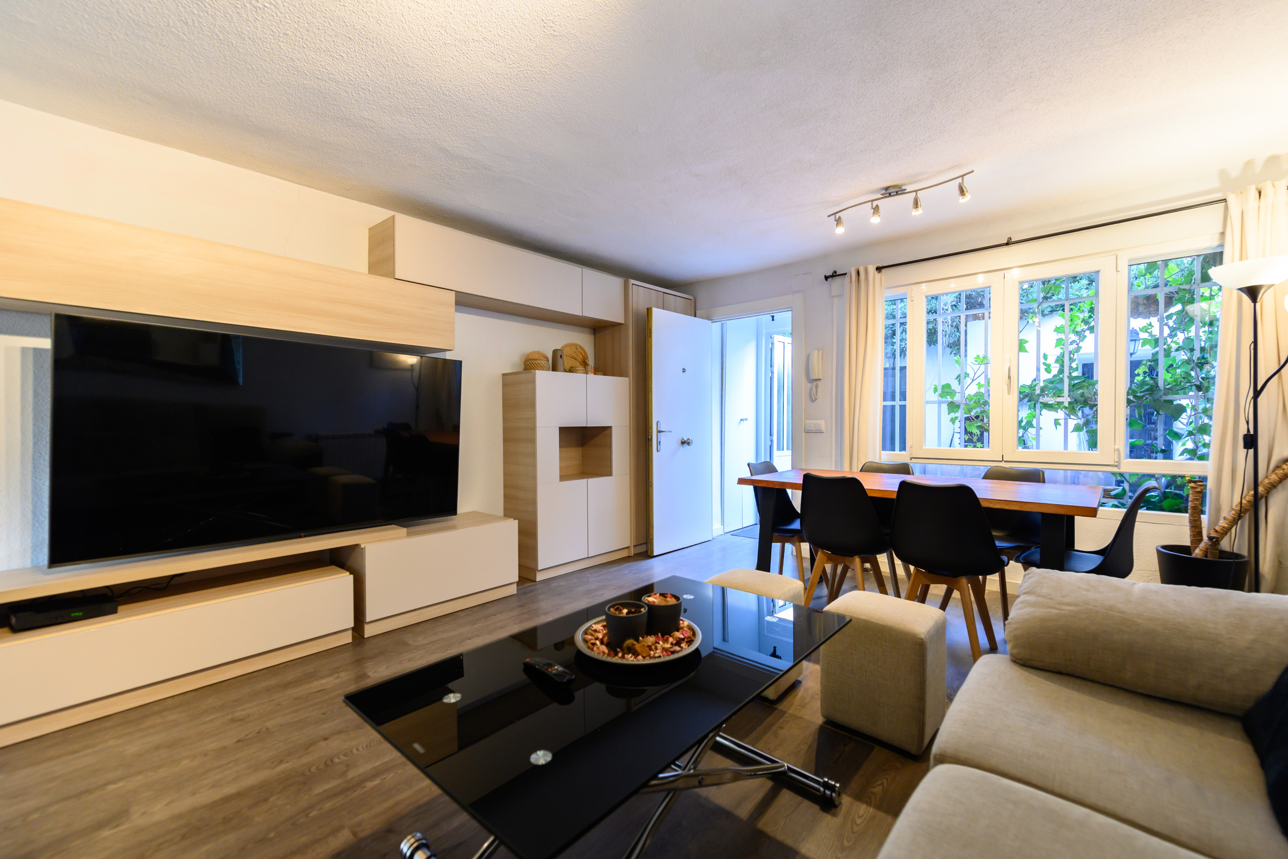 El amplio salón está distribuido en dos: la sala de estar y el comedor. En la zona de estar se encuentran un cómodo sofá-cama de dos plazas, una mesita central, un sillón, la TV de pantalla plana y el Router Wi-Fi.