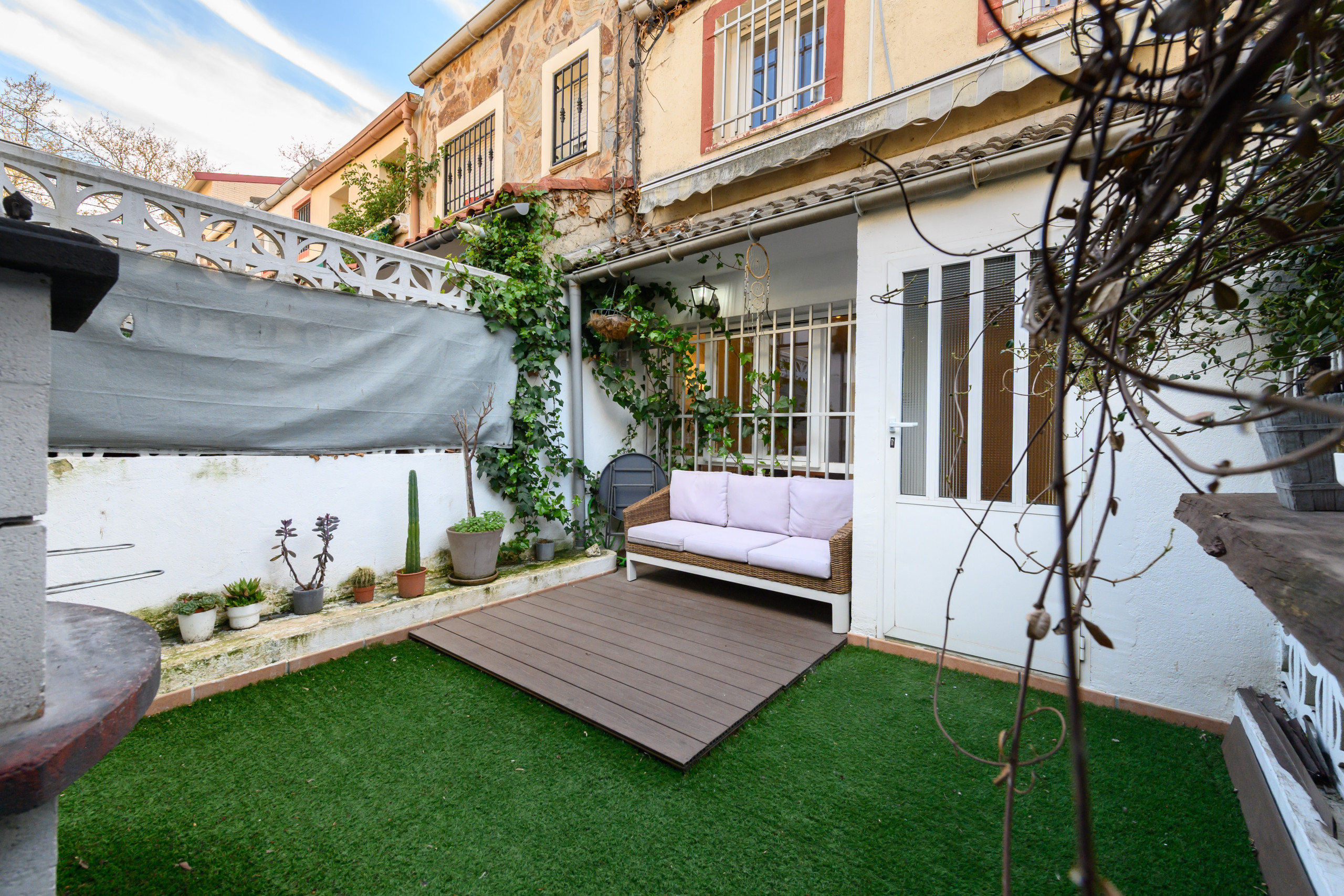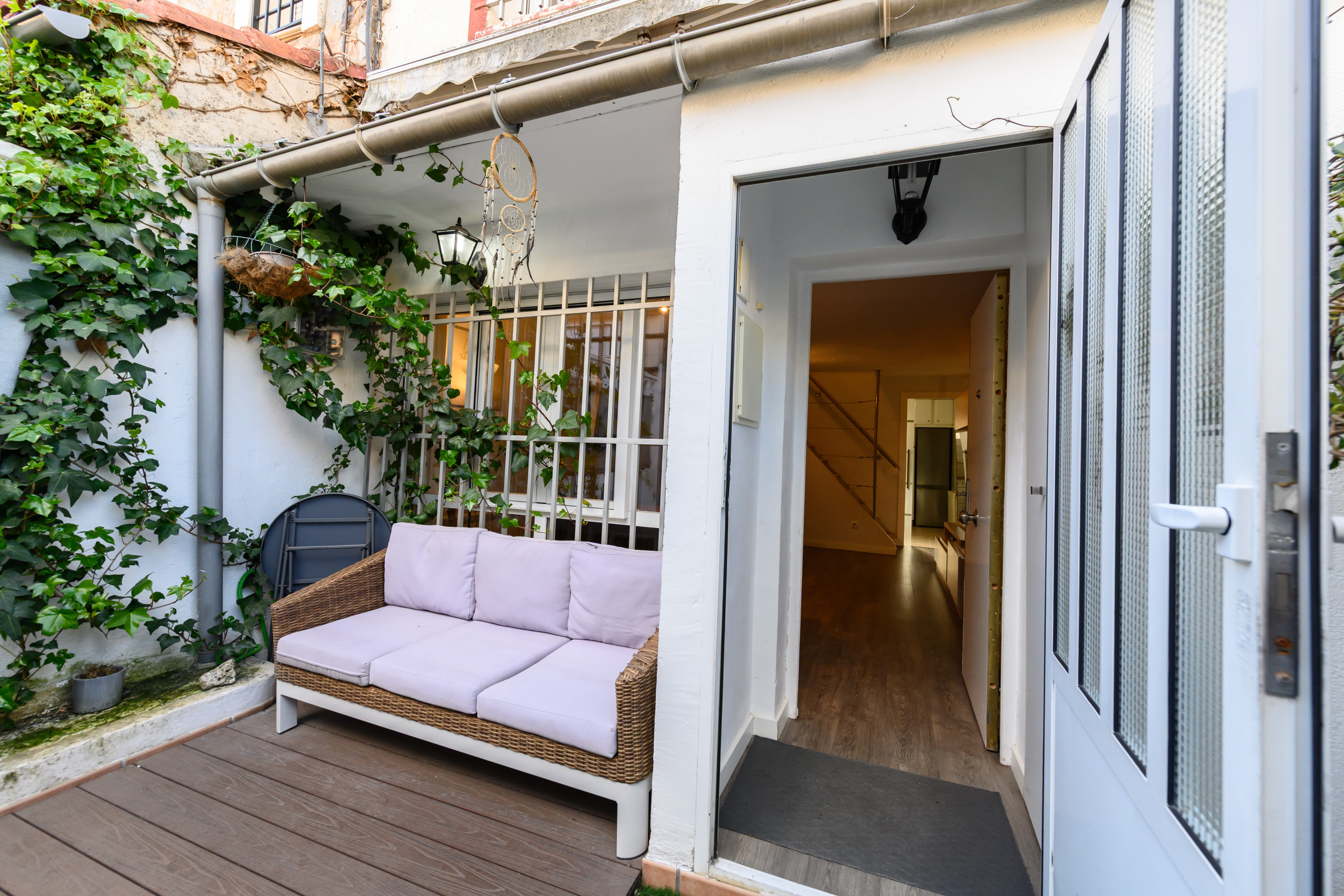 Bonito Chalet completamente amueblado, cuenta con todo lo necesario para entrar a vivir. Tres dormitorios y dos baños completos distribuidos en tres plantas con acceso directo a la calle, amplio salón comedor, cocina independiente y patio privado; a 2 minutos del metro caminando.