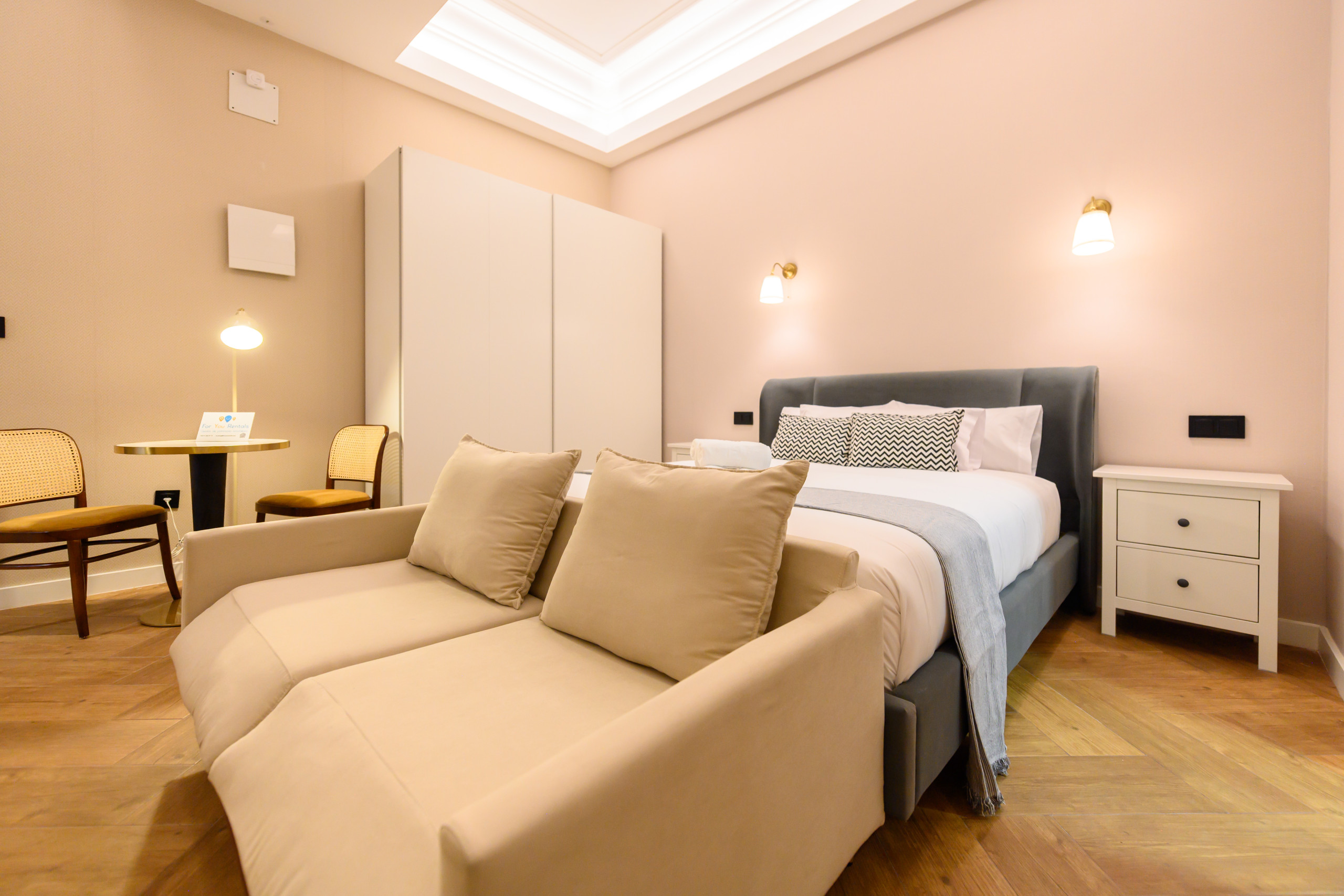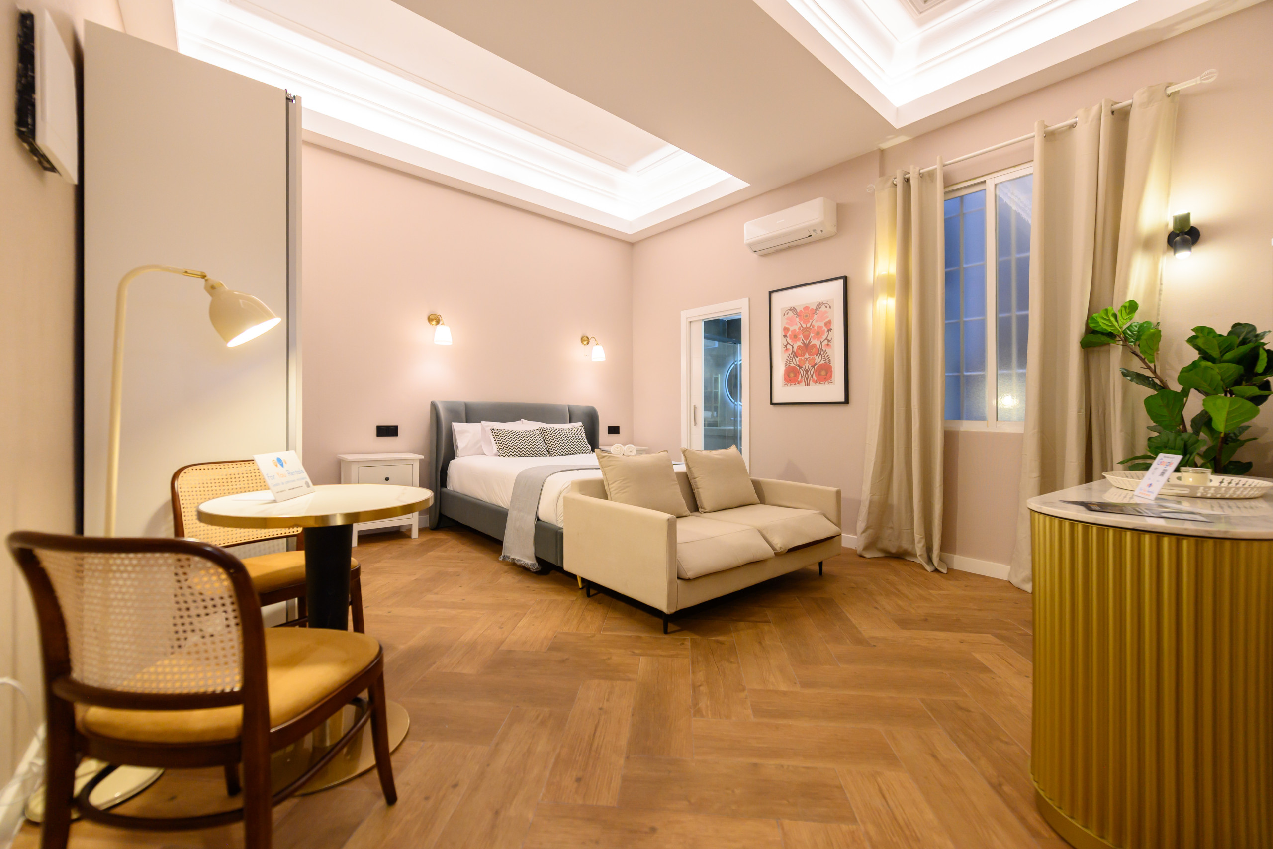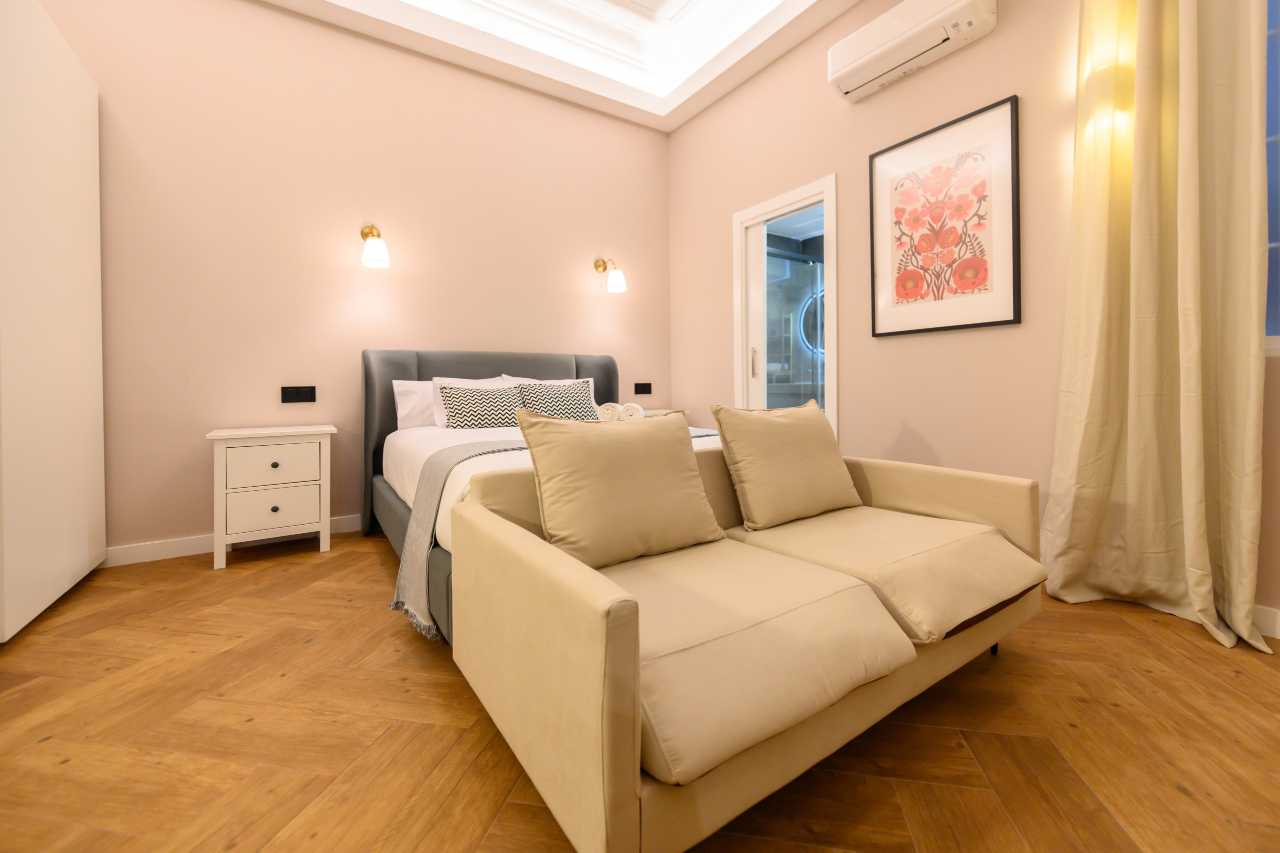 Al ingresar, te encontrarás en el espacio principal del estudio. Aquí, encontrarás un sofá cama que es una pieza central versátil. Durante el día, es un acogedor rincón de lectura o un lugar para relajarte mientras planeas tus aventuras madrileñas. Por la noche, se convierte en una cómoda cama para un descanso reparador.