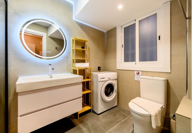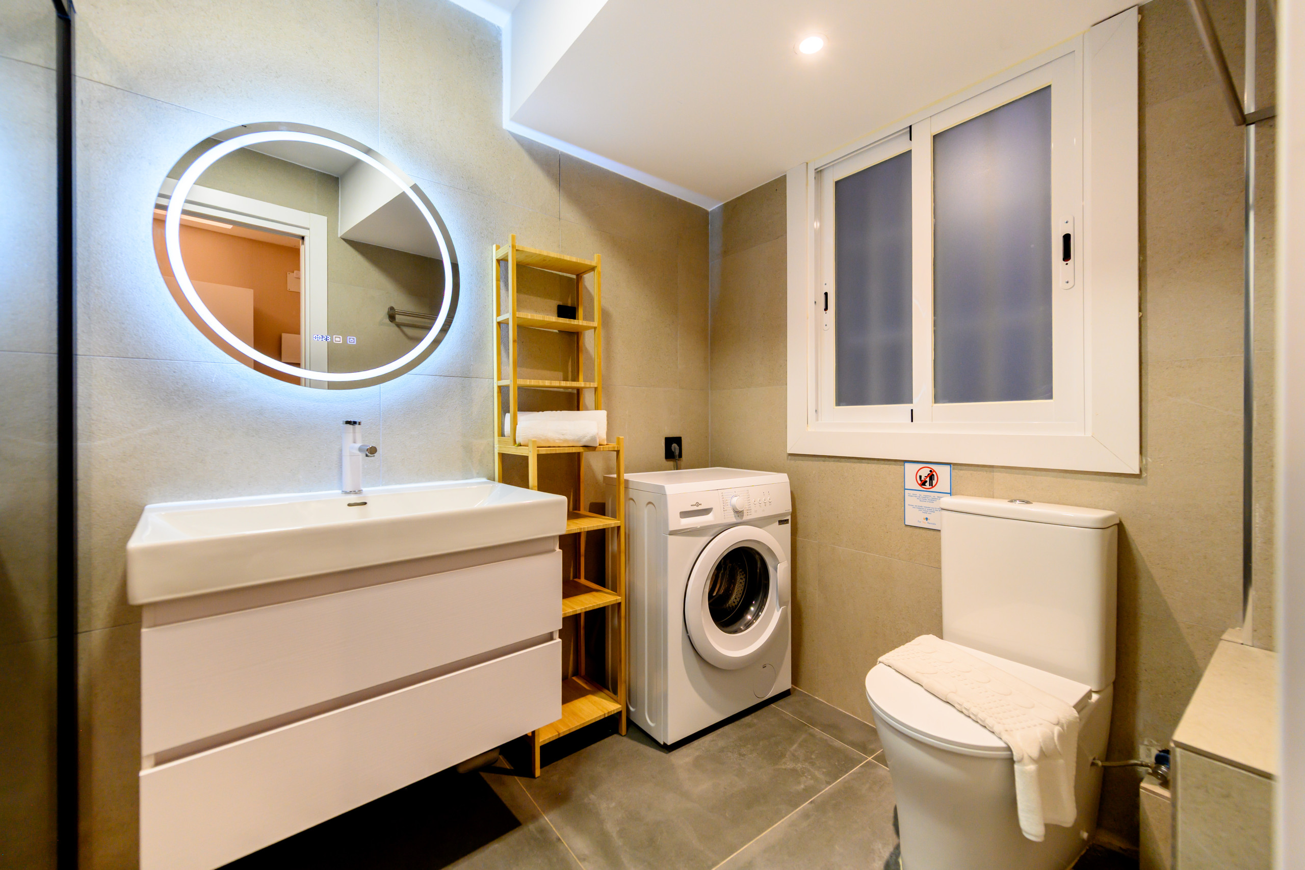 El estudio incluye un baño completo, con plato de ducha, mueble de lavabo y lavadora un diseño actual que aporta comodidad y funcionalidad.