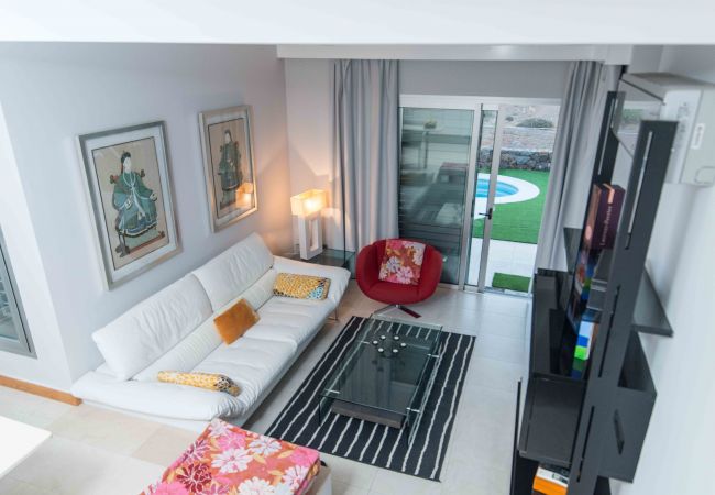 Villa privada con piscina y jardín independiente. La propiedad cuenta con dos dormitorios amplios y luminosos, dos cuartos de baño con ducha y bañera, salón cocina y una zona de jardín independiente donde se encuentra la piscina. Lavadora, tabla plancha, secador de pelo, aire acondicionado individual en cada una de las estancias, televisión de pantalla plana en el salón y el dormitorio principal, , reproductor blue ray, horno, microondas, menaje de cocina y electrodomésticos al completo, lavavajillas, plaza de aparcamiento, etc... Son solo parte del equipameinto que ofrece esta villa privada. Los materiales de primera calidad, la decoración, el equipamiento con todo lujo de detalles y la zona de piscina y solarium harán disfrutar al huésped de una estancia inolvidable. La localización es otro aspecto importante. Se encuentra situada en un complejo exclusivo residencial con seguridad privada en el Salobre donde se encuetra uno de los campos de Golf más importantes y conocidos de Gran Canaria. Esta zona está en el sur de la Isla entre Maspalomas y Arguineguin, lugar donde se disfruta del mejor clima de Gran Canaria. Temperatura media de más de 25º C y más de 300 días de sol al año. A poca distancia de la urbanización encontramos la autopista GC1 que nos permite desplazarnos a casi cualquier lugar de Gran Canaria, tanto las Playas de Maspalomas, Playa del Inglés, Amadores, Mogán como a los centros comerciales más importantes de la Isla o a la ciudad de Las Palmas, la capital más importante de Canarias, una ciudad cosmopolita con más de 500 años de Historia nunca deja indiferente a sus visitantes. La localización, el equipamiento, el clima privilegiado y su piscina independiente les hará disfrutar de unas vacaciones relajantes, cómodas y maravillosas. Bienvenidos a Villa Salobre!