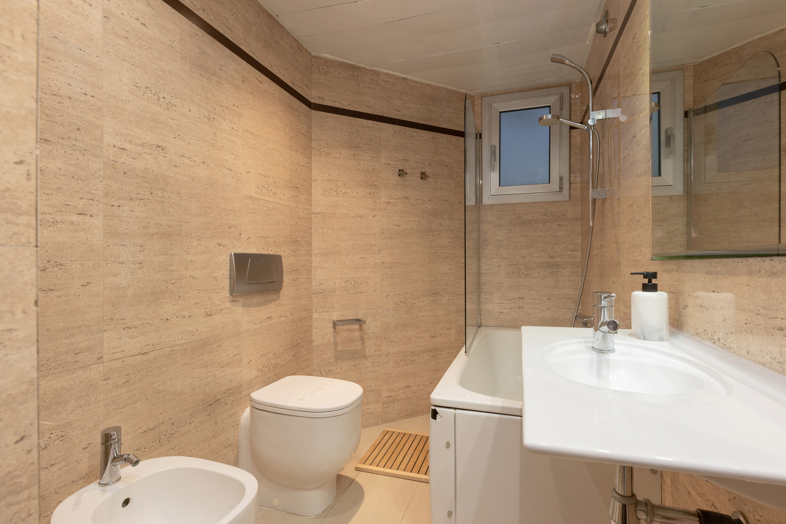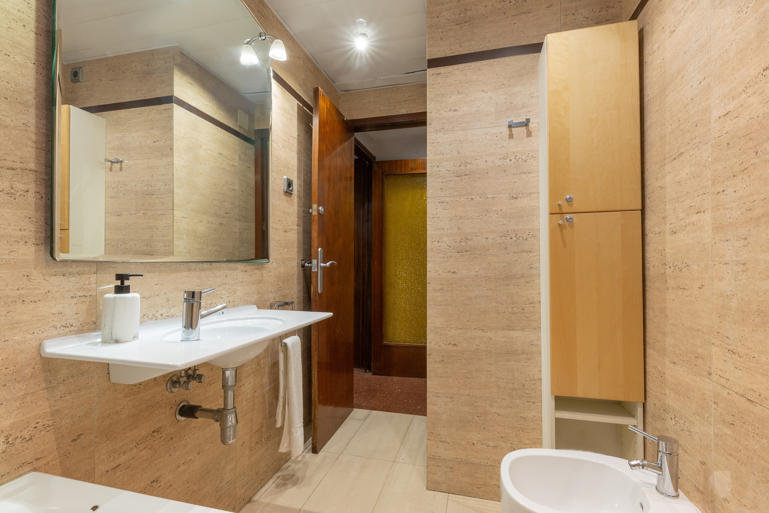 There is an independent kitchen and 2 full bathrooms. The apartment has air conditioning, heating, free WIFI, TV and balcony. The kitchen is fully equipped with appliances (fridge, coffee maker, dishwasher, toaster, kettle, ceramic hob, oven and microwave) and kitchen utensils. Towels, bed linen and hairdryer are included. There is a lift in the building and covered parking near the building.