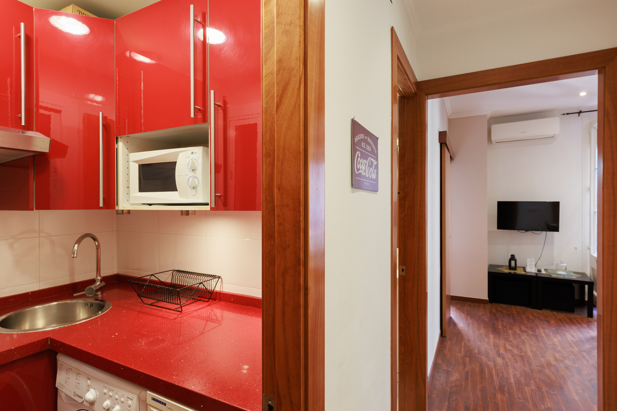 The apartment has 1 bedroom with 1 double bed and 2 bunk beds that are separated from the bed with a screen, a living room with a sofa bed (capacity up to 6 people), open-plan kitchen and 1 bathroom with shower. All rooms and areas of the apartment have air conditioning (cold/heat) and free high-speed WiFi. In addition, there is a flat-screen Smart TV with international channels and a safe. The kitchen is fully equipped with appliances (fridge, refrigerator, dishwasher, coffee machine, water boiler, induction hob, microwave, oven) and kitchen utensils. Towels, bed linen and hairdryer are included.
