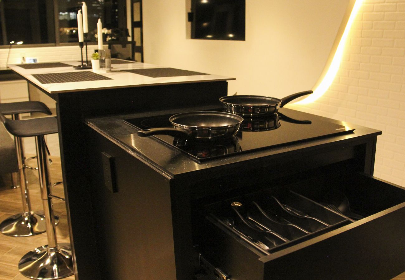 In the butane gas open plan kitchen, refrigerator, microwave, oven, freezer, dryer, dishwasher, dishes/cutlery, kitchen utensils, coffee machine, frying pan, toaster, kettle and juicer are provided.