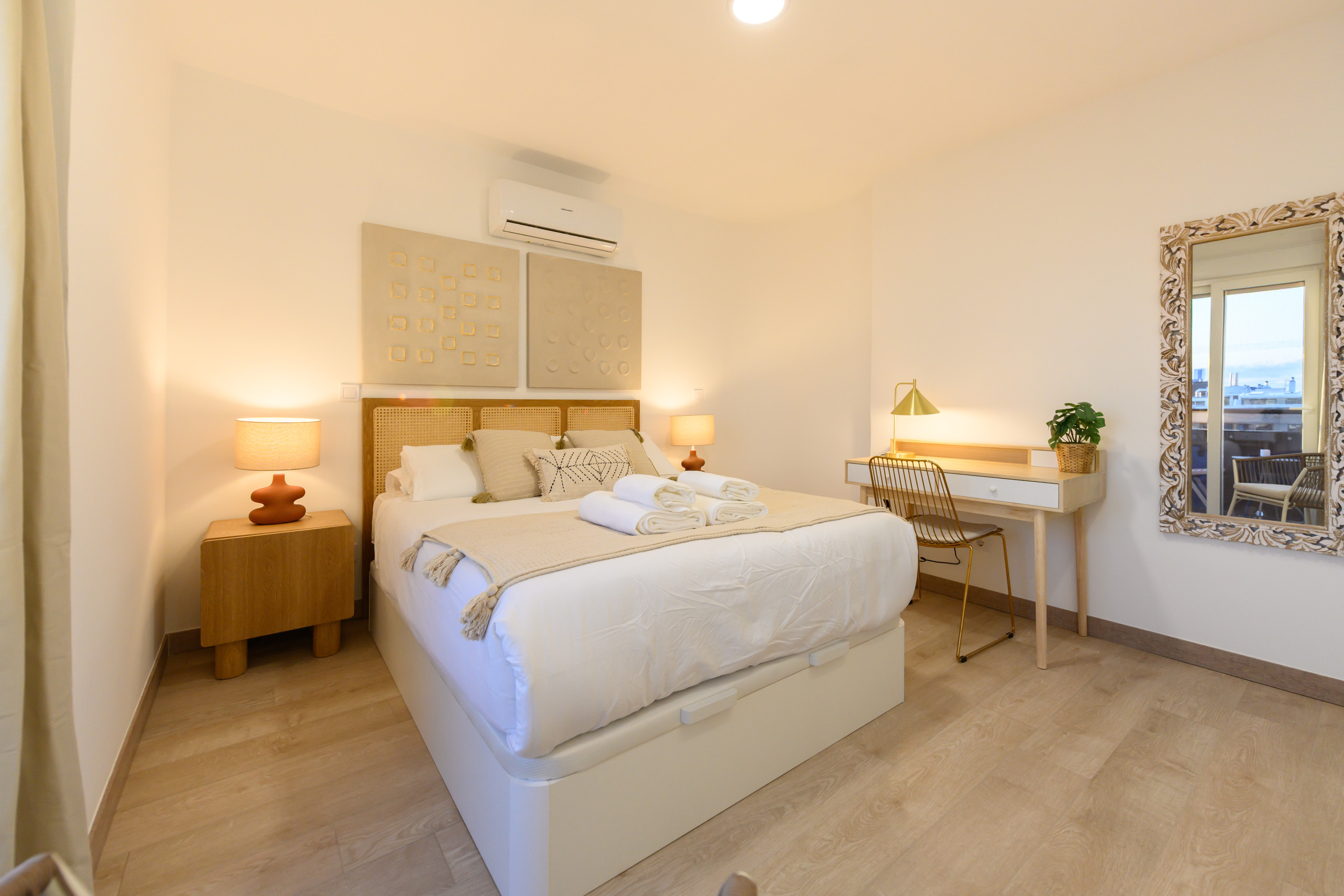 • Second bedroom with a double bed, desk, bedside tables, large built-in wardrobe, mirror, air conditioning, and a private terrace with a table and chairs, also offering beautiful city views. And inside, a full en-suite bathroom with toilet, shower, mirror, and storage space.