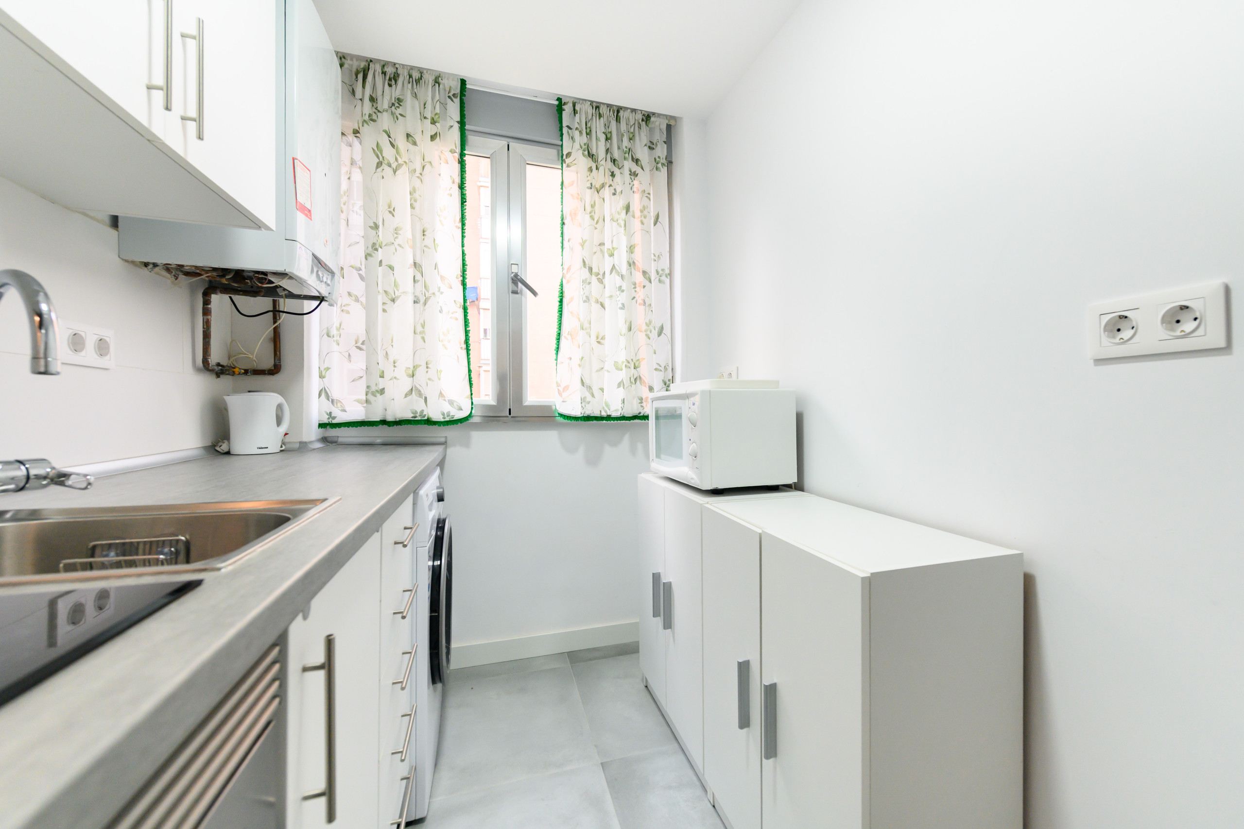 • Fully equipped kitchen: refrigerator, oven, microwave, storage space, washing machine, and kitchen utensils.