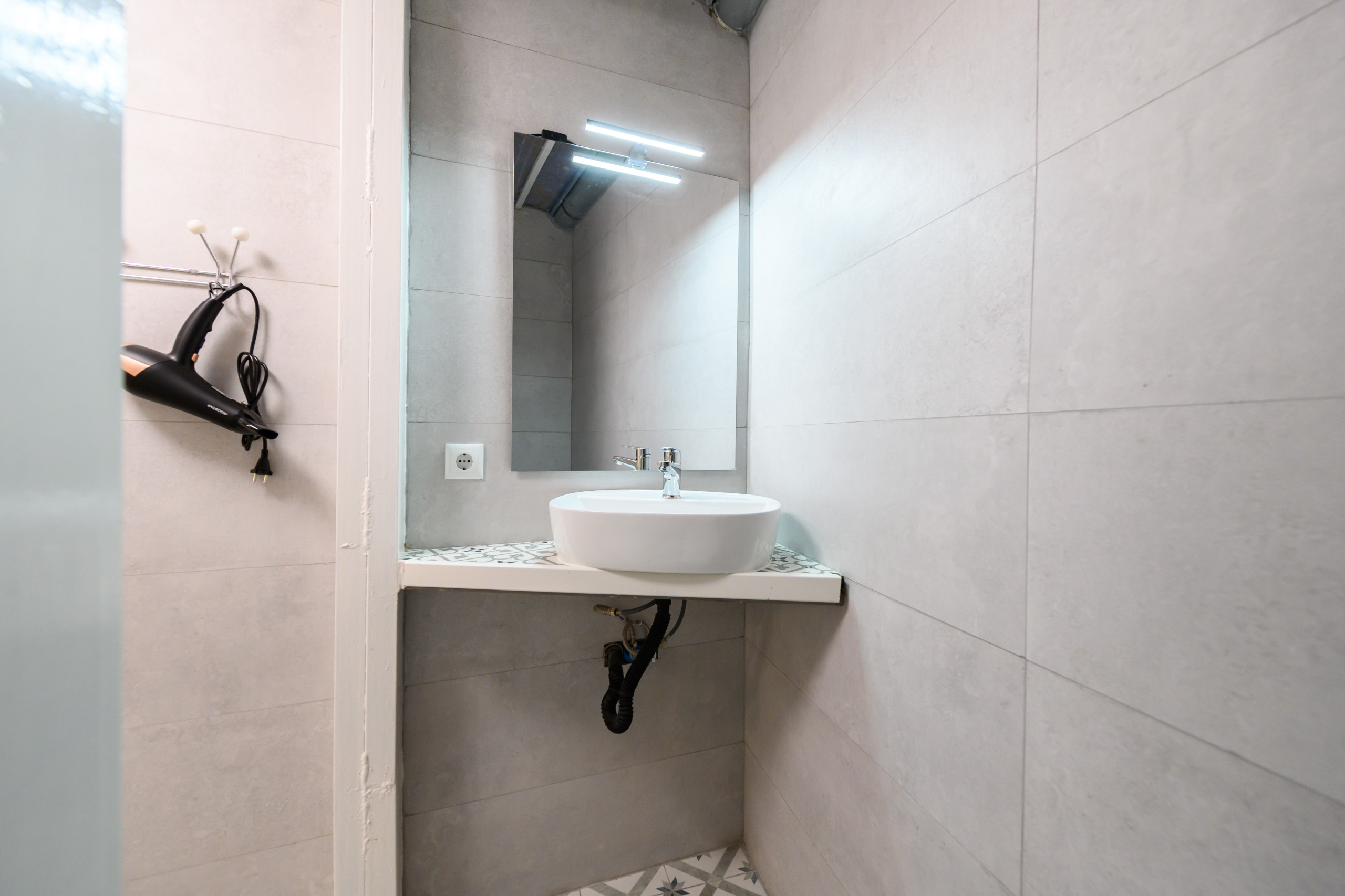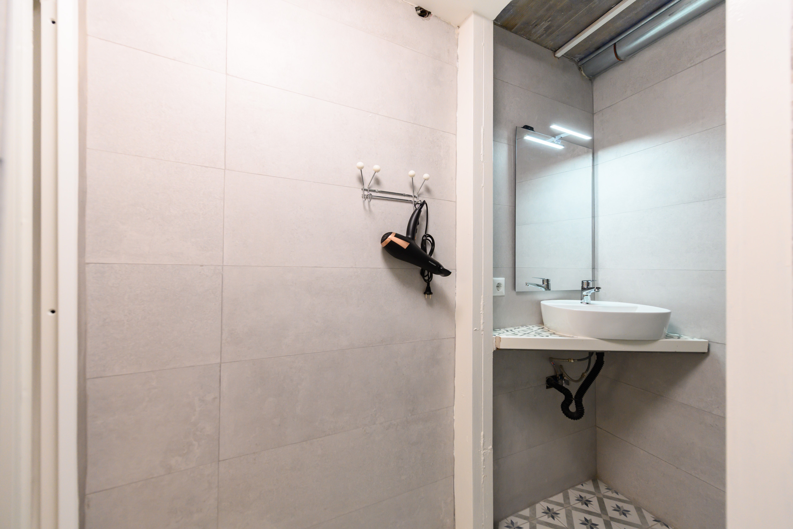 Functional bathroom with shower column with direct access to the bedroom.
