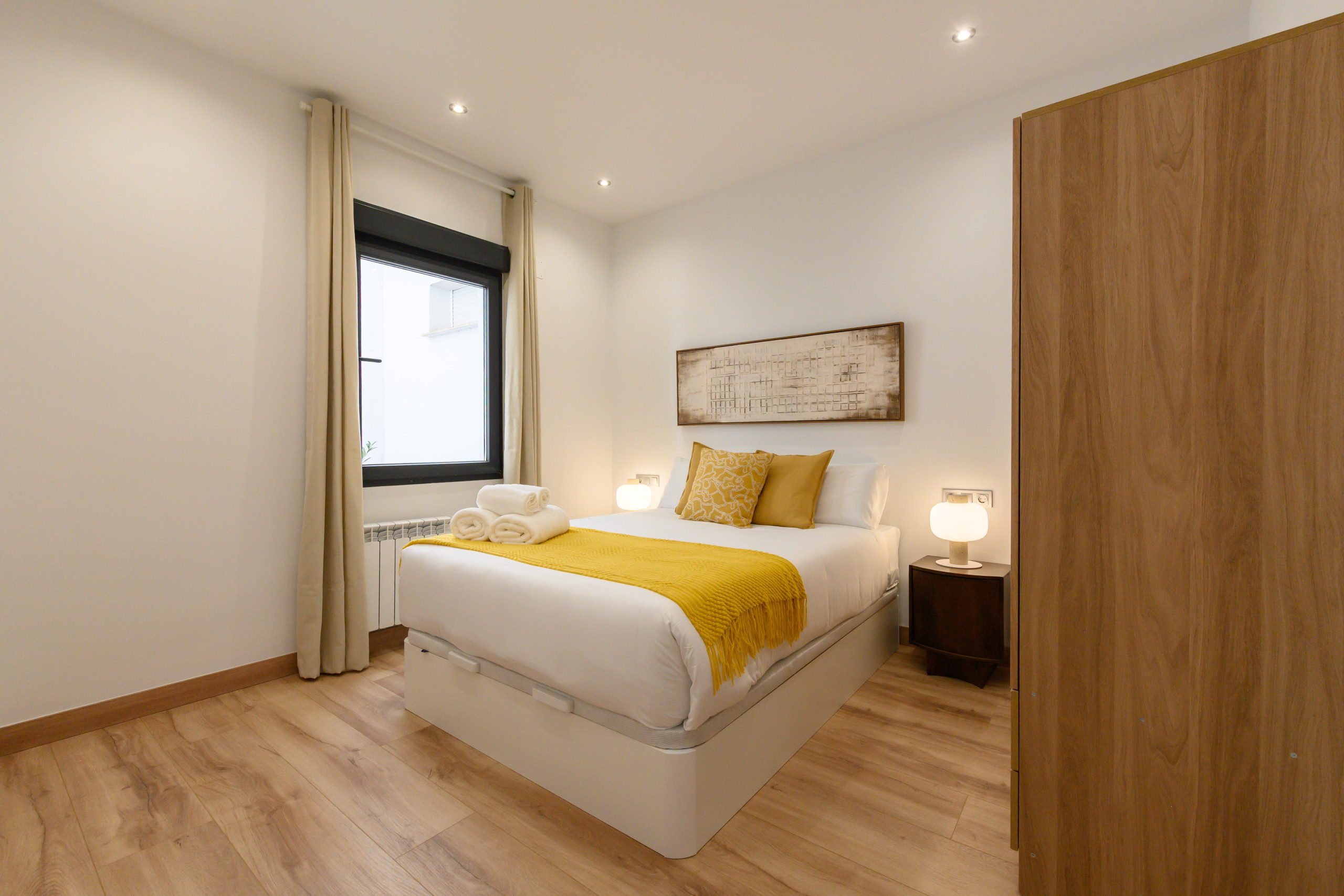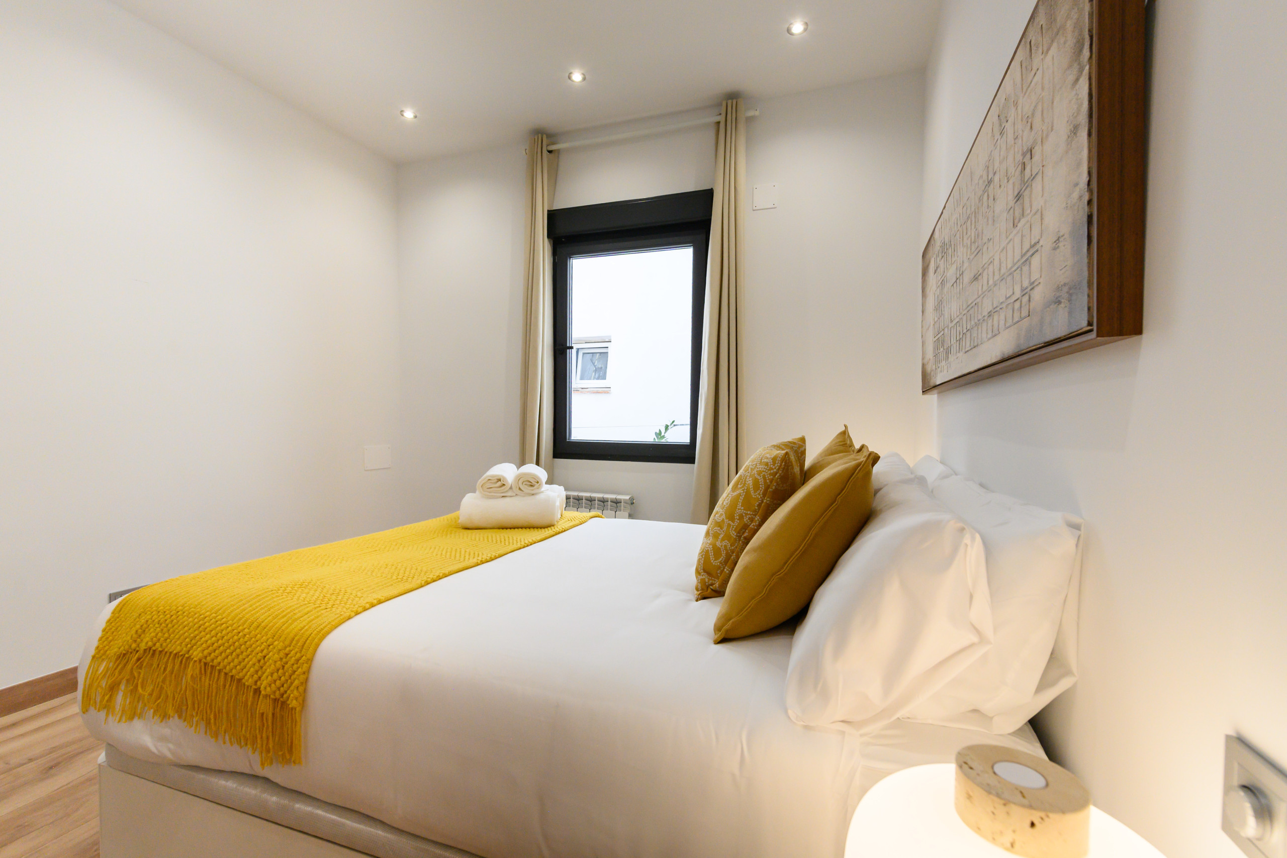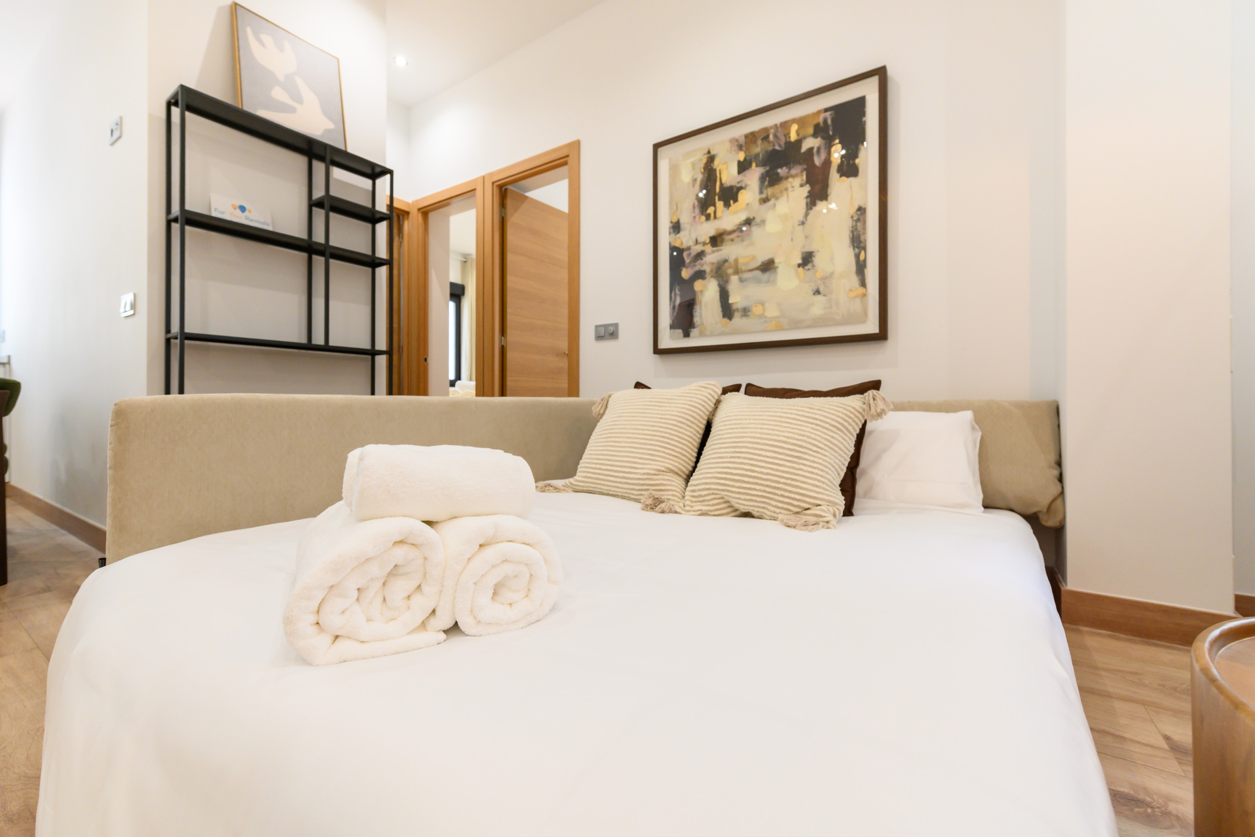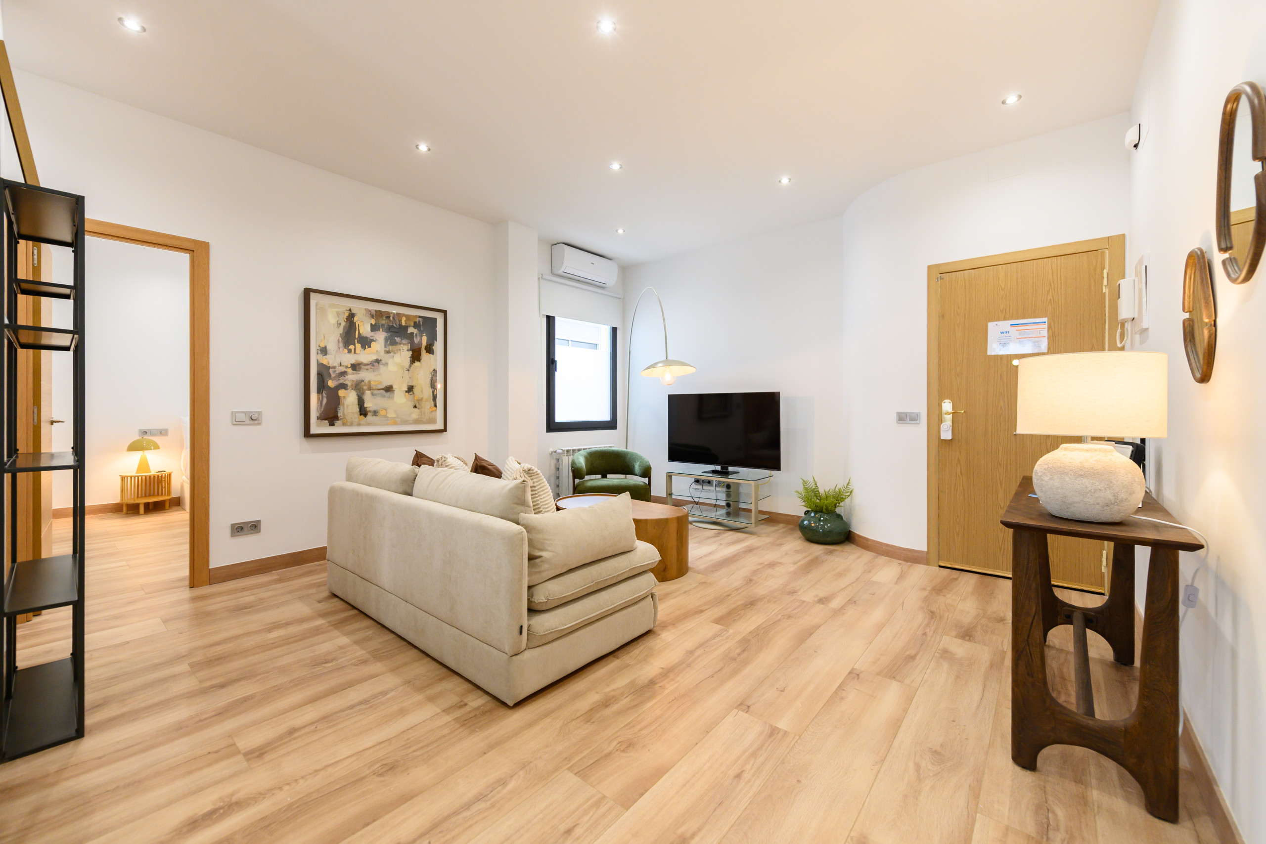 Temporary Rental Flat. This bright and cosy apartment has two spacious bedrooms, each equipped with a double bed and desk, perfect for resting or working comfortably. The living room is spacious and has a contemporary style. The sofa bed integrates perfectly into the space, offering a comfortable and practical solution when additional sleeping space is needed; it includes a balcony with views of the vibrant Santa Engracia street, allowing natural light to flood the space thanks to its exterior orientation. Additionally, the apartment has a comfortable dining room, ideal for enjoying your meals.