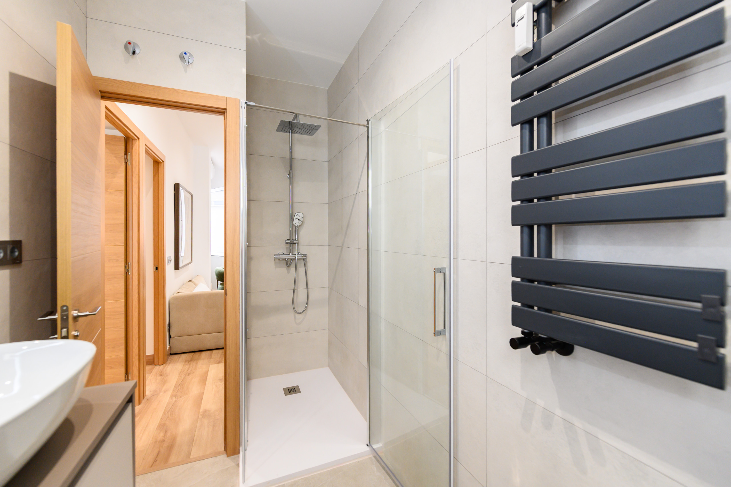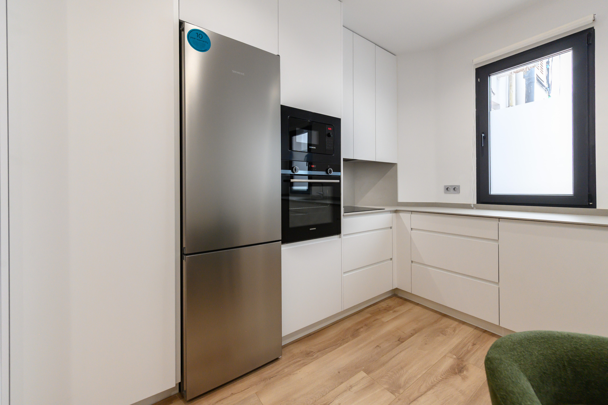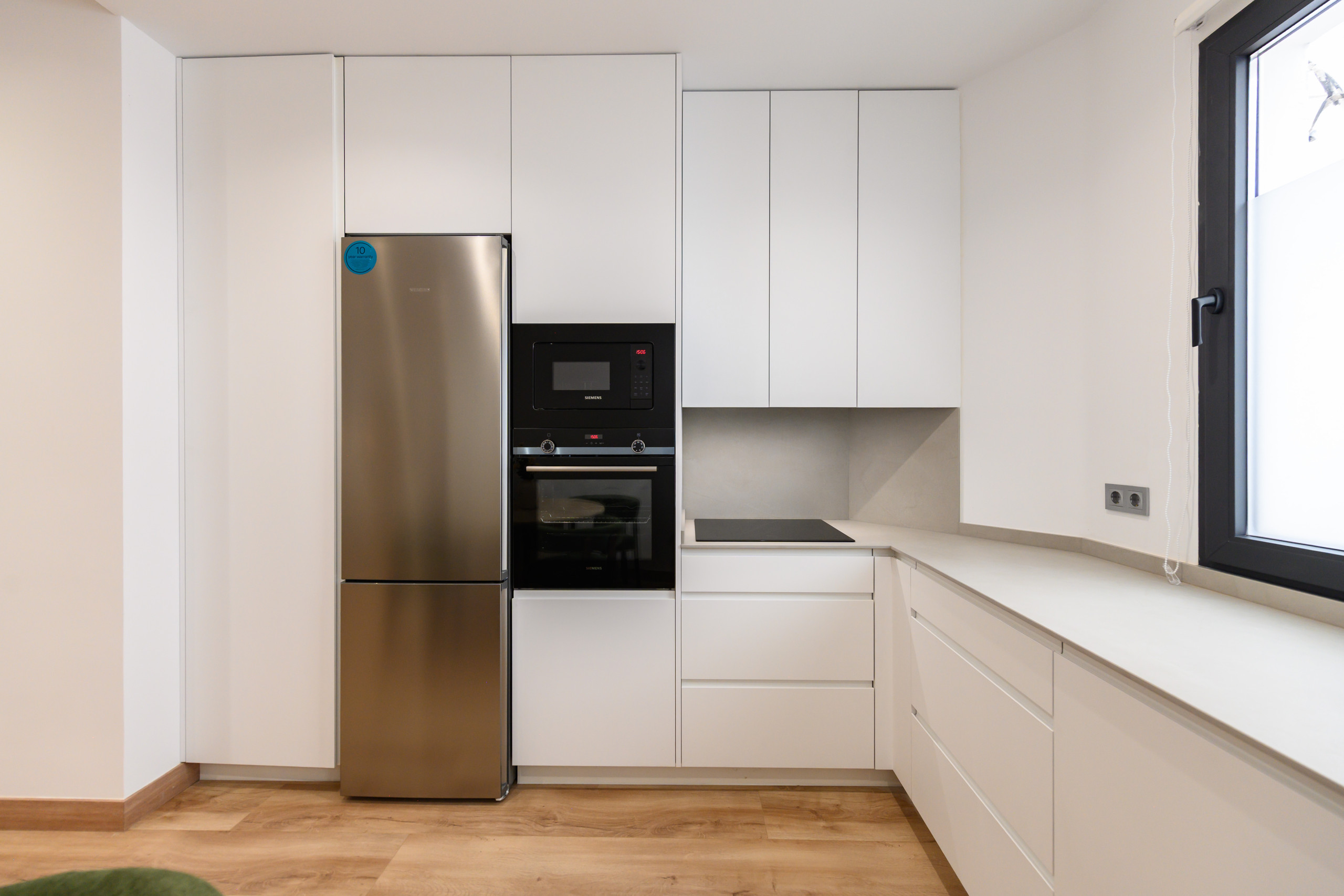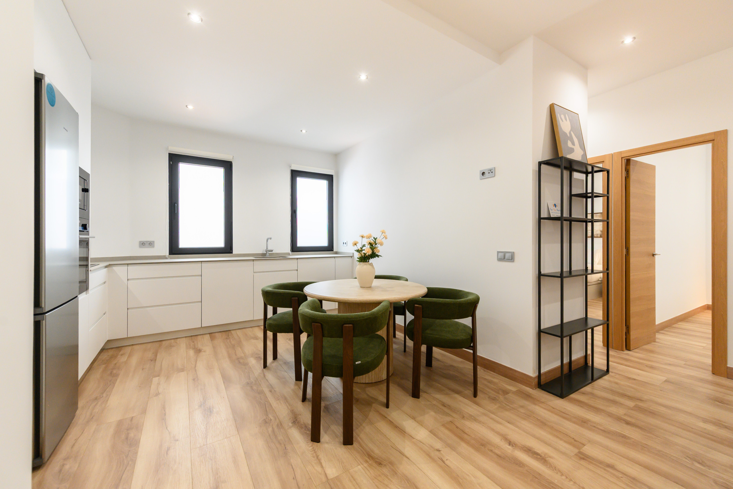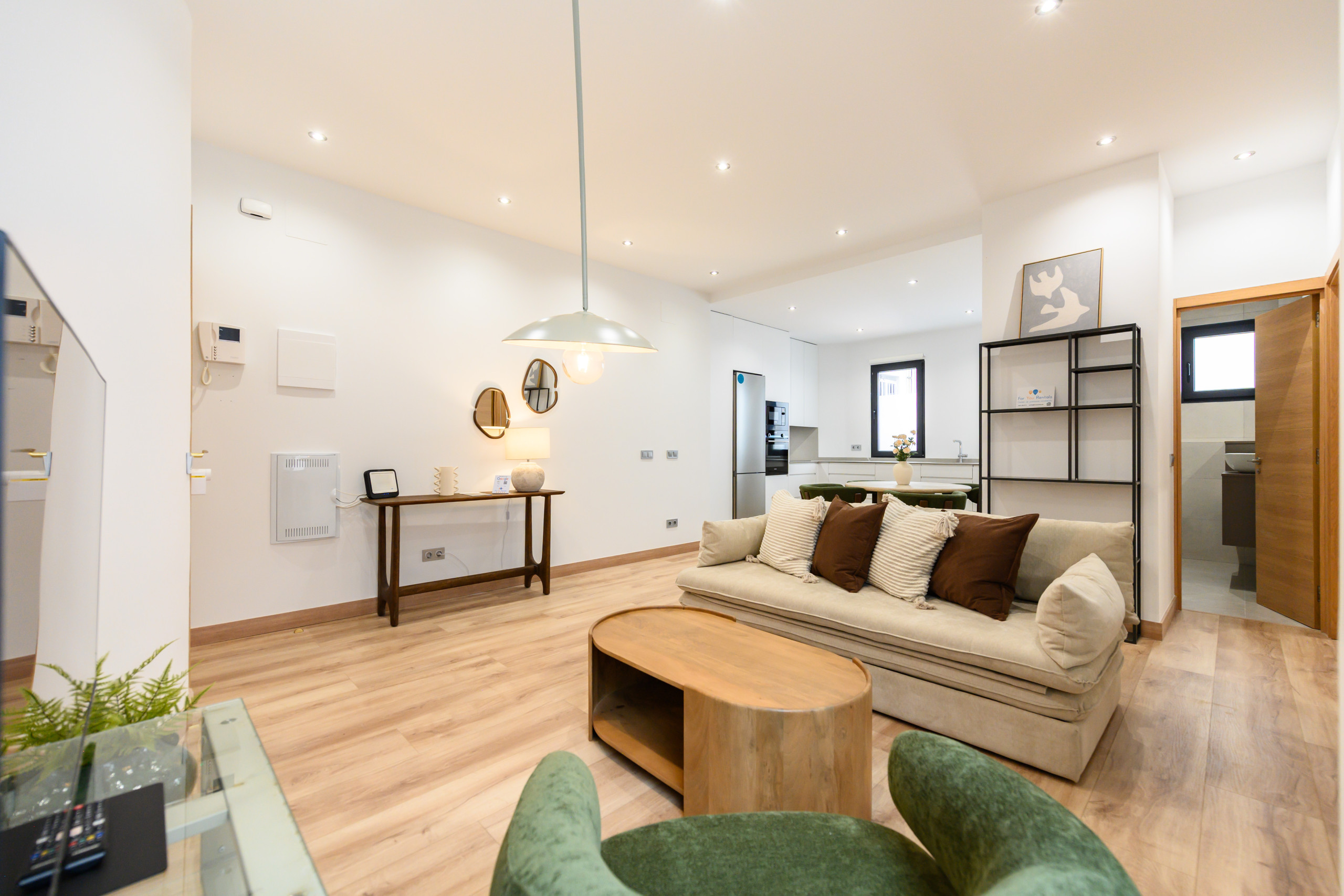 Temporary Rental Flat. This bright and cosy apartment has two spacious bedrooms, each equipped with a double bed and desk, perfect for resting or working comfortably. The living room is spacious and has a contemporary style. The sofa bed integrates perfectly into the space, offering a comfortable and practical solution when additional sleeping space is needed; it includes a balcony with views of the vibrant Santa Engracia street, allowing natural light to flood the space thanks to its exterior orientation. Additionally, the apartment has a comfortable dining room, ideal for enjoying your meals.