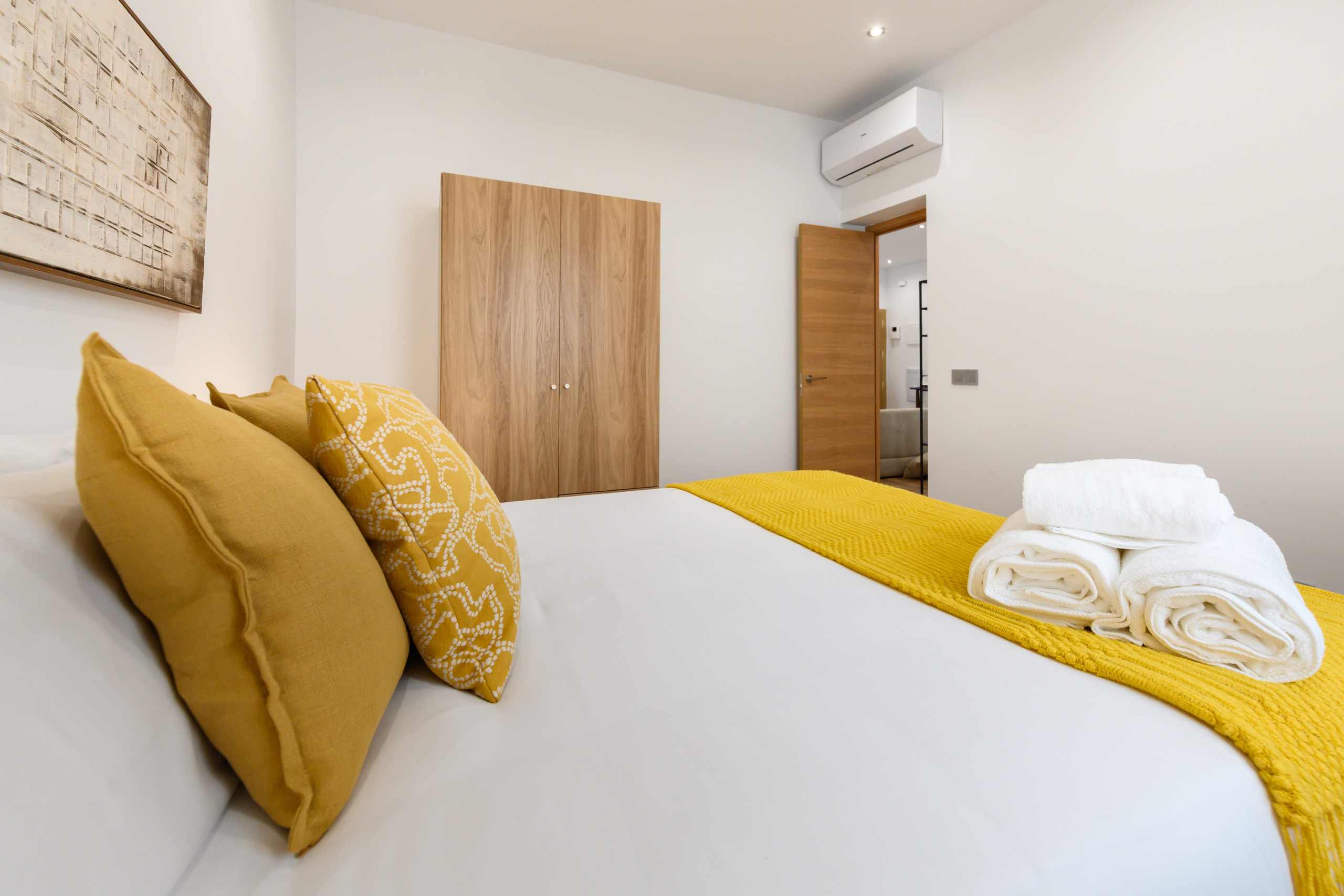 • Second bedroom, also with a double bed with storage underneath, bedside tables, clothes rack, air conditioning, and heating.