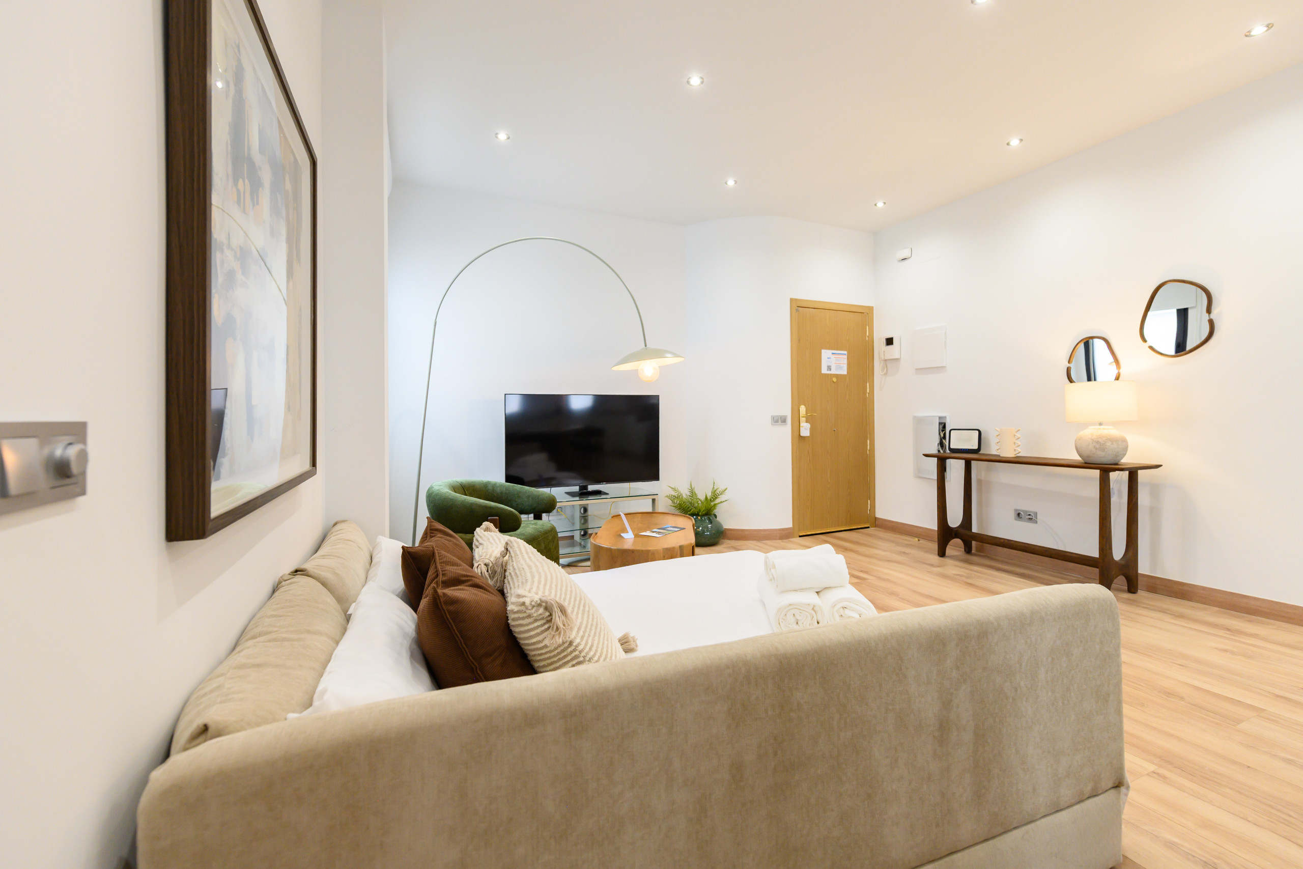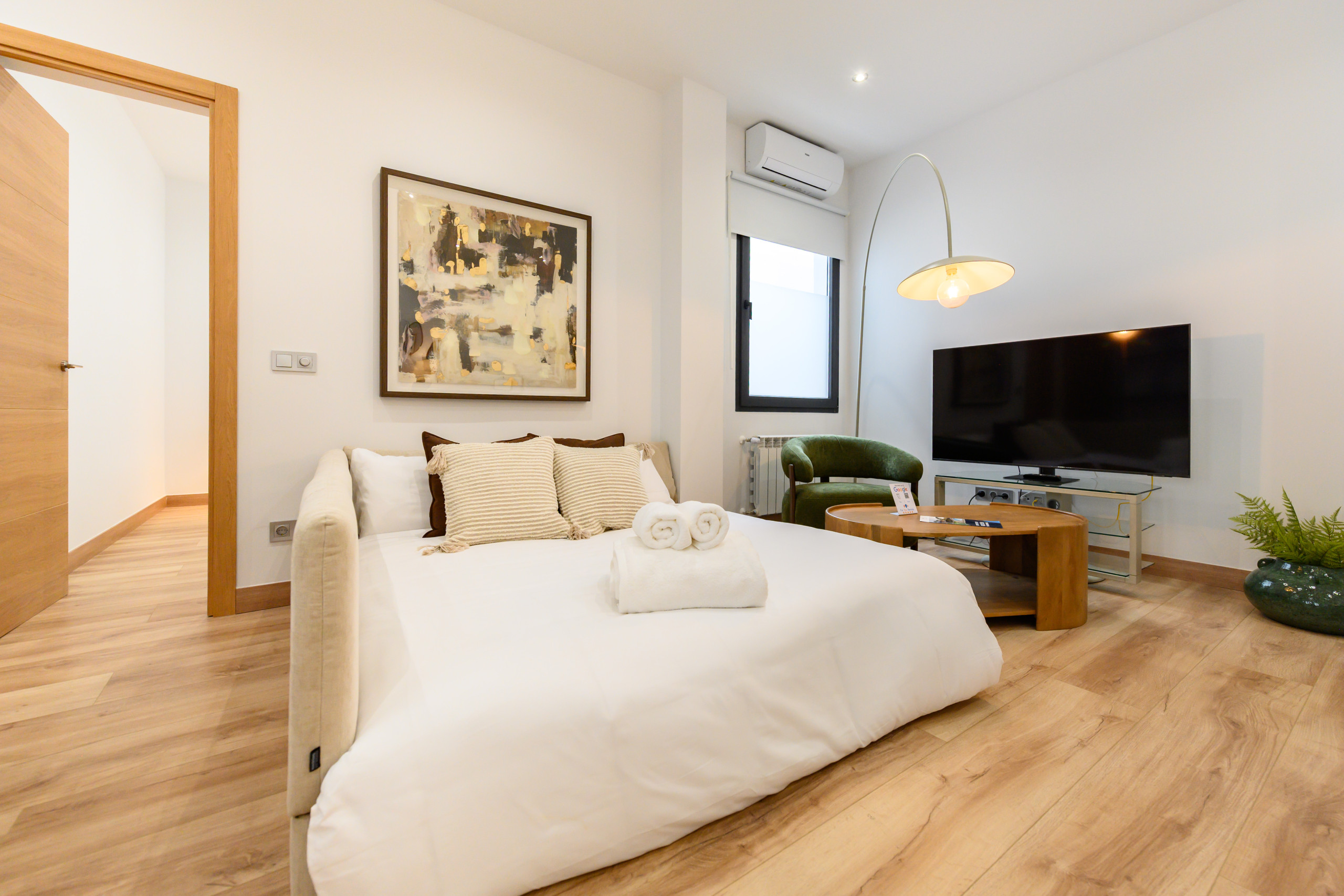 • Spacious and modern living room with a sofa bed, TV, air conditioning, and heating.