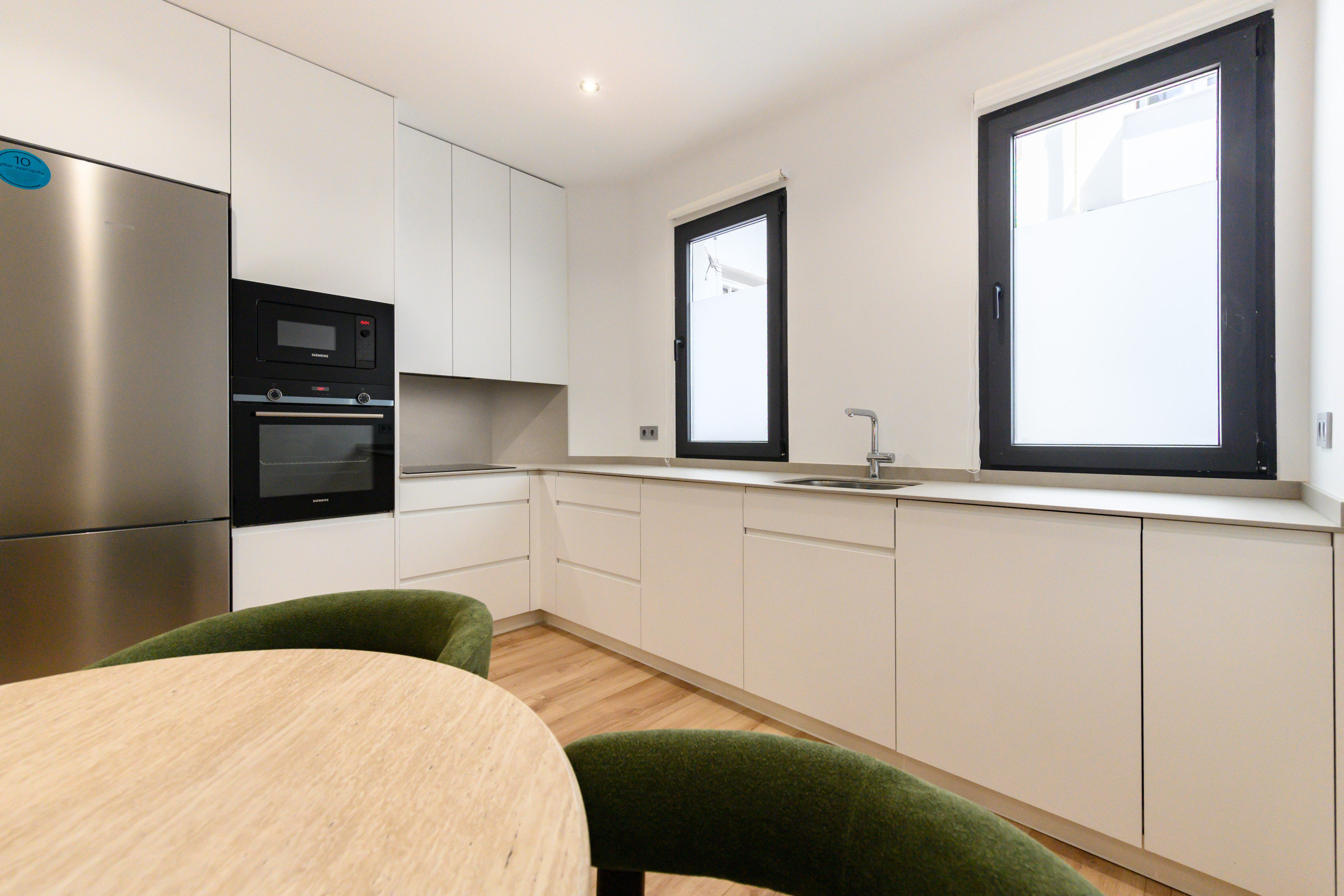 • Fully equipped kitchen with refrigerator, microwave, oven, dishwasher, washing machine, kitchenware, storage space, and a dining table.