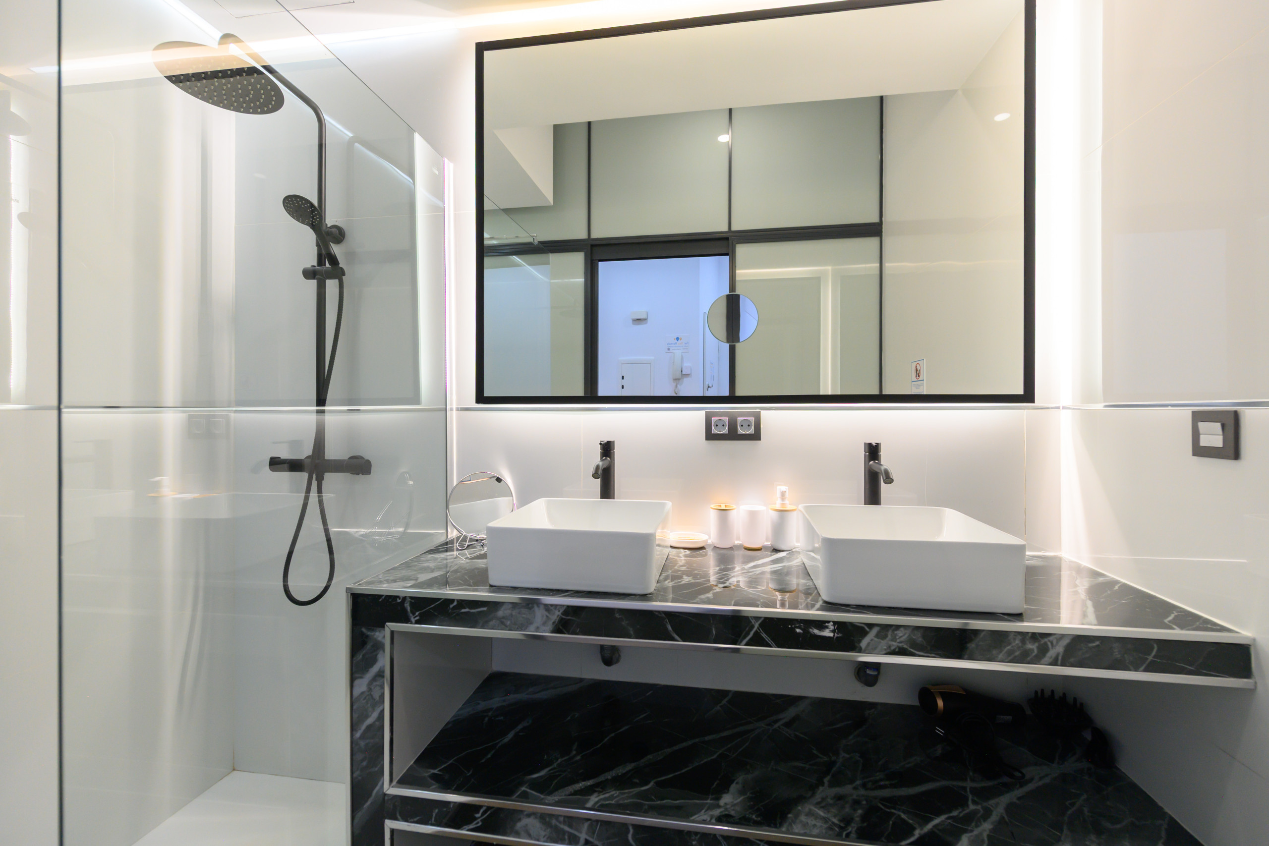 The flat has two full bathrooms, both equipped with shower tray, modern and functional, designed for greater day-to-day comfort.