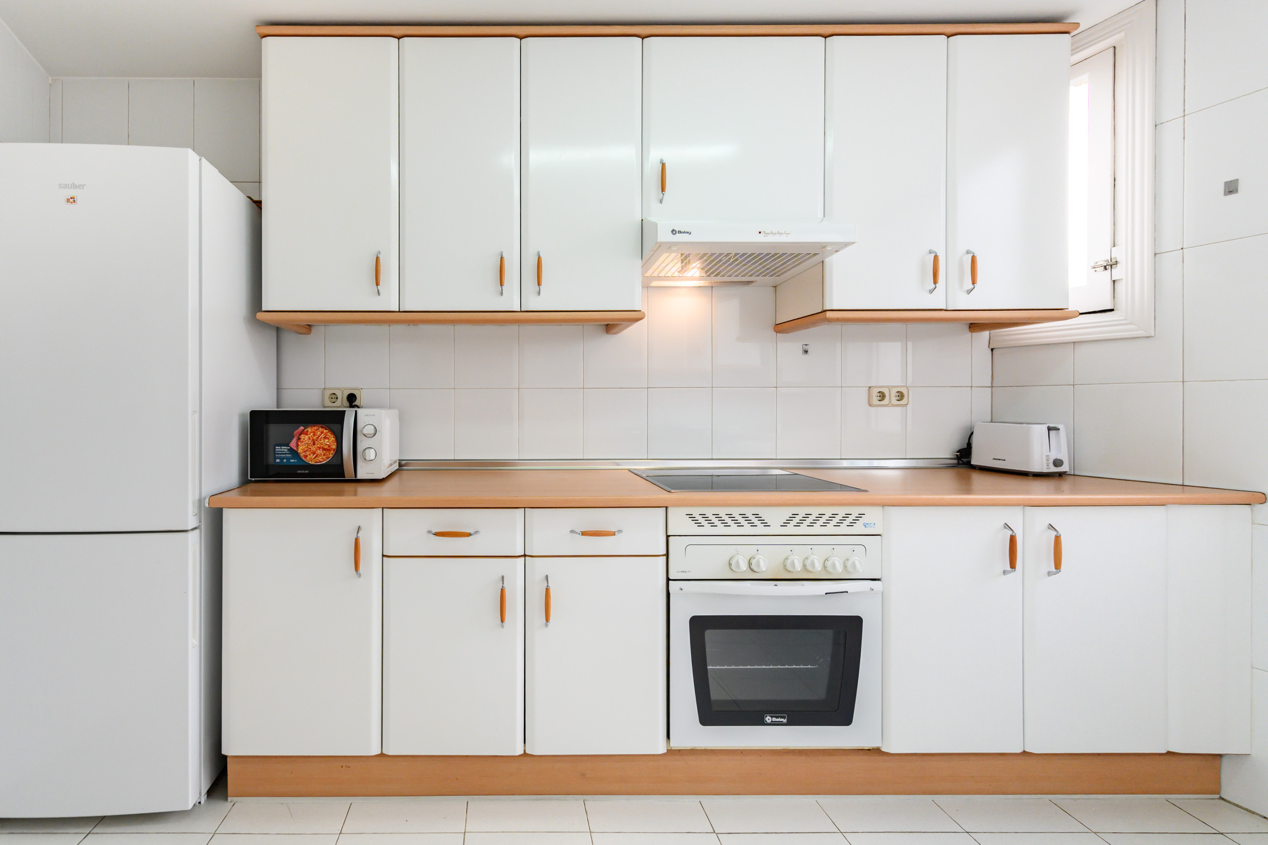 The kitchen is fully equipped, including a fridge, microwave, oven, induction hob, and kettle, ideal for preparing meals just like at home.