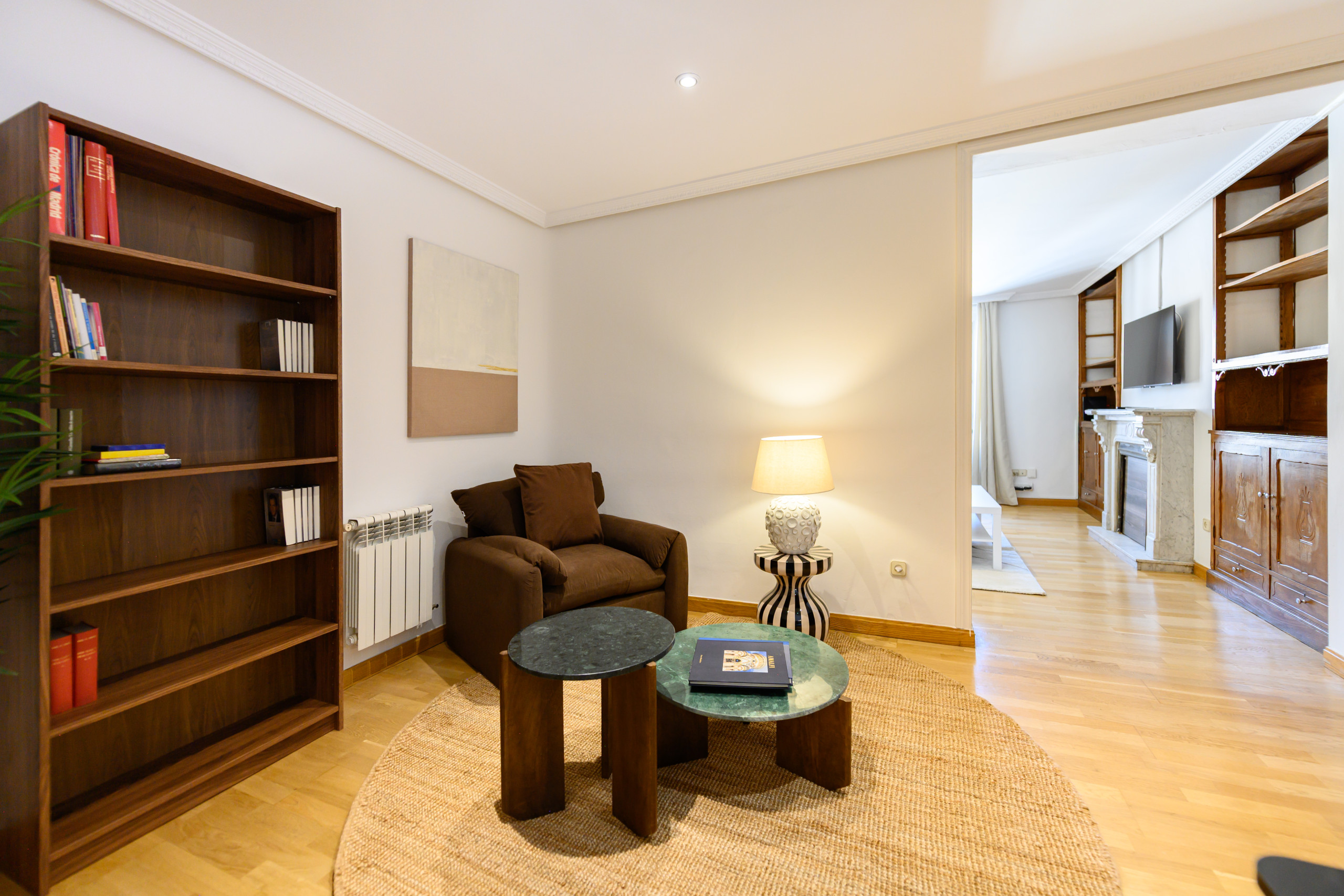 - Second living room, equipped with an armchair, table, storage space, and desk, ideal as a work or reading area.